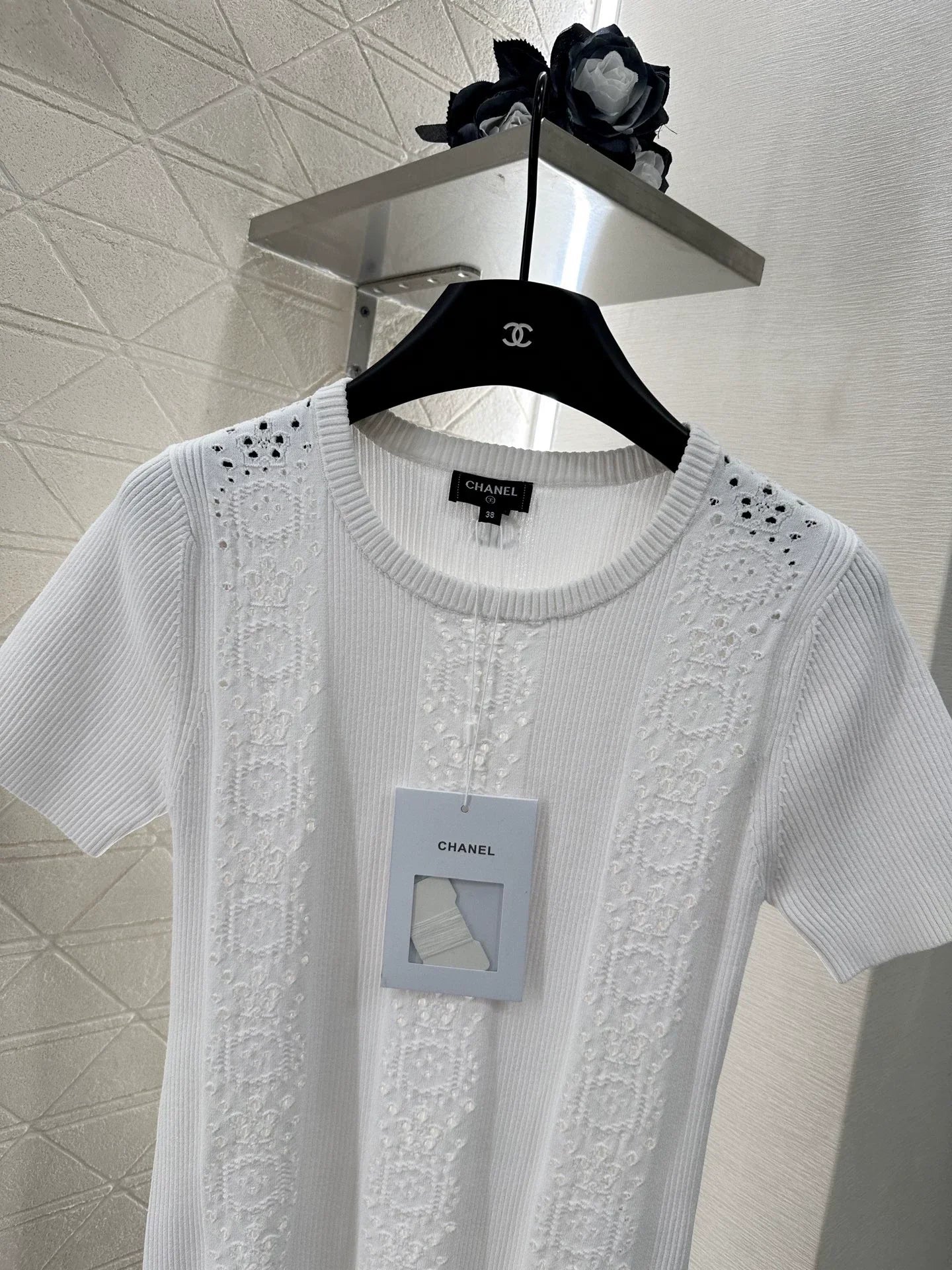 Imported yarn weaving with delicate and comfortable texture, stylish round neck knitted short sleeved cut, large body vertically arranged with hollowed out patterns embellishing the vertical grooves on both sides of the sleeves, thread tight and slimming, outlining curves, three-dimensional cutting to enhance texture and increase brand style