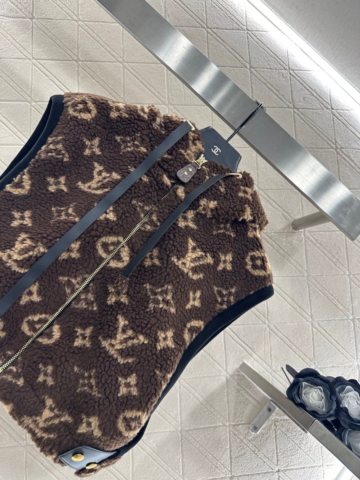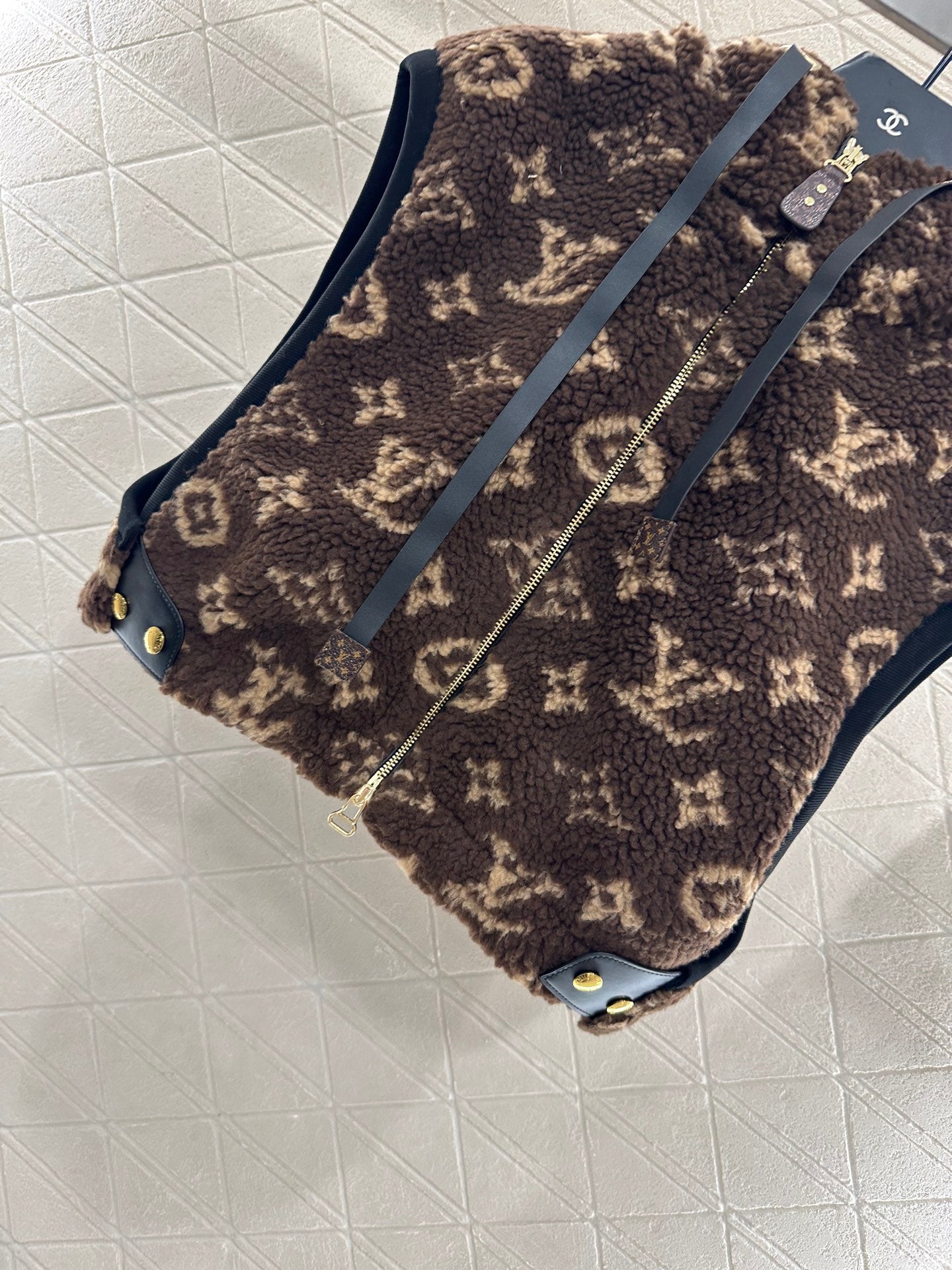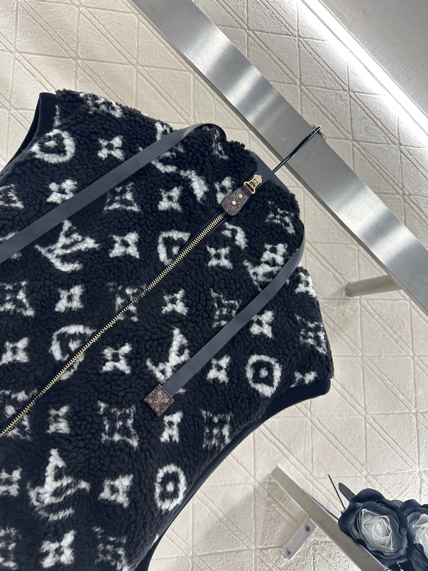 Made of fleece material, the texture is noticeably soft and skin friendly, adding a touch of fashion and color. The hooded zipper vest is designed with a large body of Teddy cashmere wool printed with four leaf clover elements and letter logos, highlighting the brand's low-key luxury tone. The zipper is adjustable with slit design, and the iconic leather buckles on both sides of the waist are fixed with a fashionable style, making it easy to handle both daily travel and leisure time.