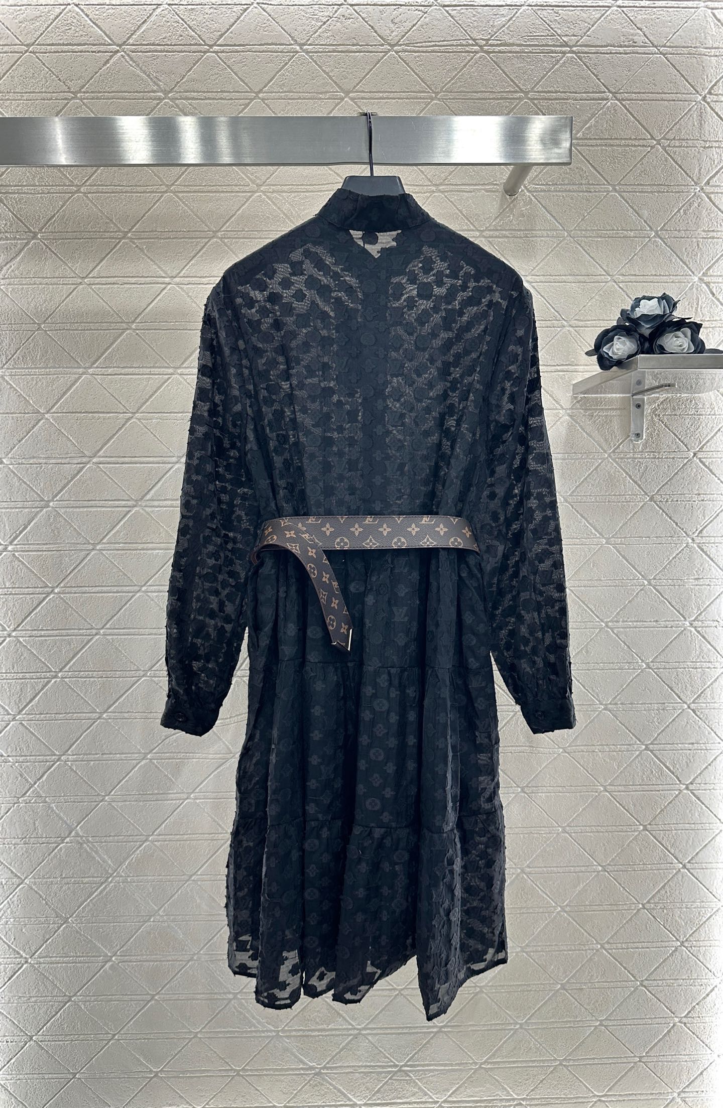 Jacquard cotton material with comfortable and delicate texture, long sleeved waist cinching dress with neat cutting and slim fit, button open waistband, vertical cutting for waist cinching effect, layered cake swing, agile and elegant, combined with an old flower waistband to highlight the proportion advantage of short upper and long lower waistline lines. The whole body is covered with four leaf clover elements and letter jacquard patterns to highlight the brand's exquisite sense
