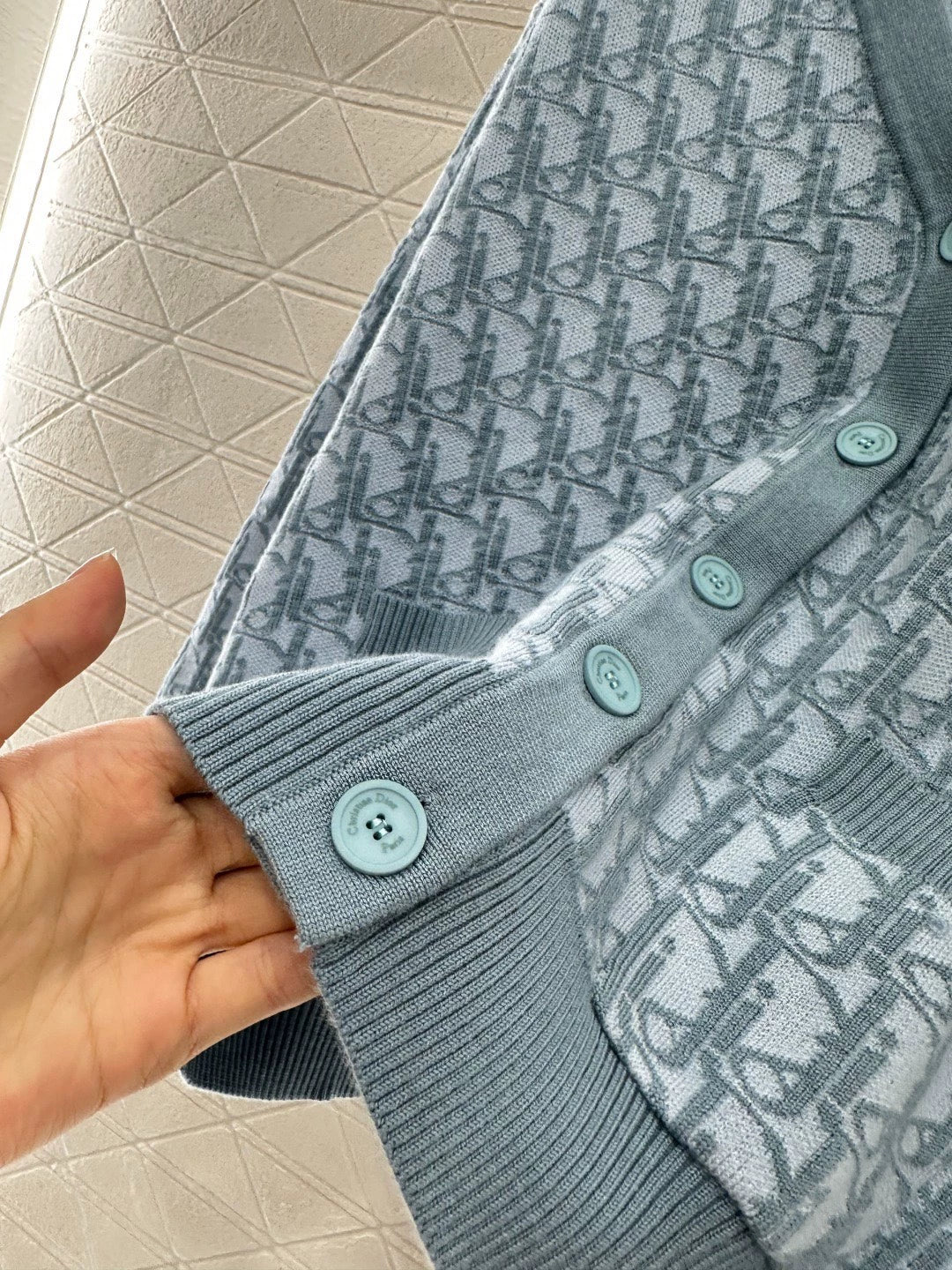 Wearing a stylish V-neck knitted cardigan, the finished garment features a solid color scheme with vertical stripes, threaded edges, and a narrowed overall design. The overall look is high-end and crisp, with a large body and full body letter jacquard embellishment. The overall collision creates a retro and versatile creative spark, creating a unique elegant vintage style for the brand