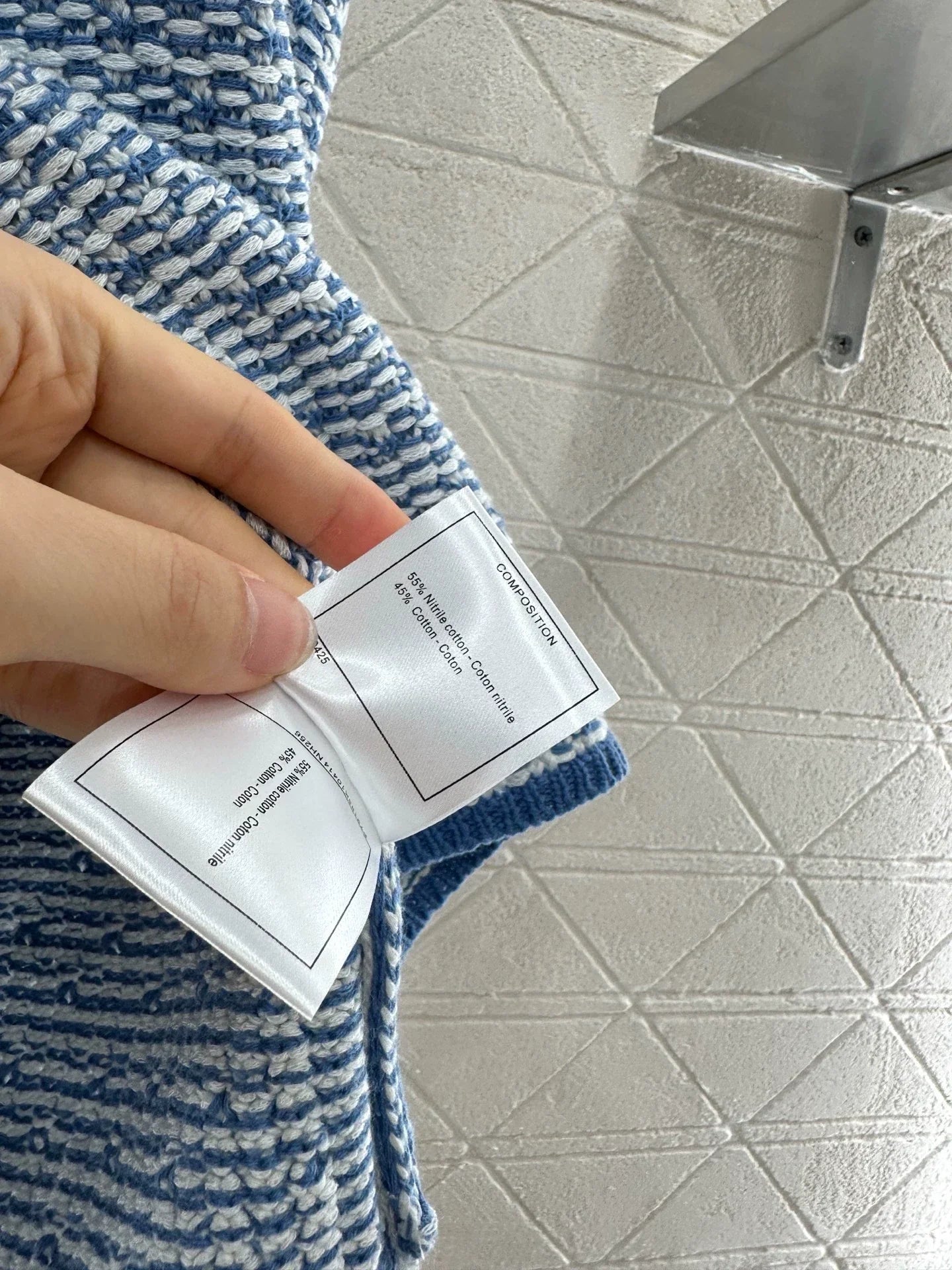 with a high-quality and comfortable texture. Available in blue, white, and black and white, with a three-dimensional pearl buckle on the front that highlights the elegant Chinese style. The hem is decorated with contrasting colored edges, enriching the design hierarchy. Combined with the chest flocking process, it forms a double C style, echoing the brand's style