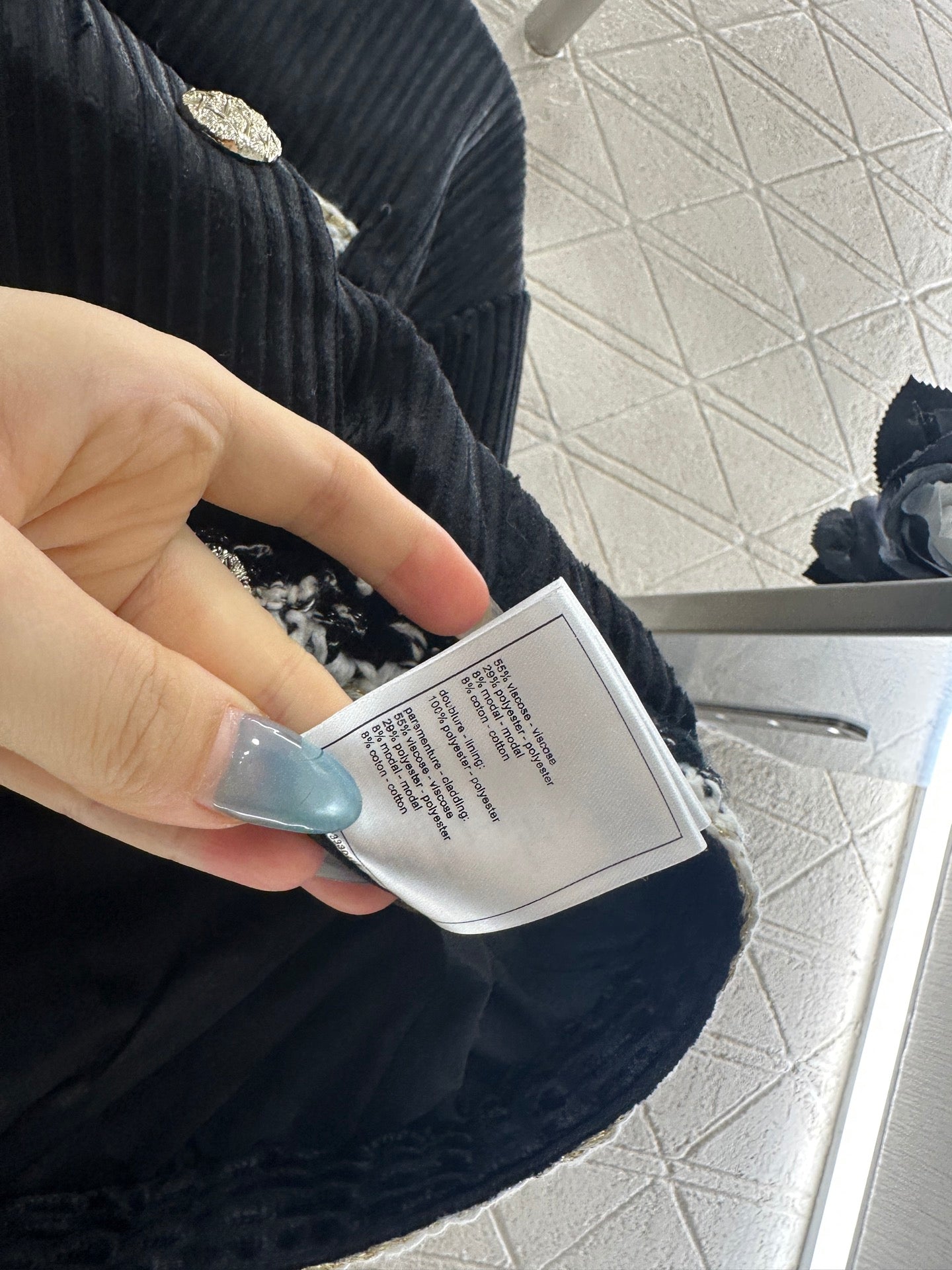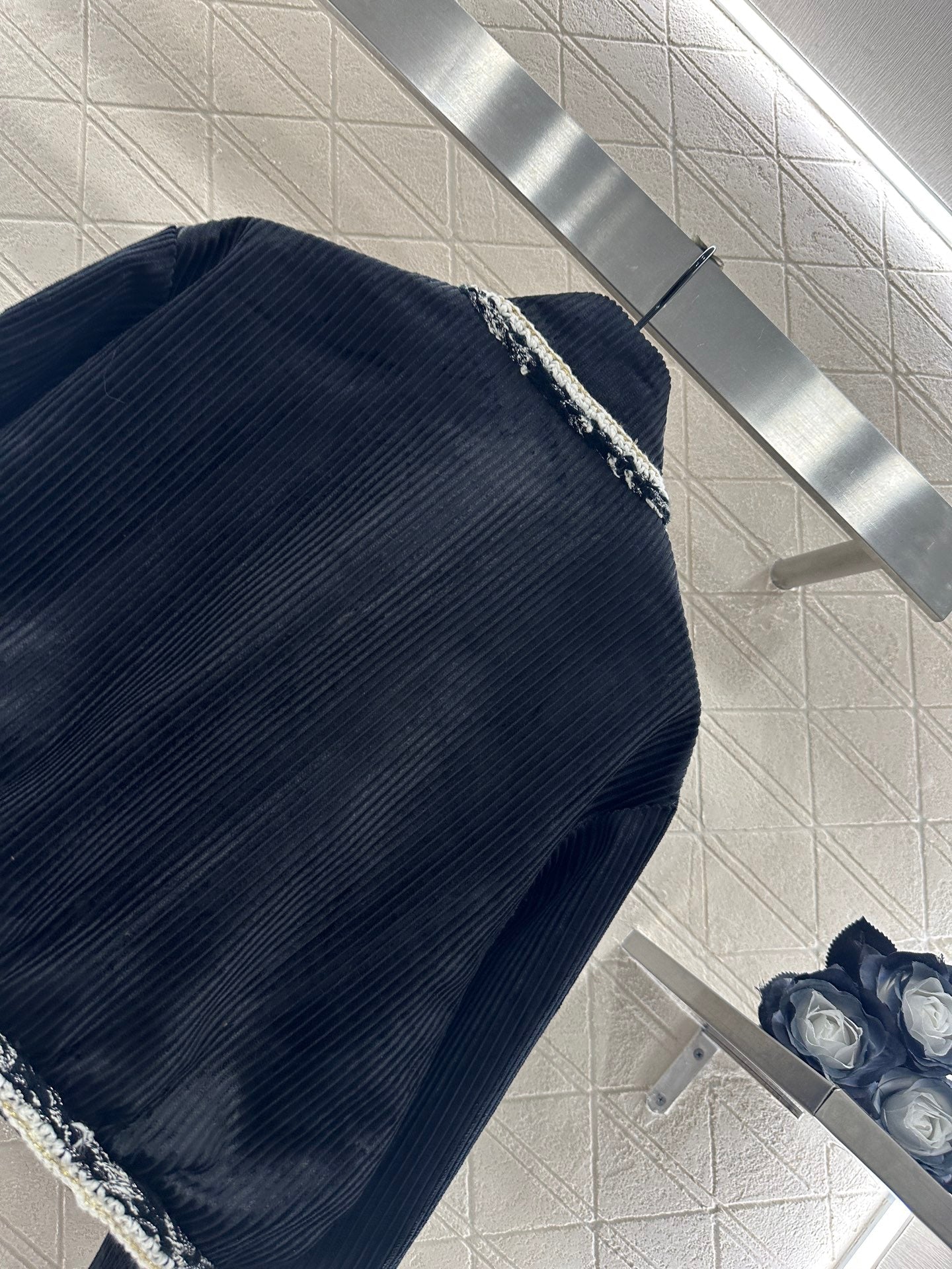 Customized YB imported corduroy material with fine texture and high quality. The whole body is edged with woven black and white contrasting three-dimensional binding to add layering to the shape and highlight the design. The open pattern plaid round buckle is adjusted with the dark pattern jacquard lining to highlight the brand tone, showing luxury and highlighting the taste of celebrities. The fabric and accessories are developed. The stand-up collar and straight shoulder jacket are tailored for fashionable and elegant wear.