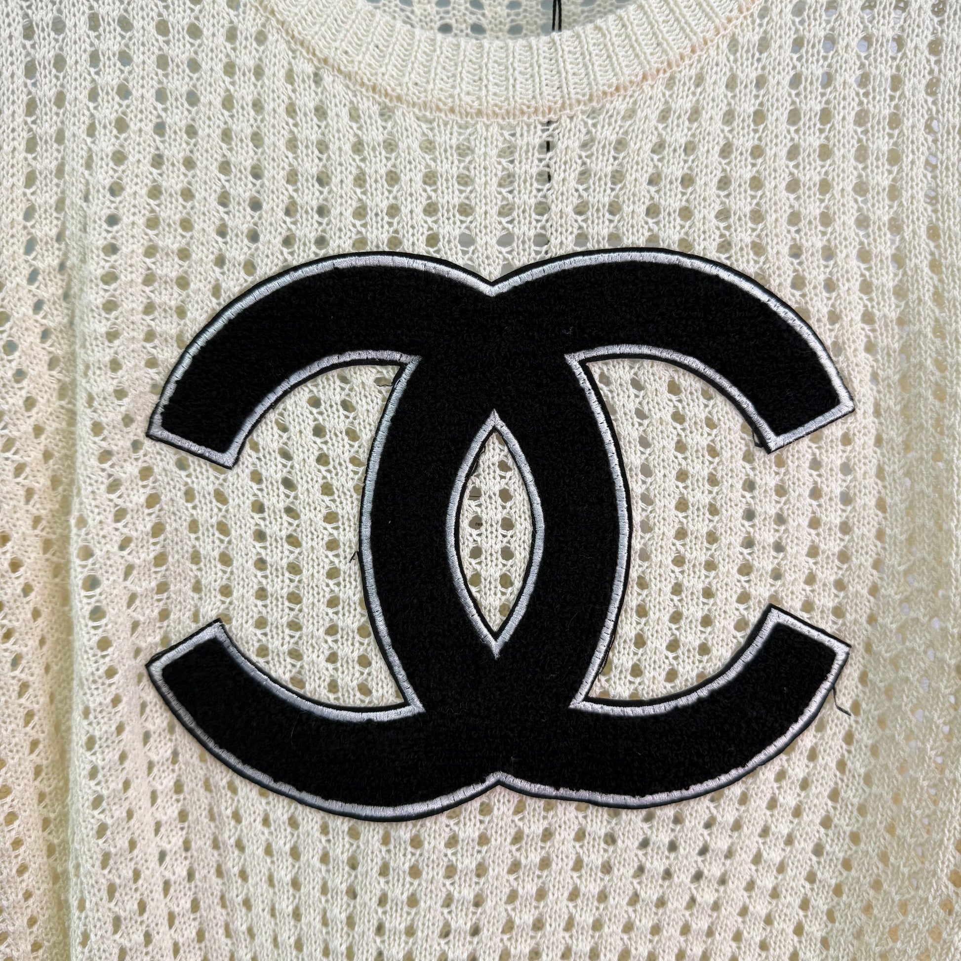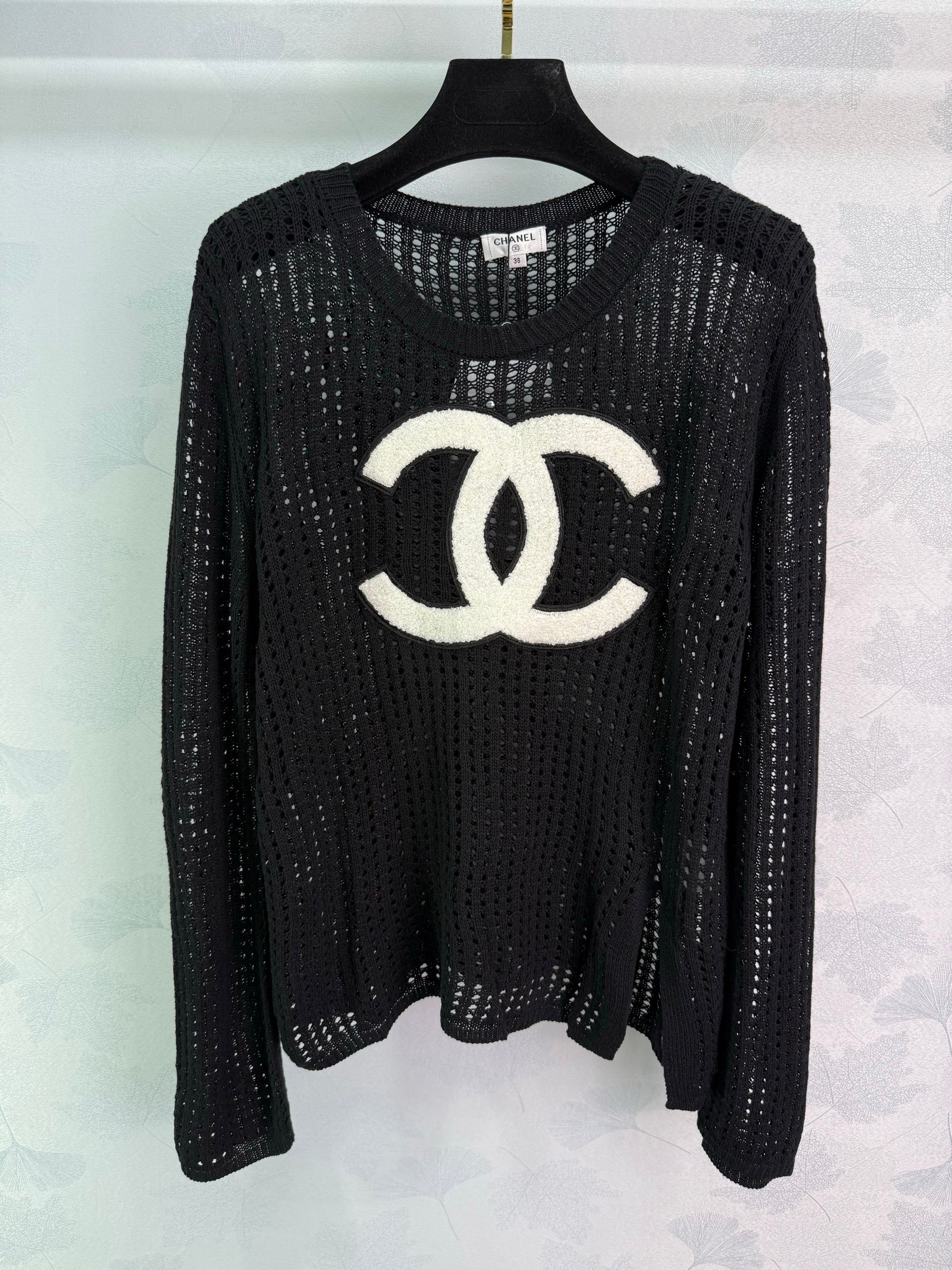 Custom wool yarn weaving, high-quality and comfortable texture, round neck pullover knitted cardigan cut, loose version to show lazy and relaxed posture, all-over hollow mesh wide band is fashionable and individual, the iconic double C letter logo pattern is decorated on the chest to show the brand personality and highlight the high-end sense of wear. The looming texture and slimming design make the simple style look more individual and refined, showing the relaxed tone of wear, light luxury and fashionable temperament, can be worn alone or layered, the first choice for fashion wear in all seasons!