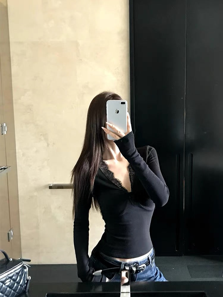 25fw new lace splicing V-neck long sleeves