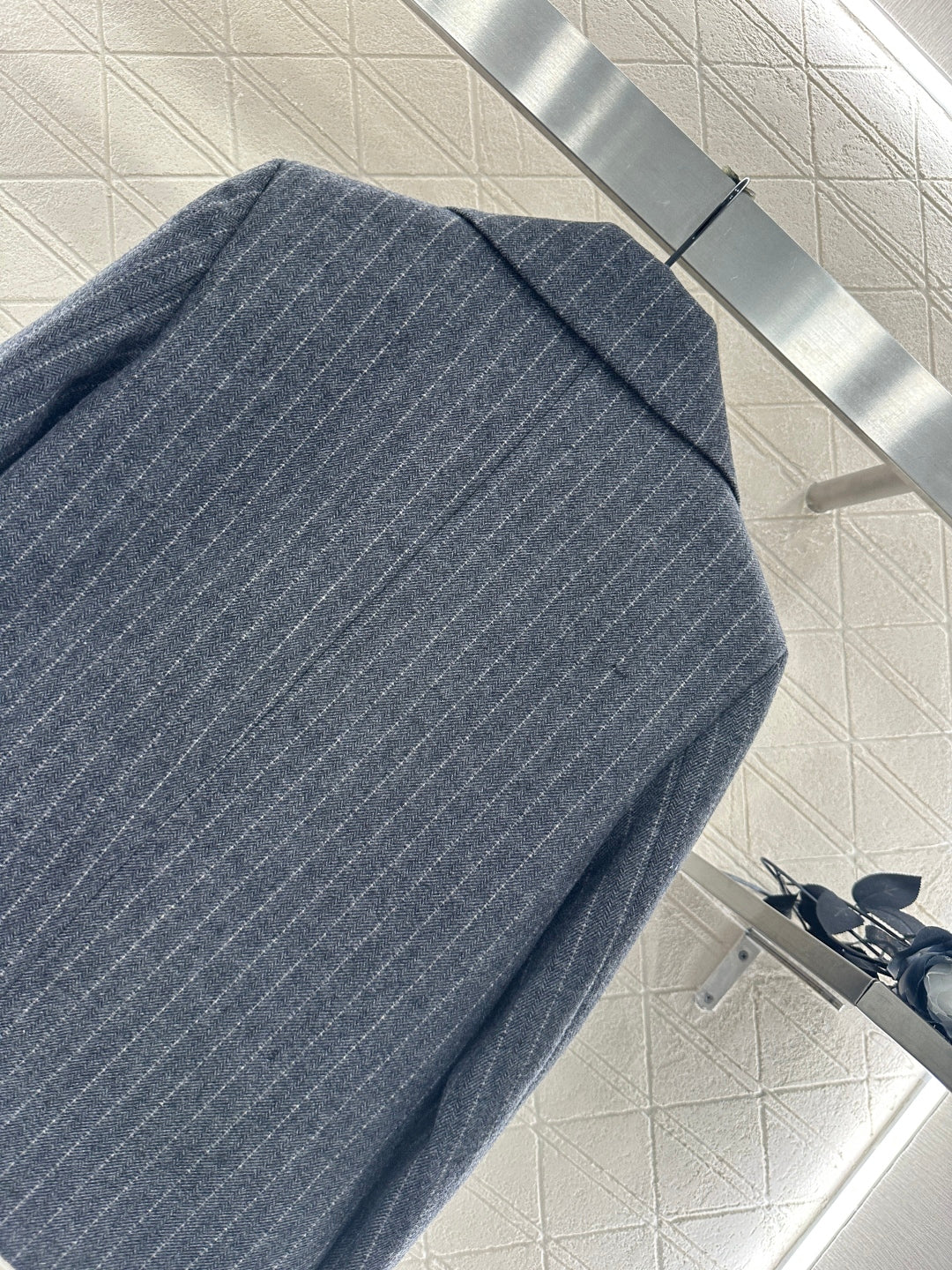 Custom YB imported cotton and wool material with high-quality texture and luster, smooth and stylish, straight shoulders and wide lapels, suit style, peak lapel jacket with three-dimensional tailoring on the chest, highlighting the brand's design sense, simple and elegant, vertical stripes throughout, with flap pockets + embroidered letter logo details, adding design highlights, high-end and fashionable, coordinated and unified style, deepening brand memory, the first choice for commuting and attending events, aura and charm