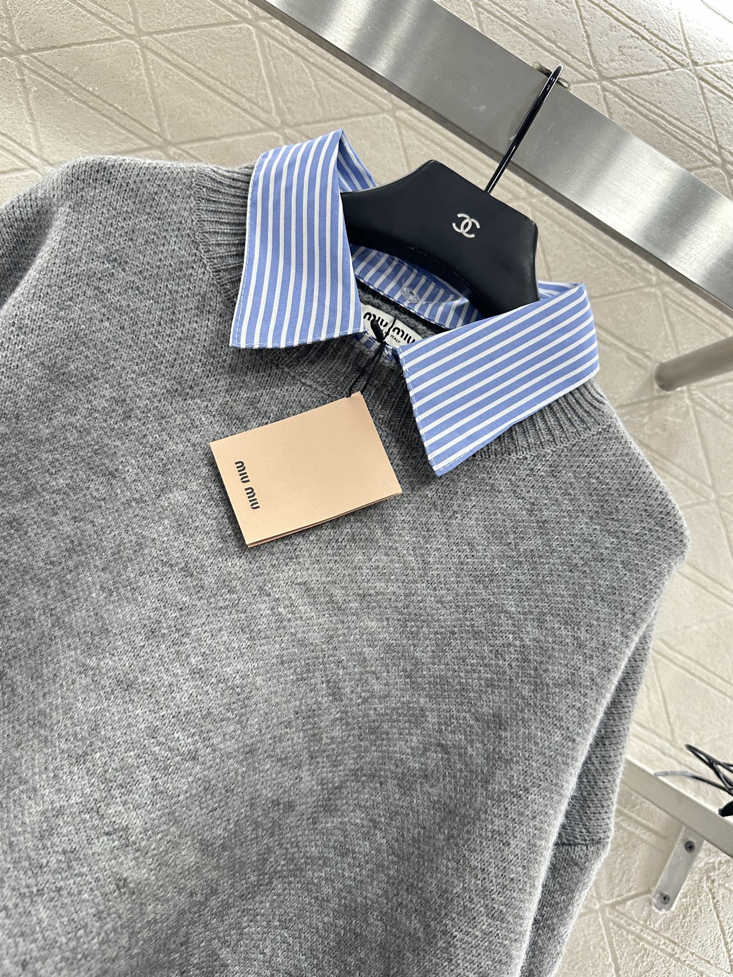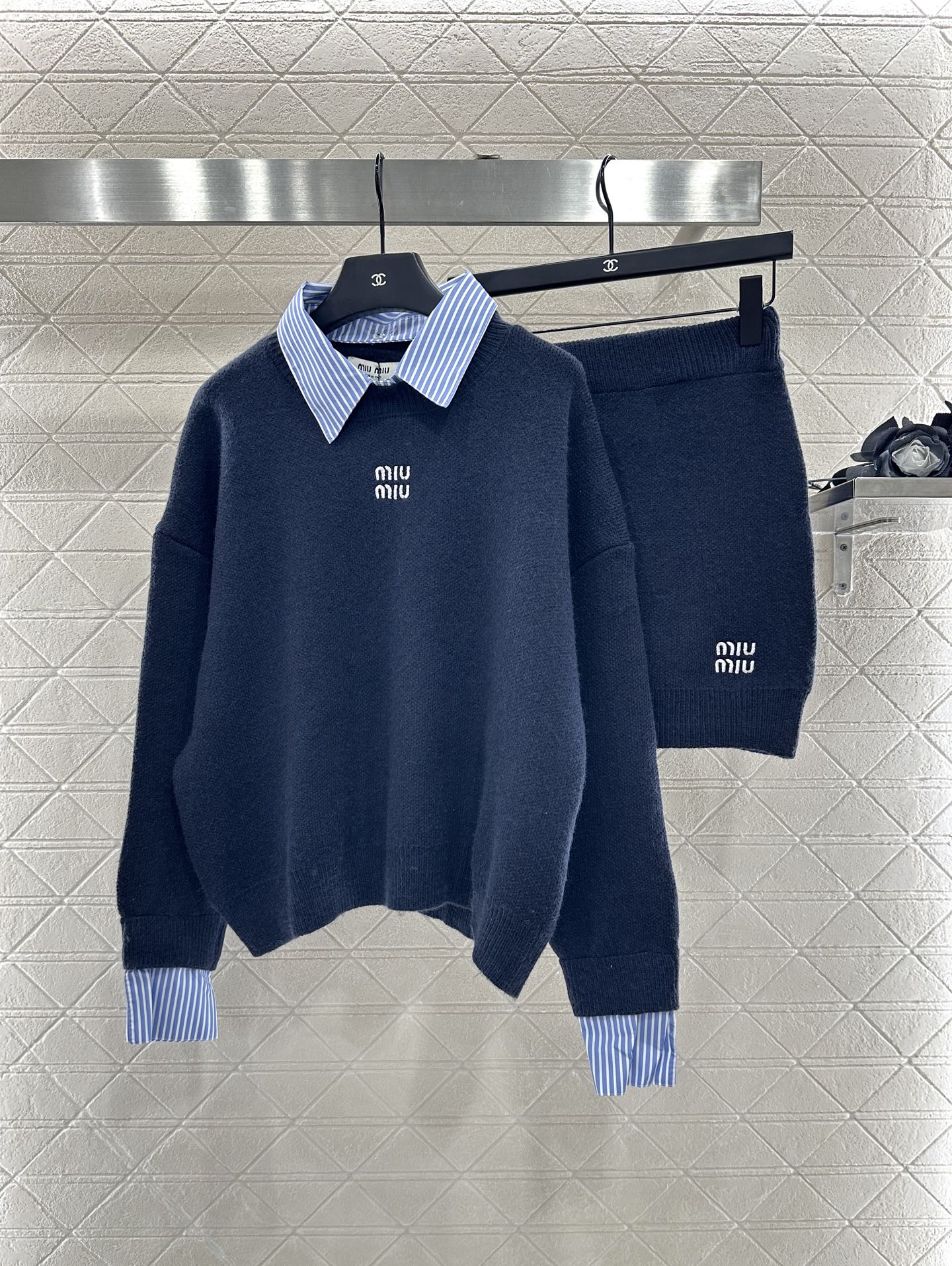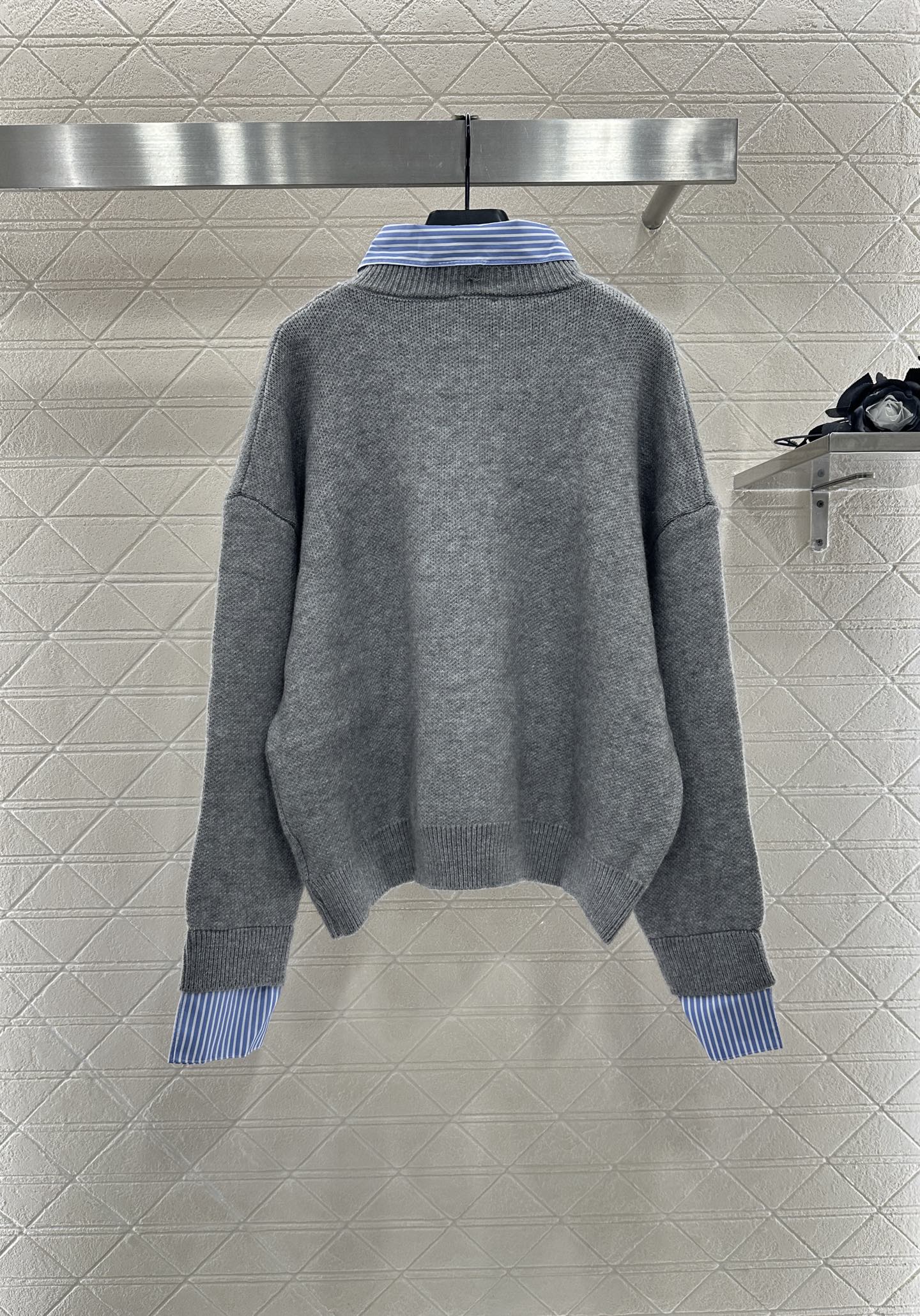 Customized YB wool material + cotton shirt fabric, stretchy and comfortable, full of texture. The lapel pullover top is cut, and the upper body presents a casual and lazy style. The torso is made of knitted material, and the collar and cuffs are spliced with white and blue striped shirts, forming a double collision of color and fabric, creating a false two-piece layered effect, adding a high and casual feeling to the outfit. It is fashionable to wear alone or as an inner layer, and the letter logo on the chest highlights the brand style. Wear it with the straight-tube hip-wrapped knitted skirt from the same series, the style is fashionable and age-reducing