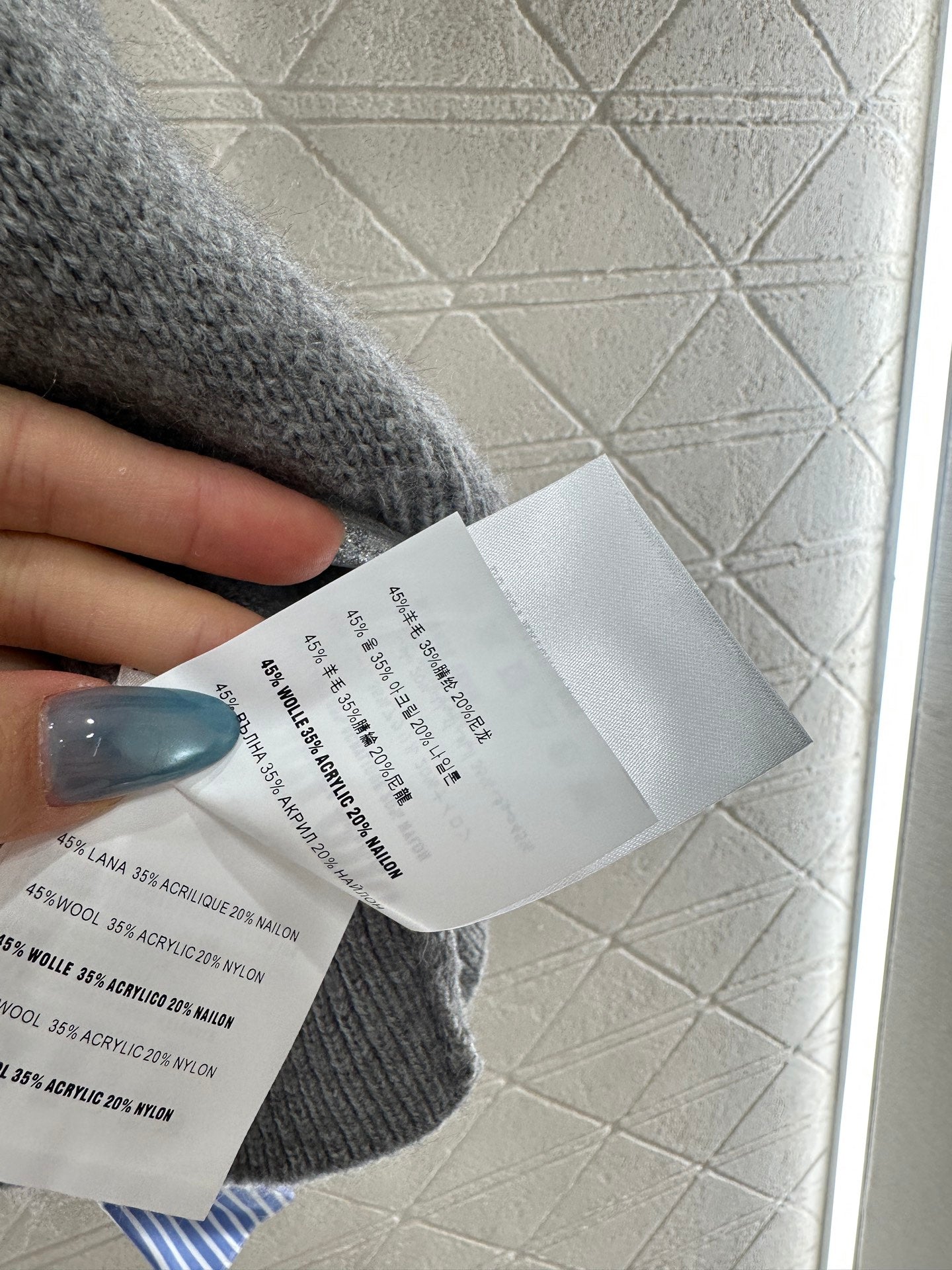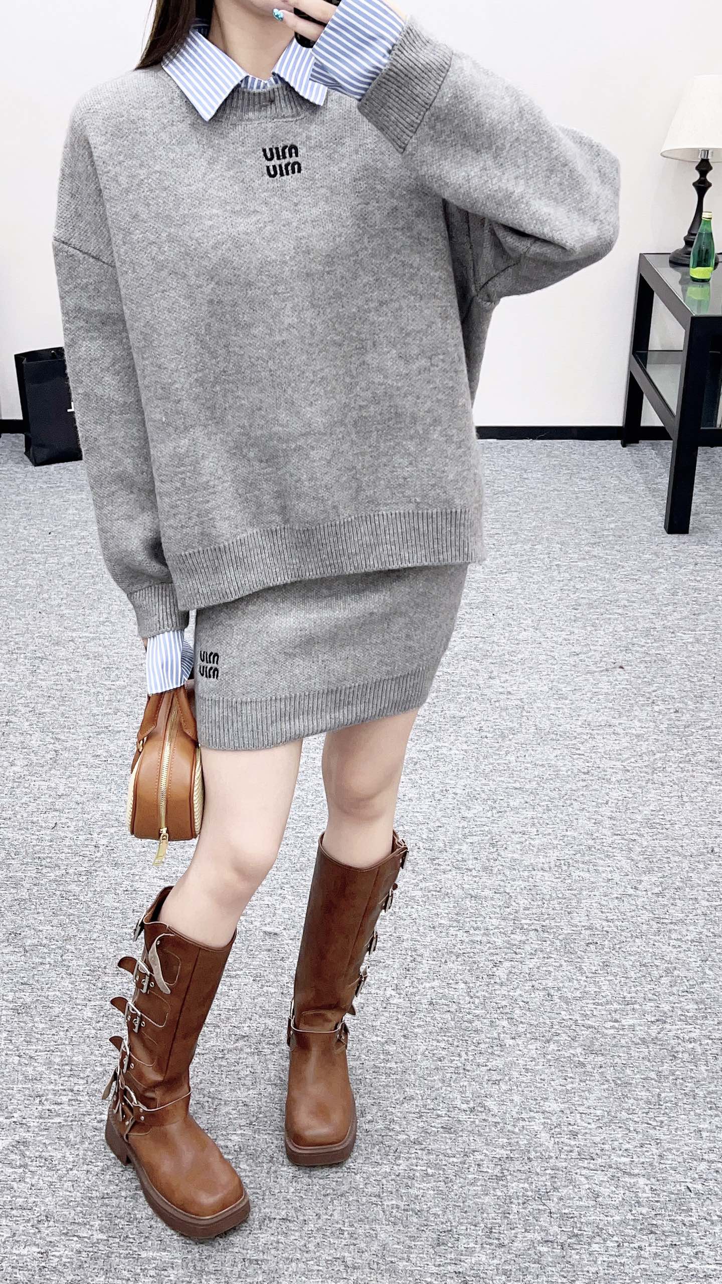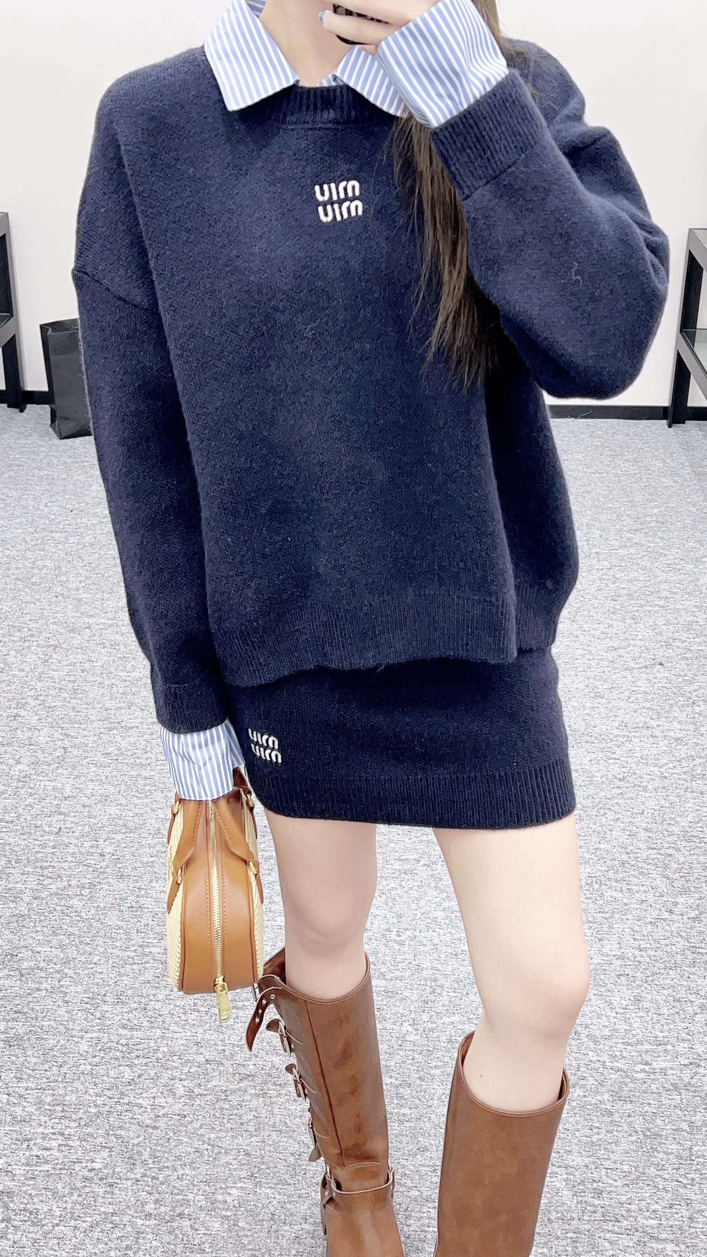 Customized YB wool material + cotton shirt fabric, stretchy and comfortable, full of texture. The lapel pullover top is cut, and the upper body presents a casual and lazy style. The torso is made of knitted material, and the collar and cuffs are spliced with white and blue striped shirts, forming a double collision of color and fabric, creating a false two-piece layered effect, adding a high and casual feeling to the outfit. It is fashionable to wear alone or as an inner layer, and the letter logo on the chest highlights the brand style. Wear it with the straight-tube hip-wrapped knitted skirt from the same series, the style is fashionable and age-reducing