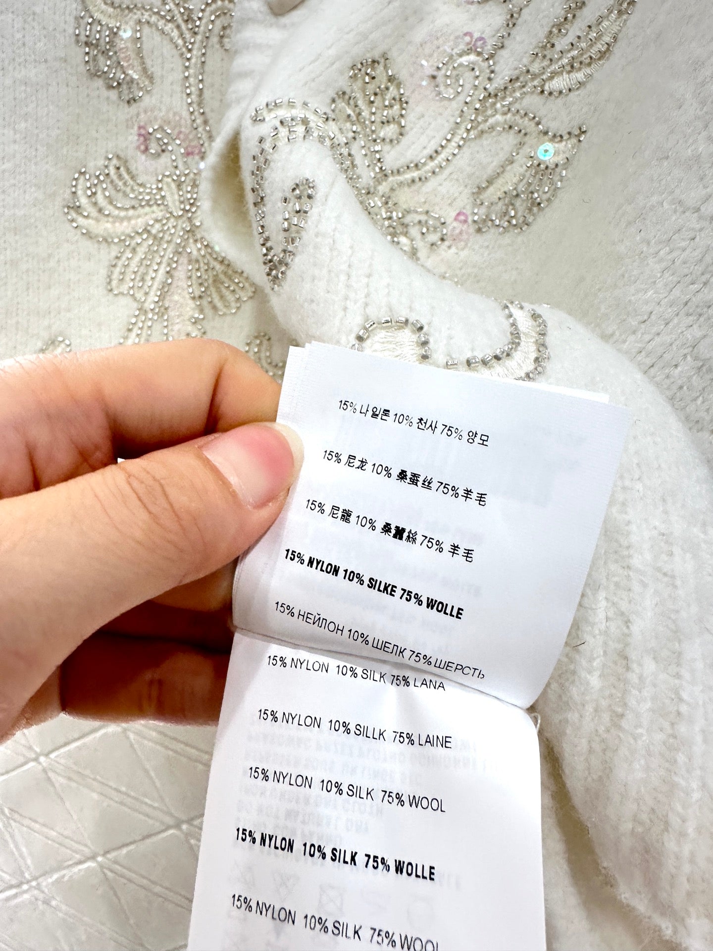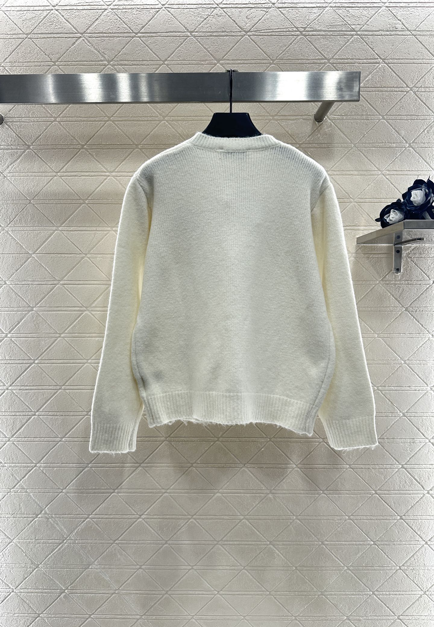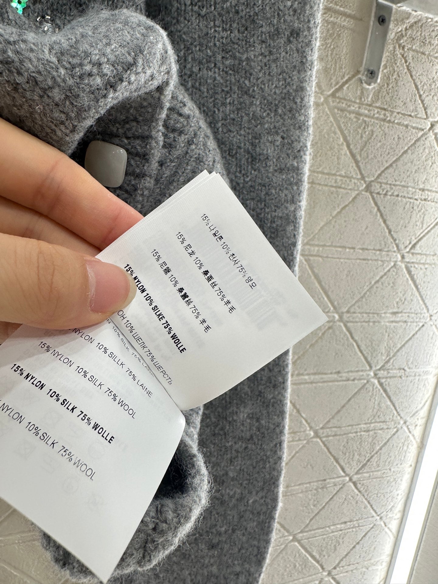 Custom YB wool yarn weaving, delicate texture, comfortable to wear, round neck knitted cardigan tailoring, large symmetrical embroidery + sequin craftsmanship, outline the floral pattern, shining gorgeous, with the letter logo on the chest, more noble, the hem is outlined in the same color to create a collision, with elastic fabric, fits the body shape more slimming, showing the brand's tone, versatile style regardless of age and skin color, more relaxed, fashionable upper body