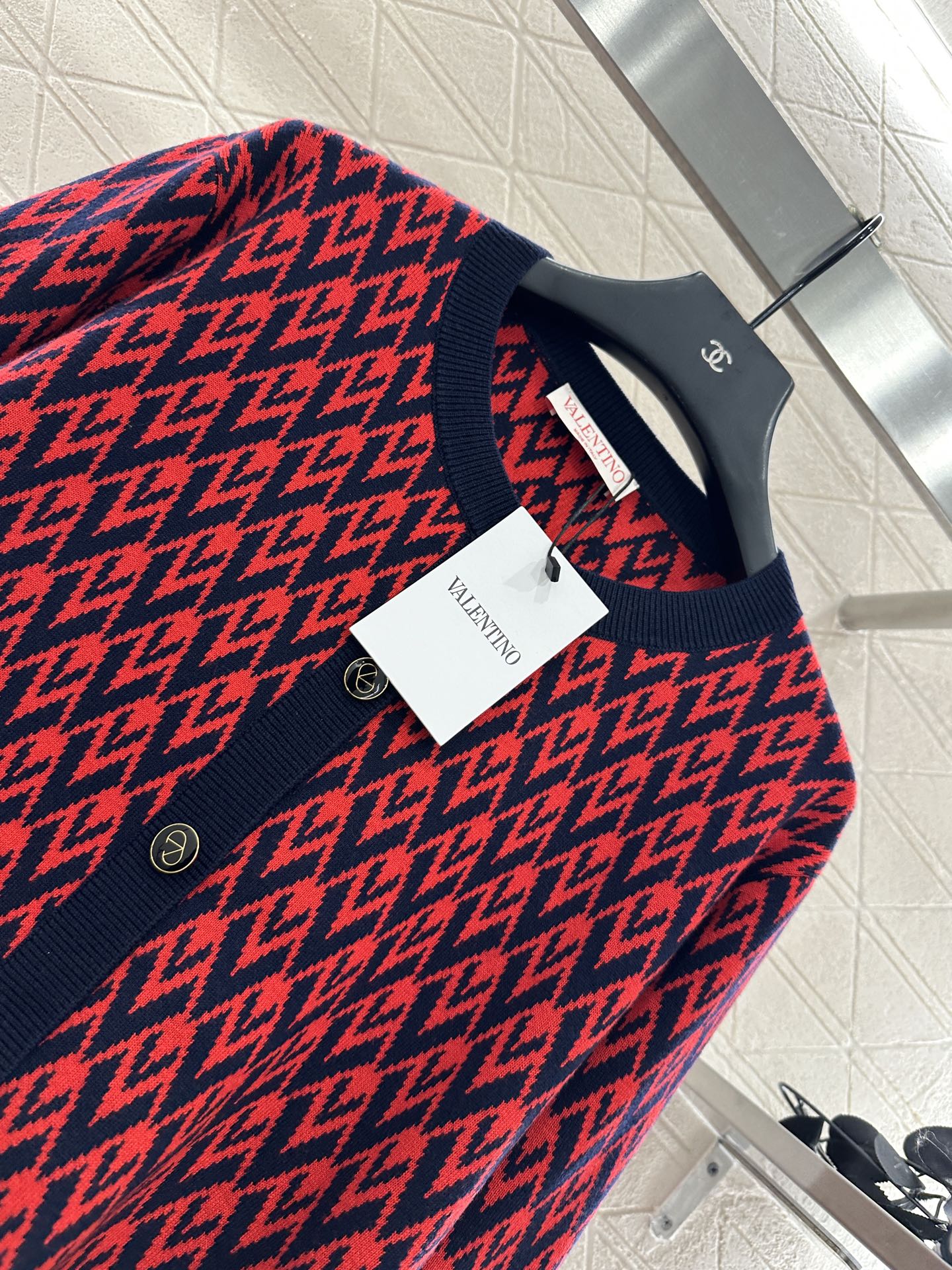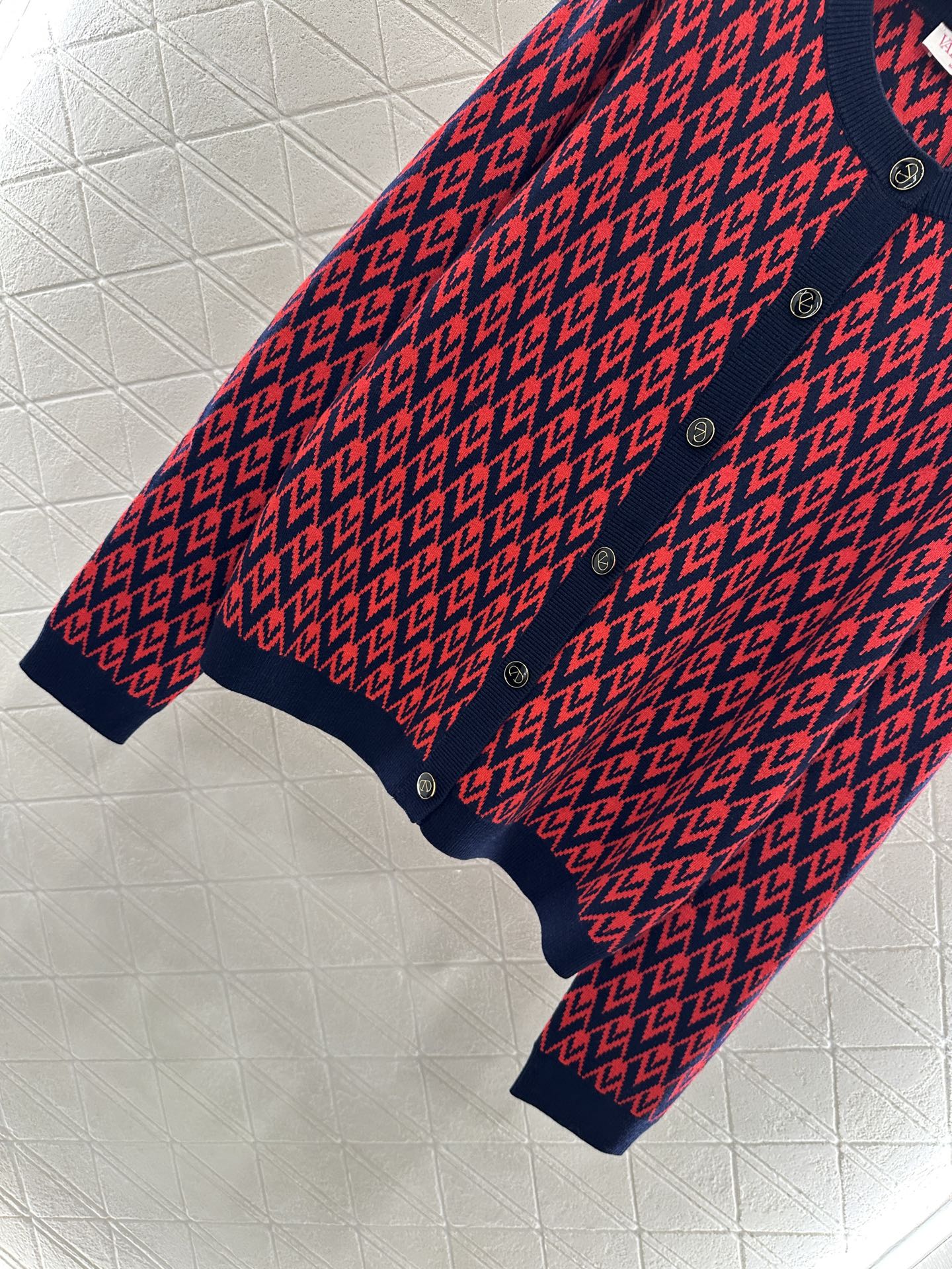 Custom YB wool yarn weaving, delicate texture, comfortable to wear. Round neck knitted cardigan cut, V-shaped jacquard pattern throughout, black hems create a contrast. Paired with stretchy fabric, it fits the body shape for a slimmer look. Front button embellished with a printed logo to showcase the brand's style. Versatile style, regardless of age or skin tone, for a relaxed fit. Customized fabrics and accessories.