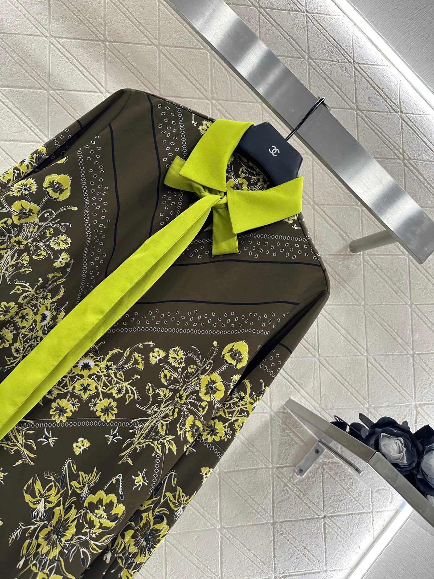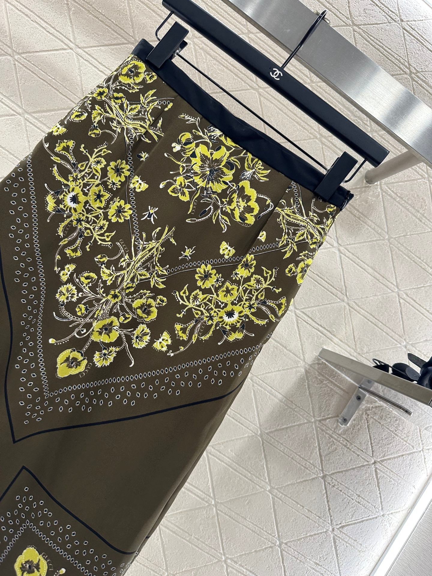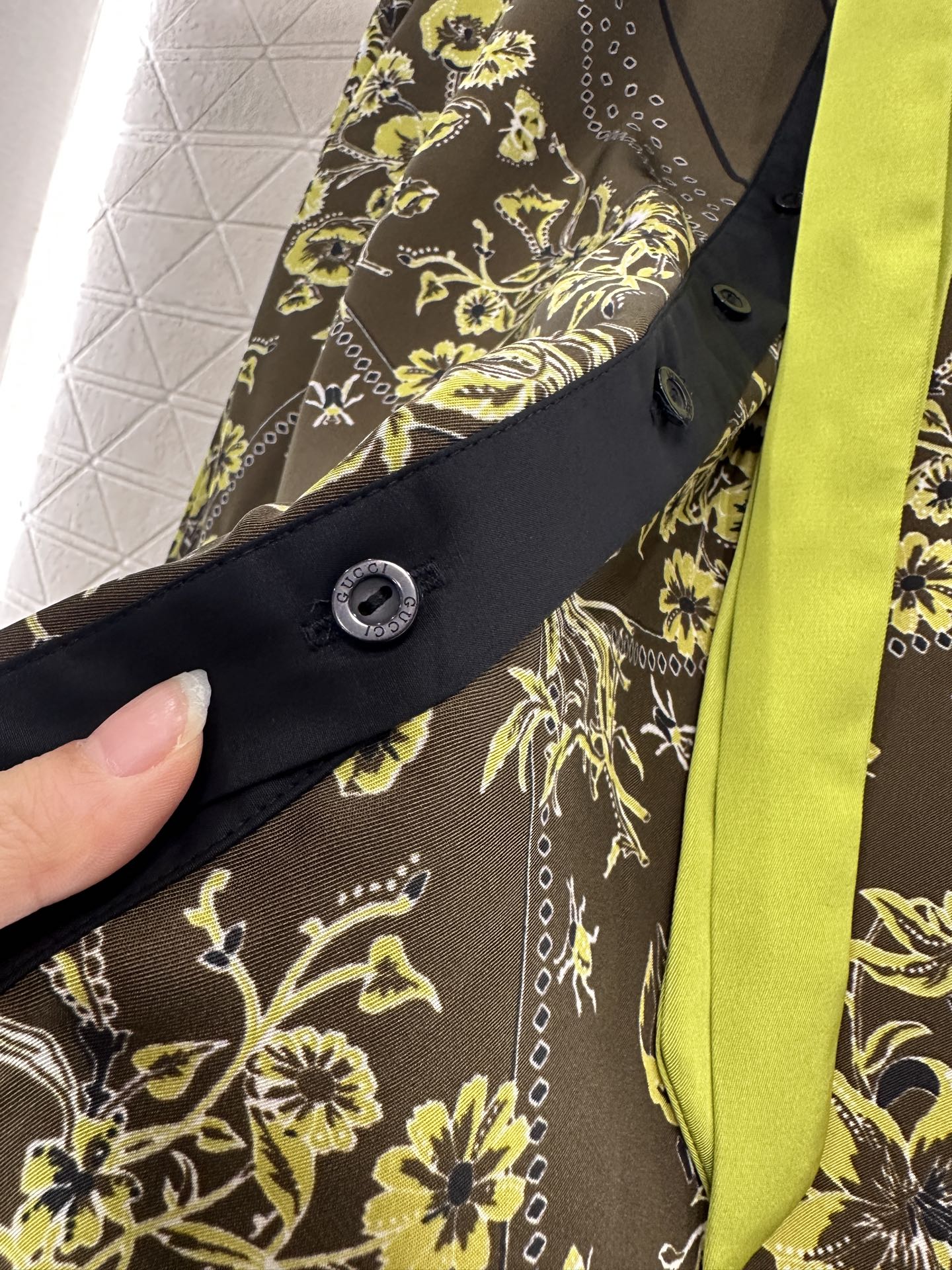 Jacquard material is soft and skin friendly, hanging and flowing throughout the body, presenting a diamond shaped distribution of the double G letter logo pattern, highlighting the brand's high-end style. The evergreen lapel shirt is cut and trimmed with a blue three-dimensional edge decoration. The lower hem is decorated with a drawstring that breaks the norm and provides a richer visual effect. The upper body temperament is relaxed and elegant, matched with a series of drawstring wide leg straight leg pants with strong inclusiveness, slimming and super relaxation. It can be freely matched to present a style full of old money