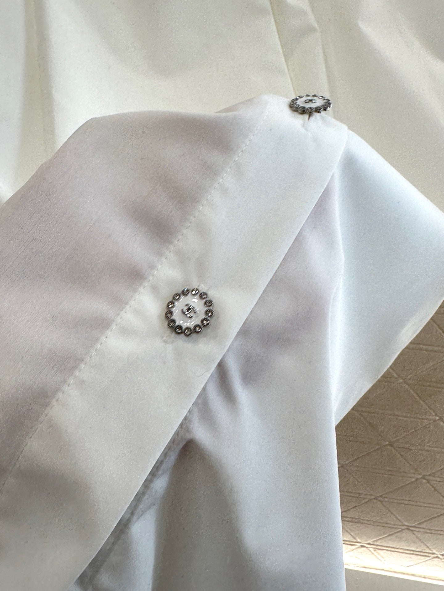 The twill cotton material has a comfortable and delicate texture, full of breathability, and a long collar shirt skirt. The cut is neat and slim, and the shirt and skirt are designed to be worn twice. The plain color is low-key, versatile, and durable. The collar is decorated with a hanging ribbon, which can be loose or tied, making the gameplay more fashionable. Combined with the buttoned water diamond double C letter emblem, it has a strong sense of old money fashion. The two side slits are more inclusive and flexible, showcasing a high-end style. It is easy to wear on the upper body, giving it a stylish and high-end feel. Paired with a fur coat in autumn and winter, it is more eye-catching!