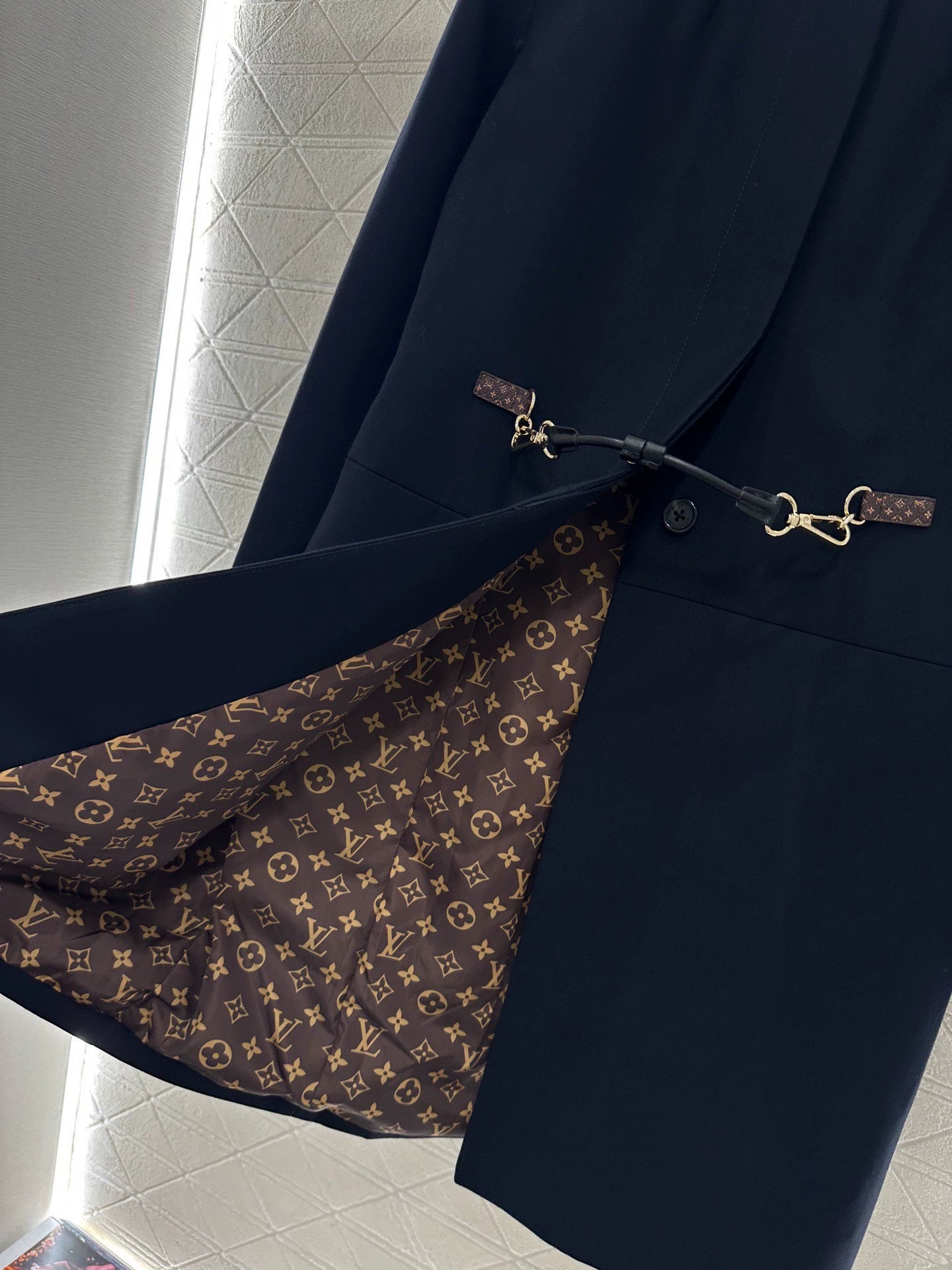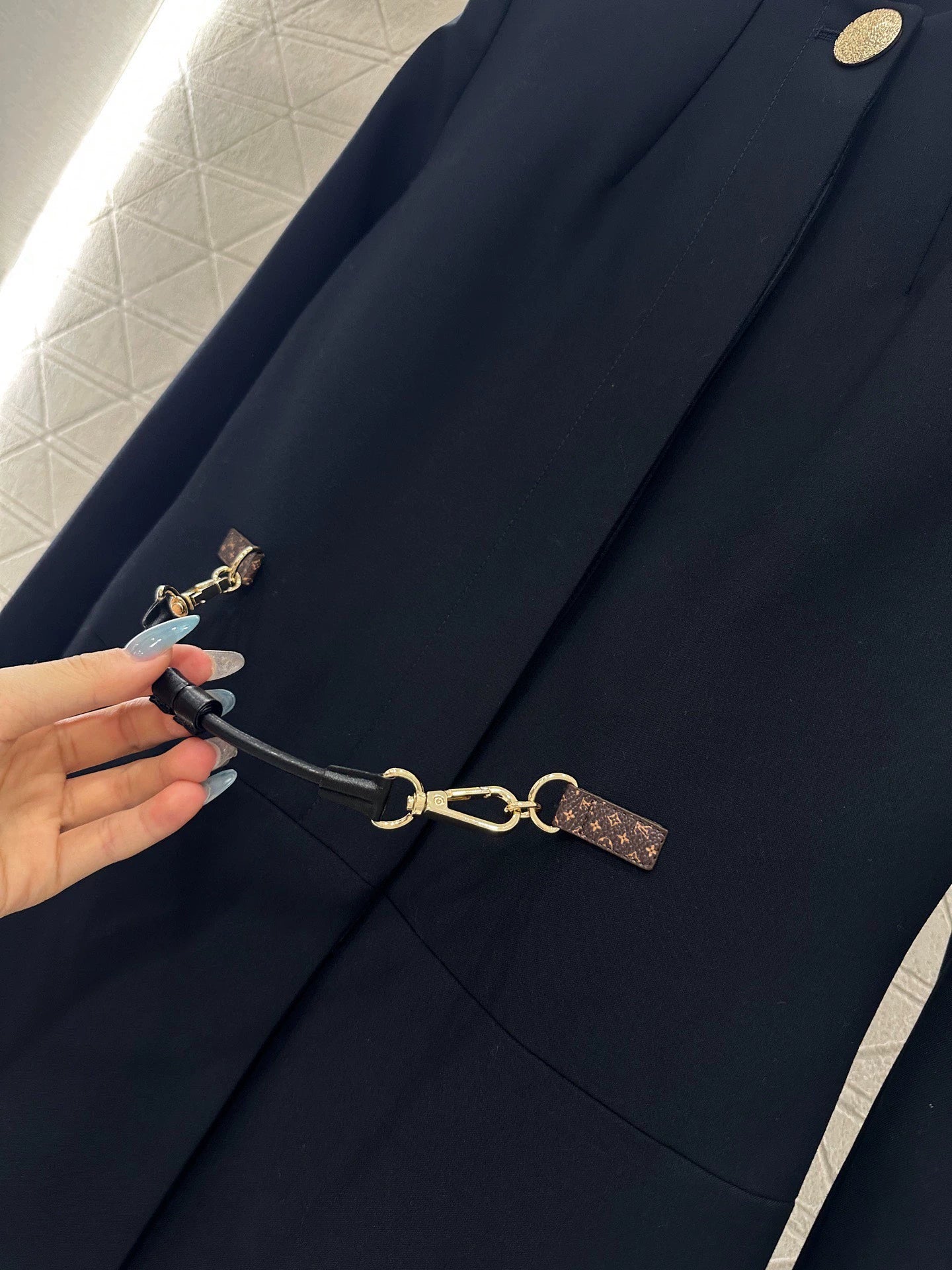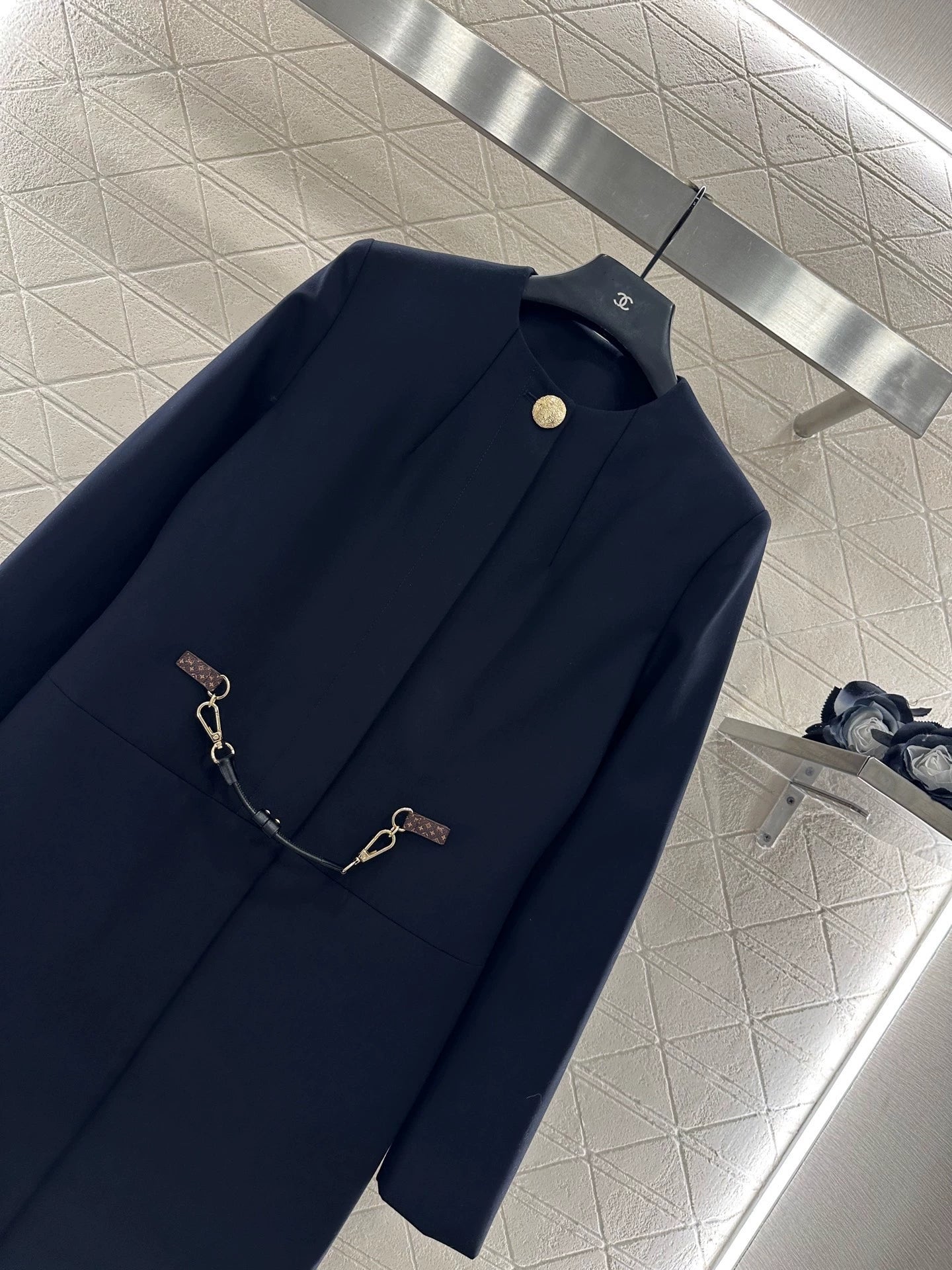 Exquisite imitation of wool material, high-quality texture, full appearance, round neck mid length jacket, can be worn as a dress, with a shoulder design that fits the human body, making the figure slender and straight. The whole body is three-dimensional cut, connected by a leather chain buckle with four leaf clover letters, and matched with the waistline to divide the proportion, perfectly interpreting elegant charm and full of aura, suitable for different occasions