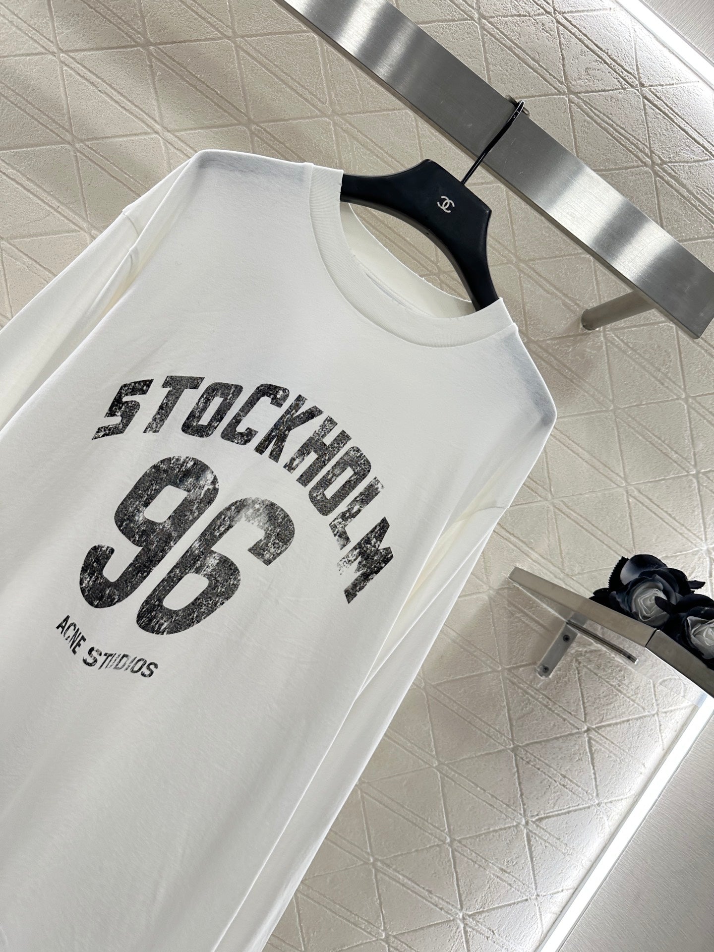 The twill cotton material has a delicate texture and comfortable elasticity when worn. The loose round neck top is cut to present a visually inclusive and slimming effect. The entire garment has an aged and polished white effect printed with alphanumeric patterns on the chest, further enhancing the brand identity and creating a fashionable and high-end feel. It creates a personalized style, fashionable and relaxed, and stands out both when worn alone and on the inside