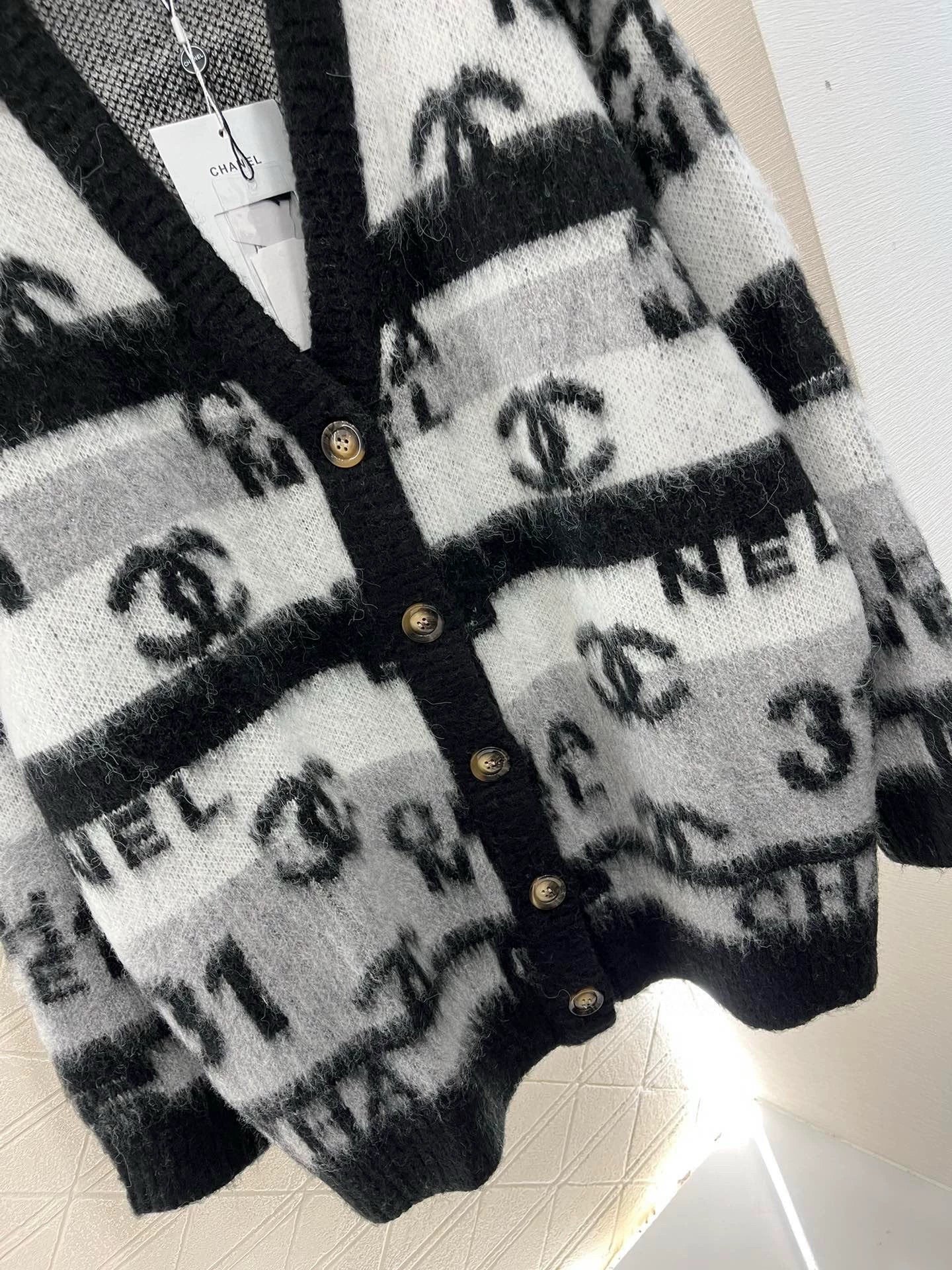 Fine knit fabric creates a clear sense of fur texture, comfortable and skin friendly shoulder cut, loose and full of shoulder and neck exposed skin, slim cuffs, threaded hem with elastic wear, comfortable all over black, white and gray stripes, double C letter jacquard positioning embellishment, more artistic temperament, rich design hierarchy, tortoiseshell color round logo details, more texture