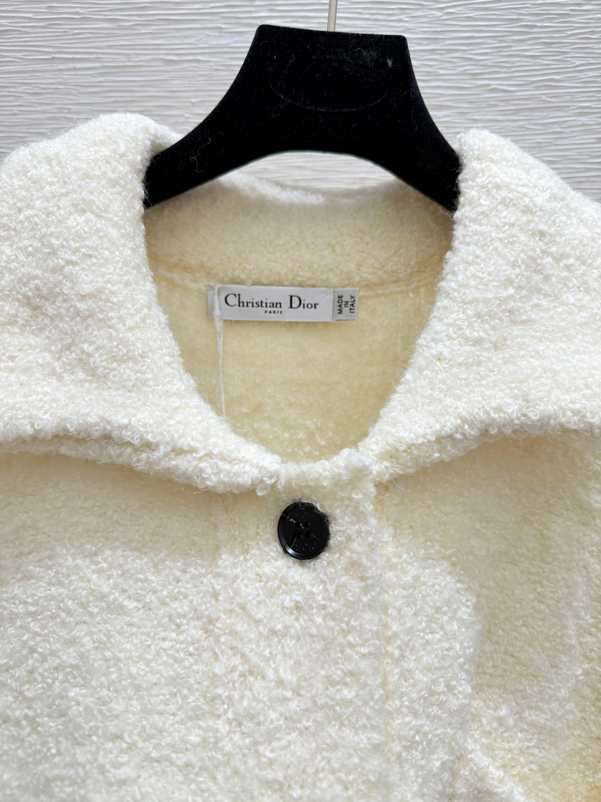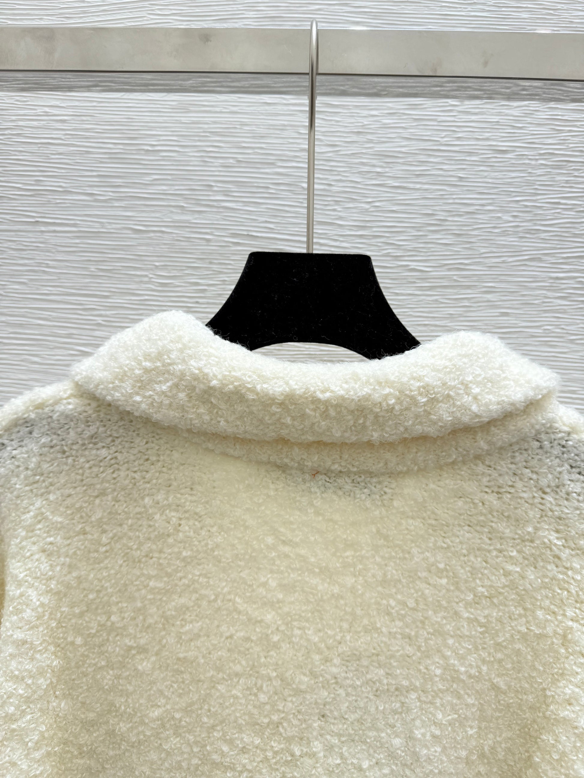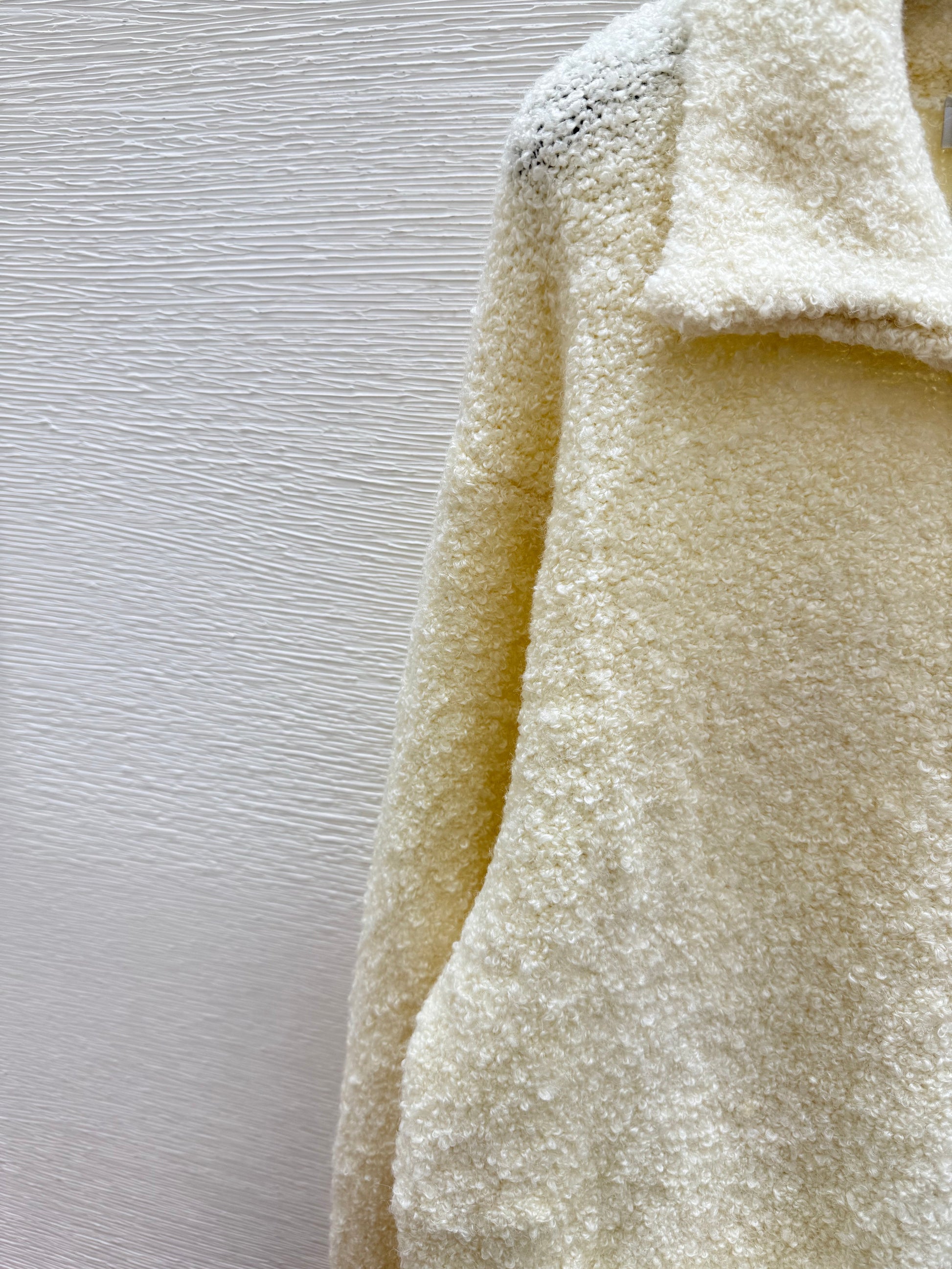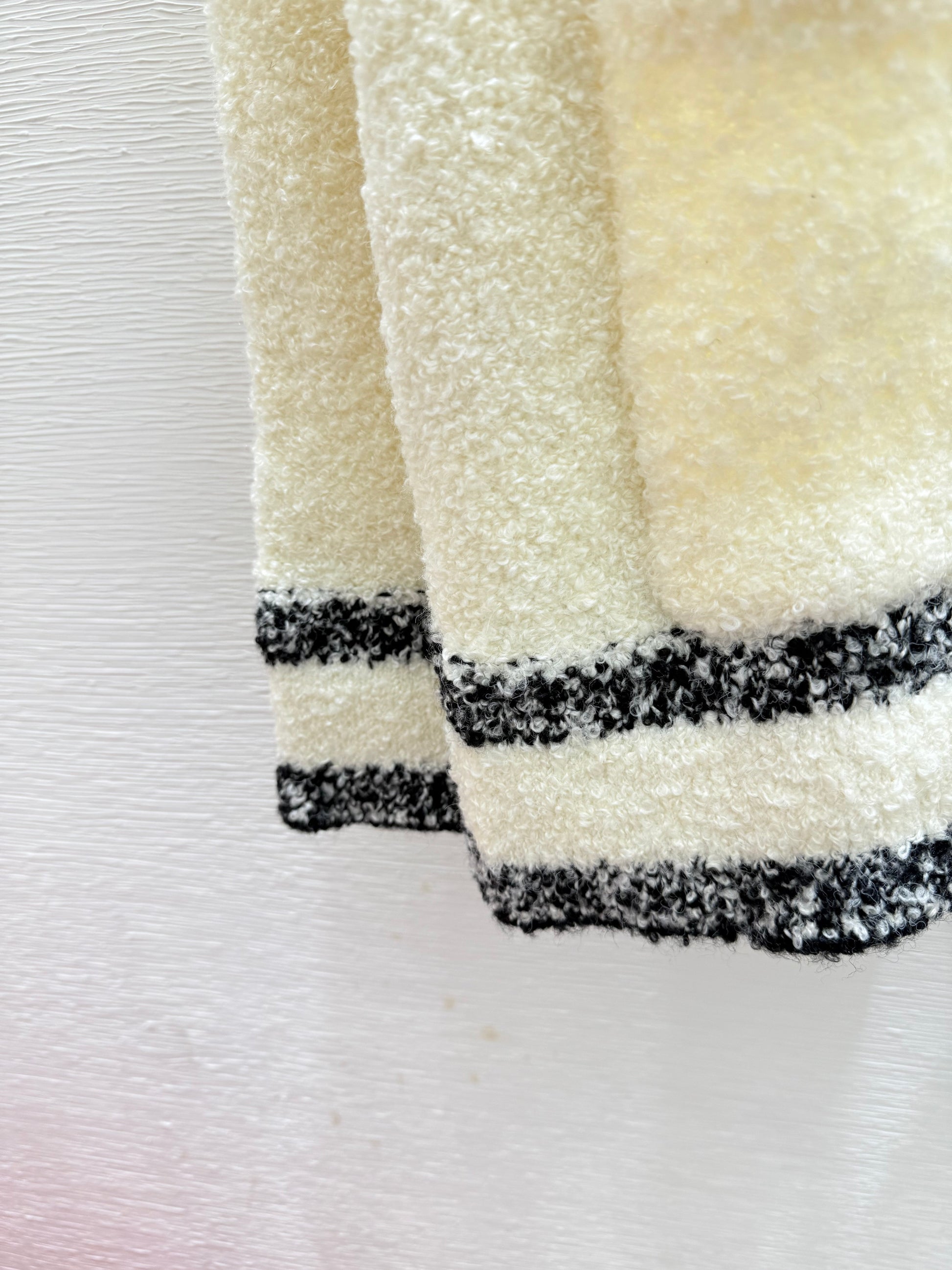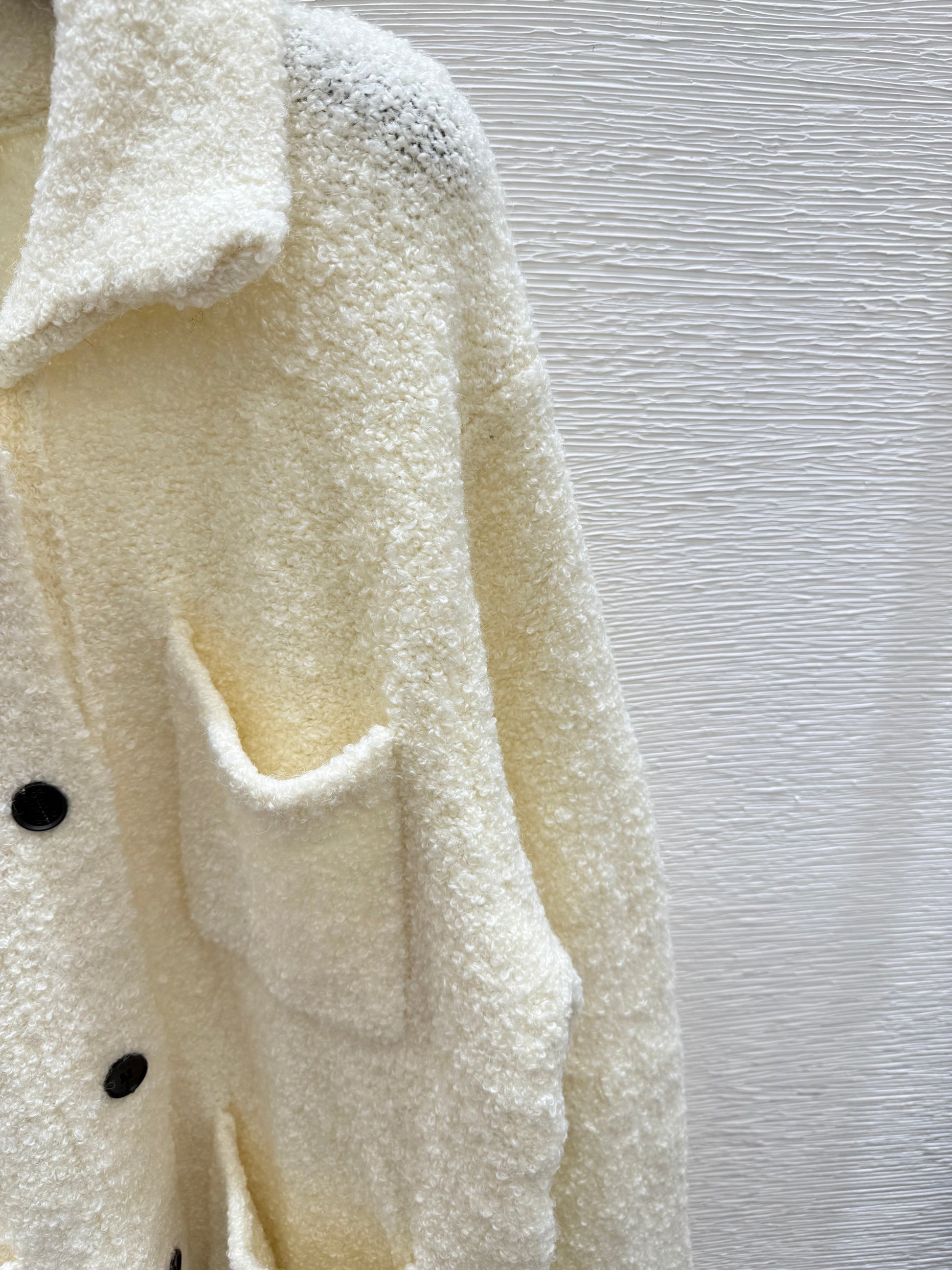 Classic beige color scheme, black striped decorative edge, stand up collar design, front button cardigan style. Soft and fluffy texture, warm and comfortable.