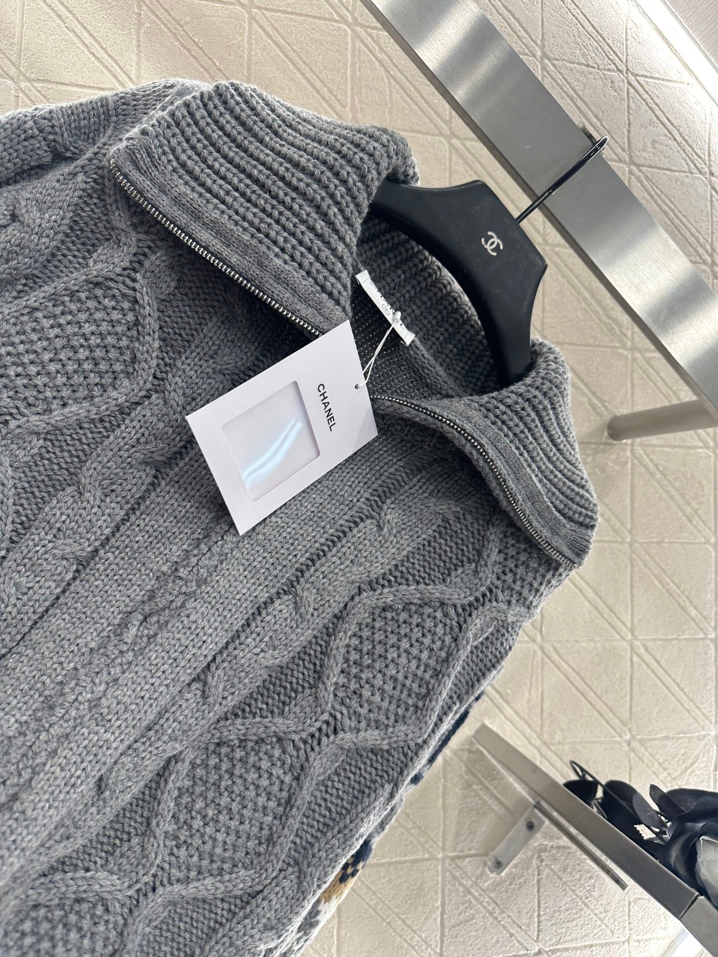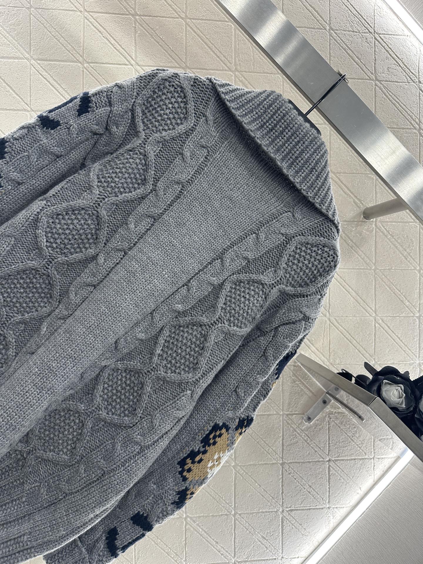 Wool yarn weaving texture is delicate and soft, skin friendly, turndown collar, high collar, two way zipper coat, full body Fried Dough Twists spiral, multiple crochet texture ➕ Two sleeves with symmetrical flower contrasting patterns embellishing details, relaxed yet fashionable. Smooth zipper adjustment for sleeve collar and hem elasticity. Threaded edging to fit body shape. Honeybee CD logo decoration on waist side, showcasing fashionable and relaxed charm