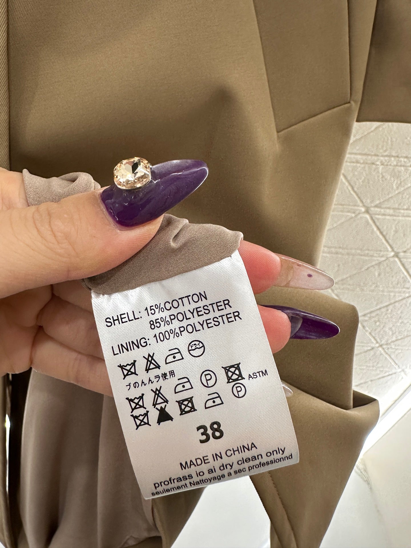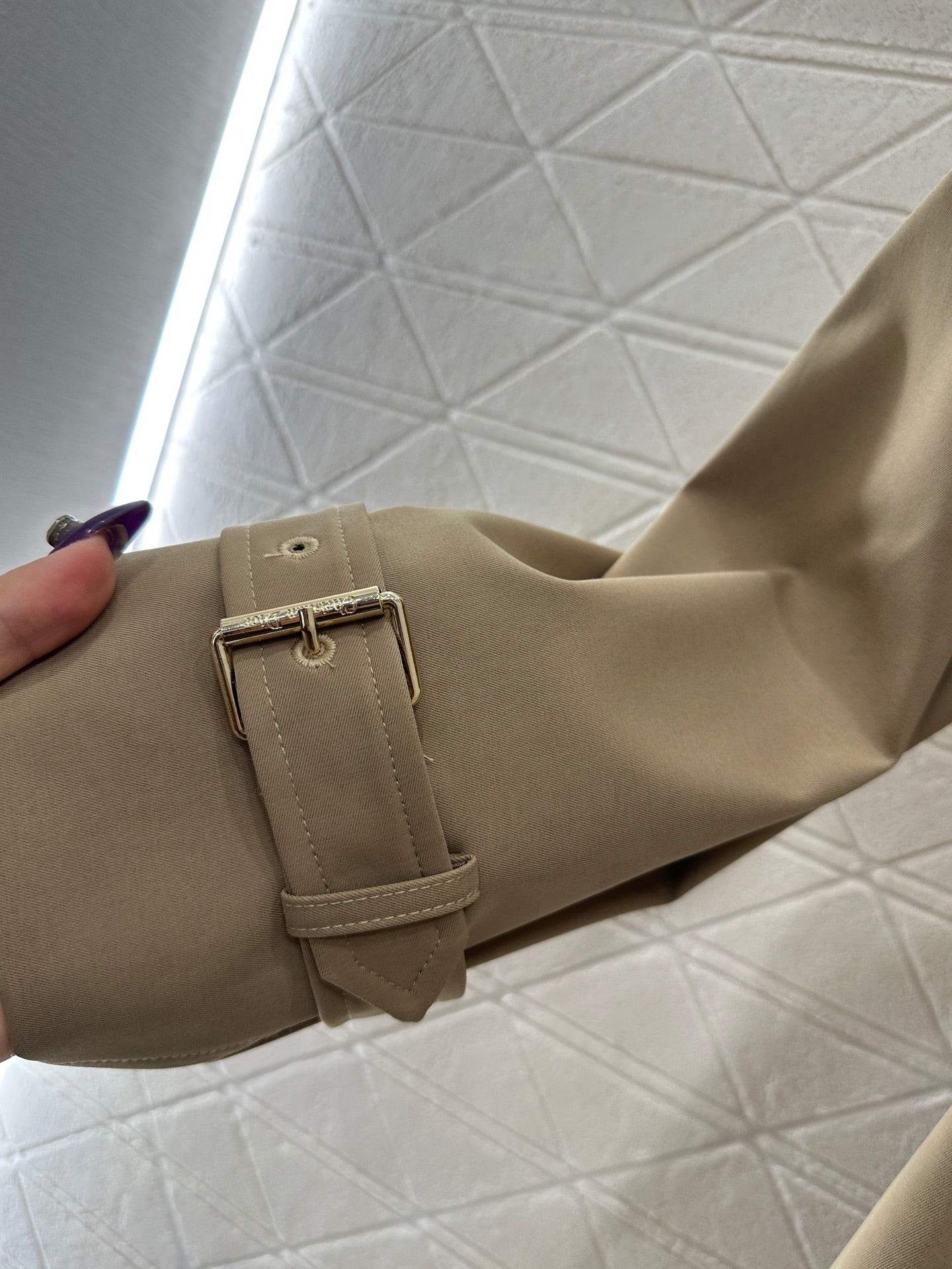 The material and craftsmanship of the windbreaker are crisp and stylish, with a long waistband and a symmetrical folding shawl design on the collar. The front of the windbreaker is engraved with a round buckle and slanted pockets, enhancing the layering of the clothes. The waistband design outlines a graceful figure, echoing the shoulder strap buckle and cuff buckle. The embroidered letters at the hem showcase the brand's tone in a low-key manner, creating an elegant silhouette. Dressing, temperament, charm, British elegance