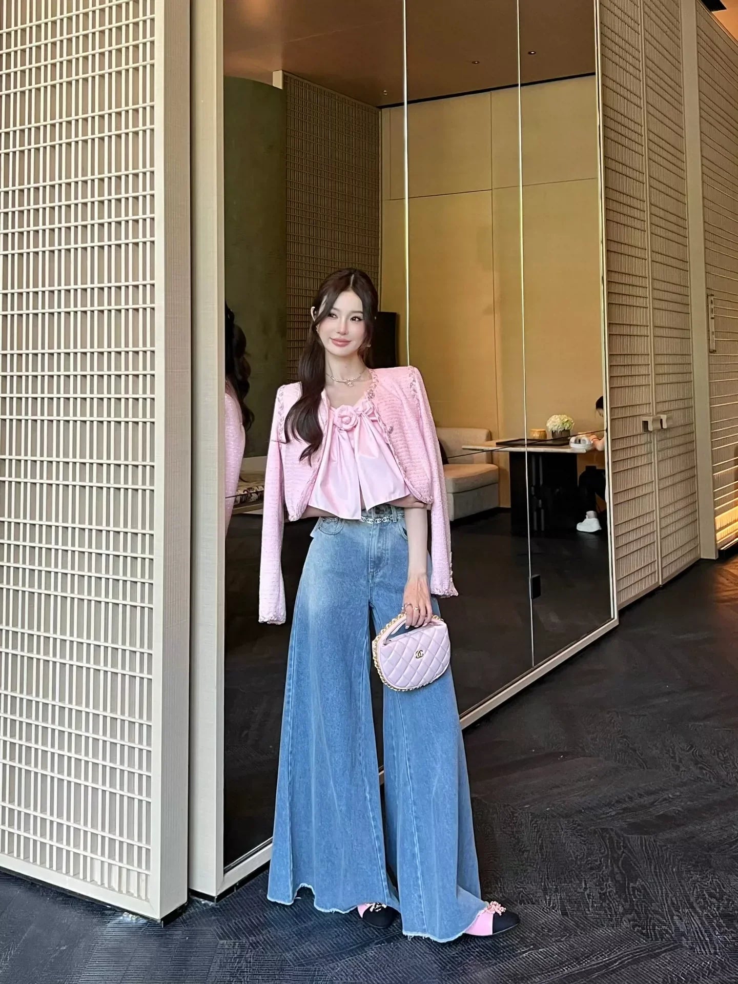 The plaid woven fabric is heavy and weighty, and the three-dimensional handmade small flower decoration is beautiful and explosive. It looks great in daily photography