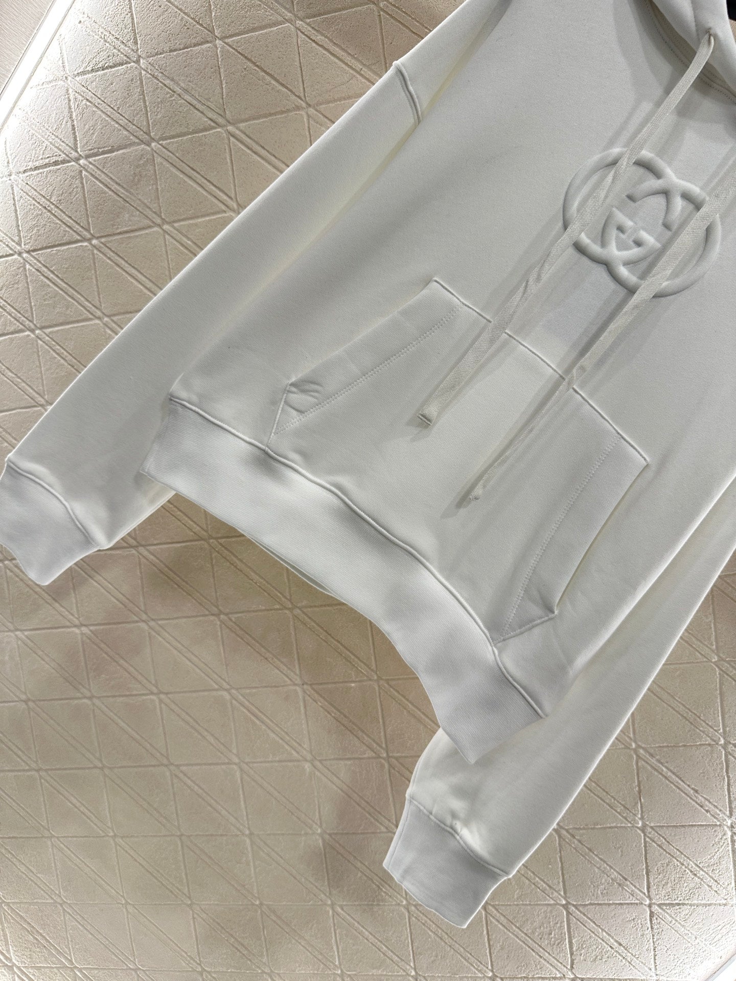 Made of all cotton material, soft and skin friendly, not easily deformed or pilling after long-term washing, with a rich texture. The hooded long sleeved sweatshirt is cut in a fashionable and casual style, and the double G letter logo is embellished on the chest, instantly enhancing the brand's style. The loose fit combined with the large pocket details adds vitality and style, making casual matching simple and high-end, essential for autumn and winter items
