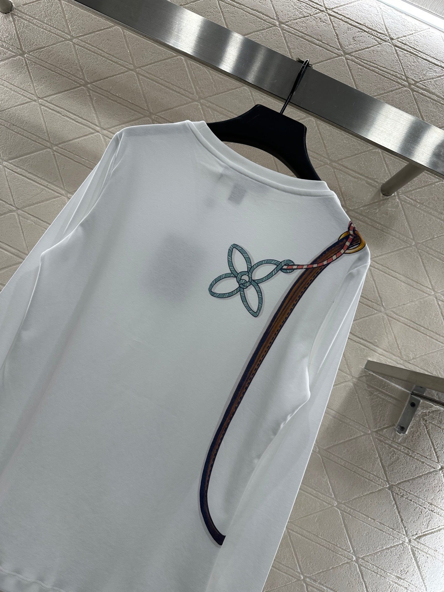 The twill cotton material is breathable and comfortable, with a rich texture. The regular long sleeved top is cut to highlight the brand's style. It is made of heavy-duty pure cotton, with a strong sense of drape, presenting a slimming visual effect. The chest uses printing technology to restore colors, with key colors creating a hand drawn jacquard pattern on the outer contour of the leather bag. The four leaf clover pattern is interspersed, and the style echoes the letter chain engraved on the collar, extending to the back shoulder, immediately revealing a fashionable and high-end feeling, creating a personalized and fashionable relaxed look. It stands out both when worn alone and on the inside.