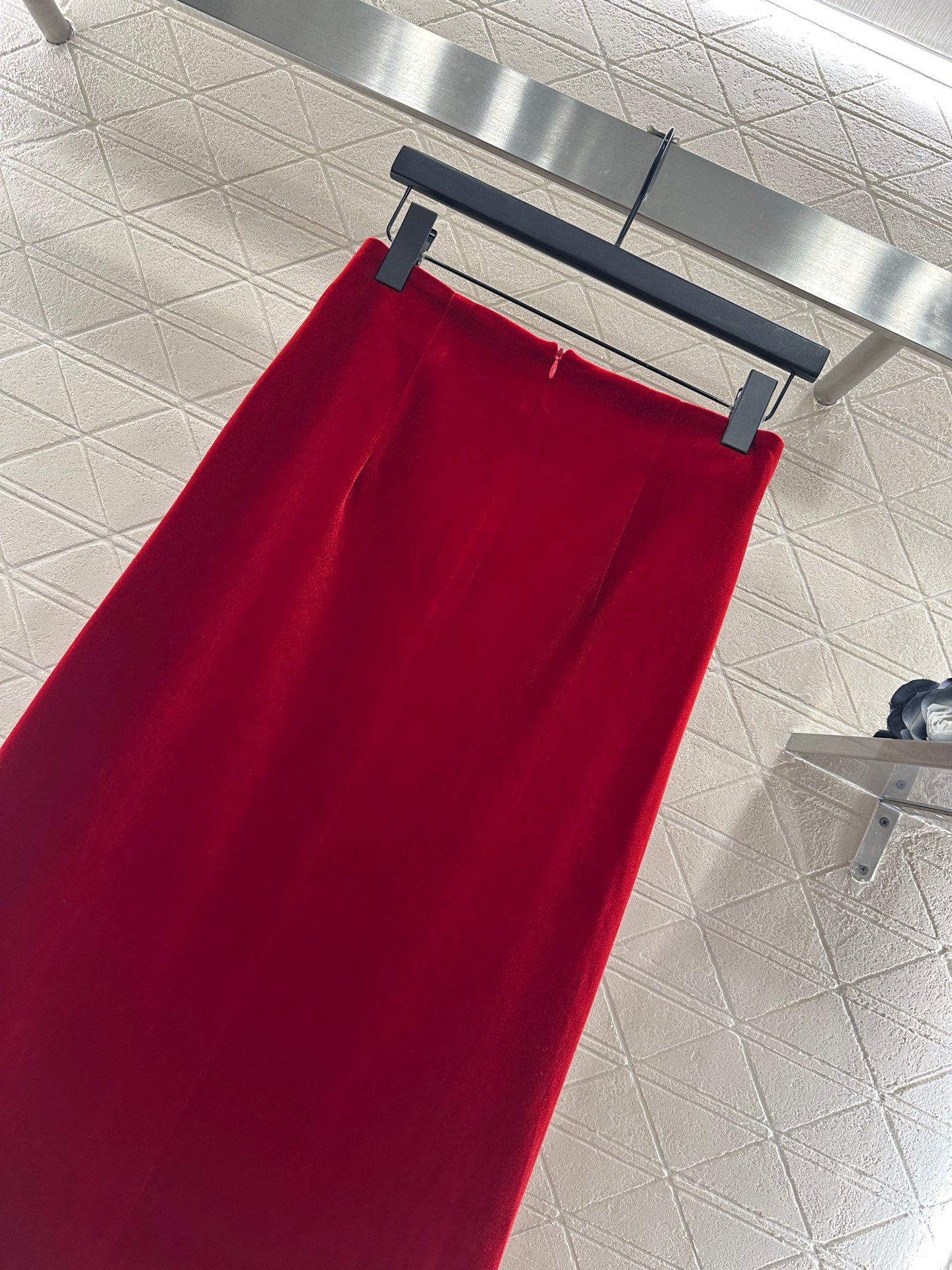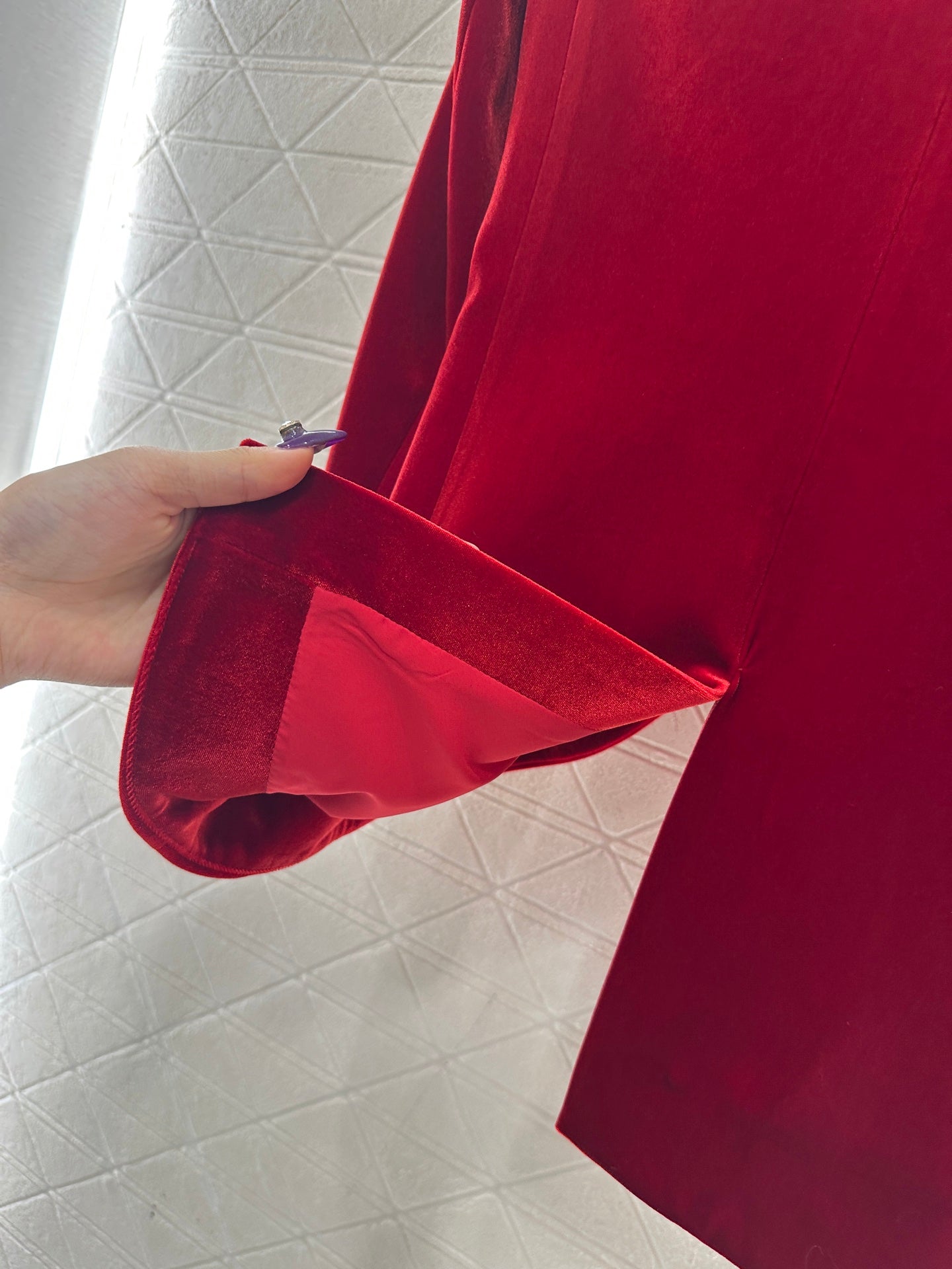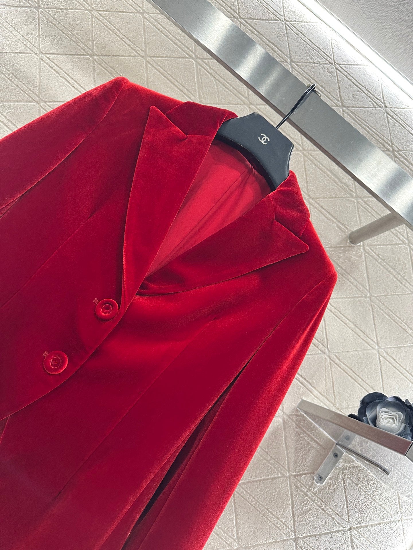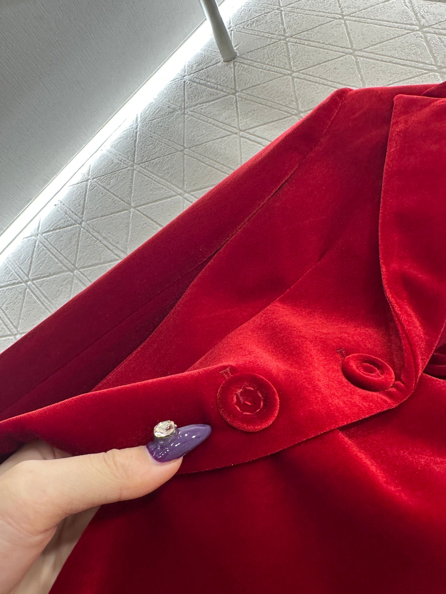 Velvet material, glossy texture, comfortable drape, lapel suit style, dark red velvet soft and reflective throughout, elegant temperament, single button fixed front, matched with irregular half moon shaped hem, showing artistic tone. The back waist slit is three-dimensional and inclusive, paired with the same series of high waisted straight tube micro A mid length half skirts, the complete set is full of temperament, and the red set is just needed at the end of the year.