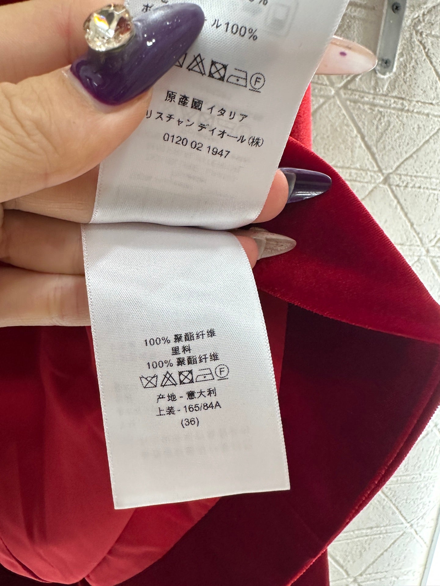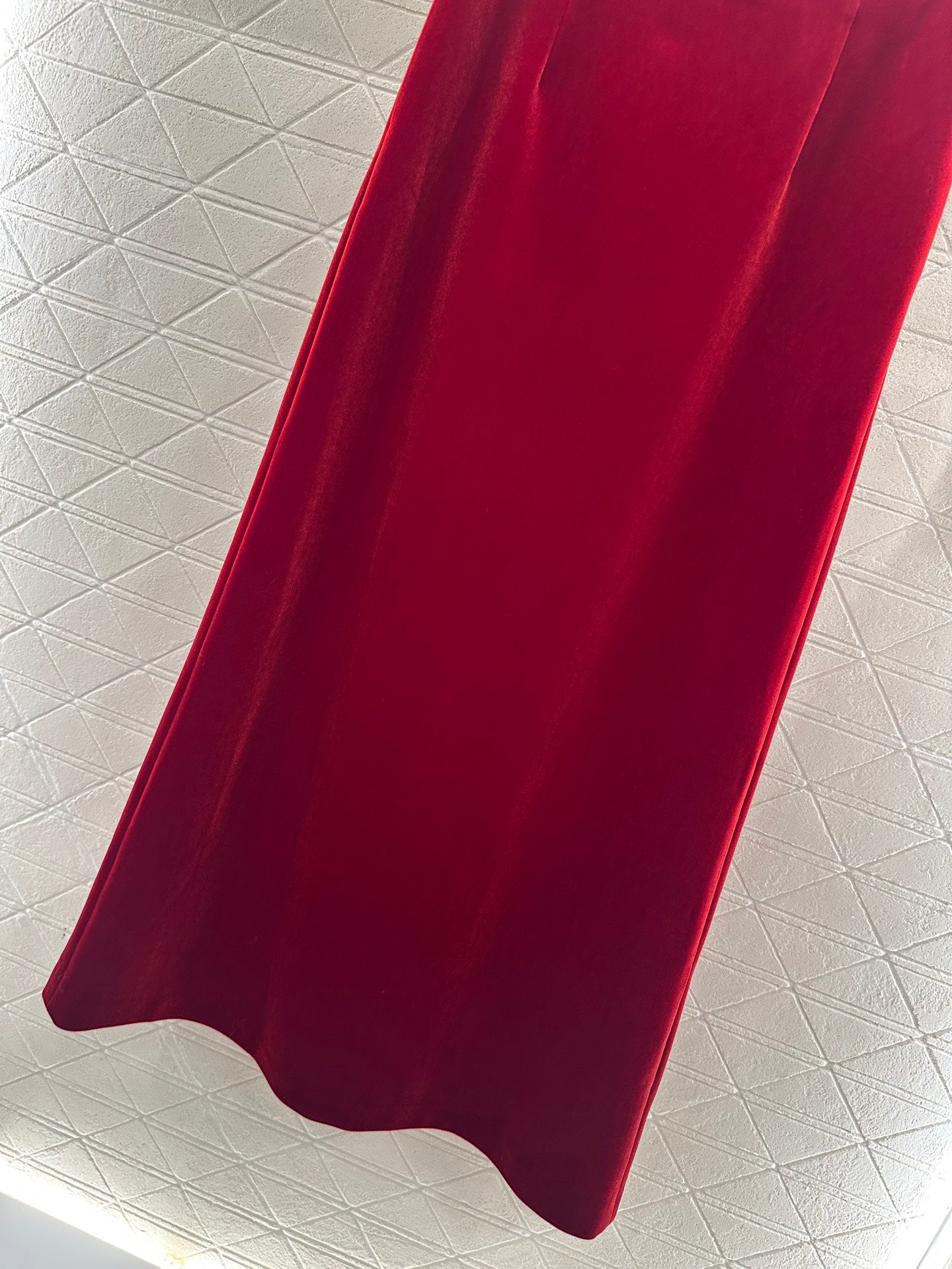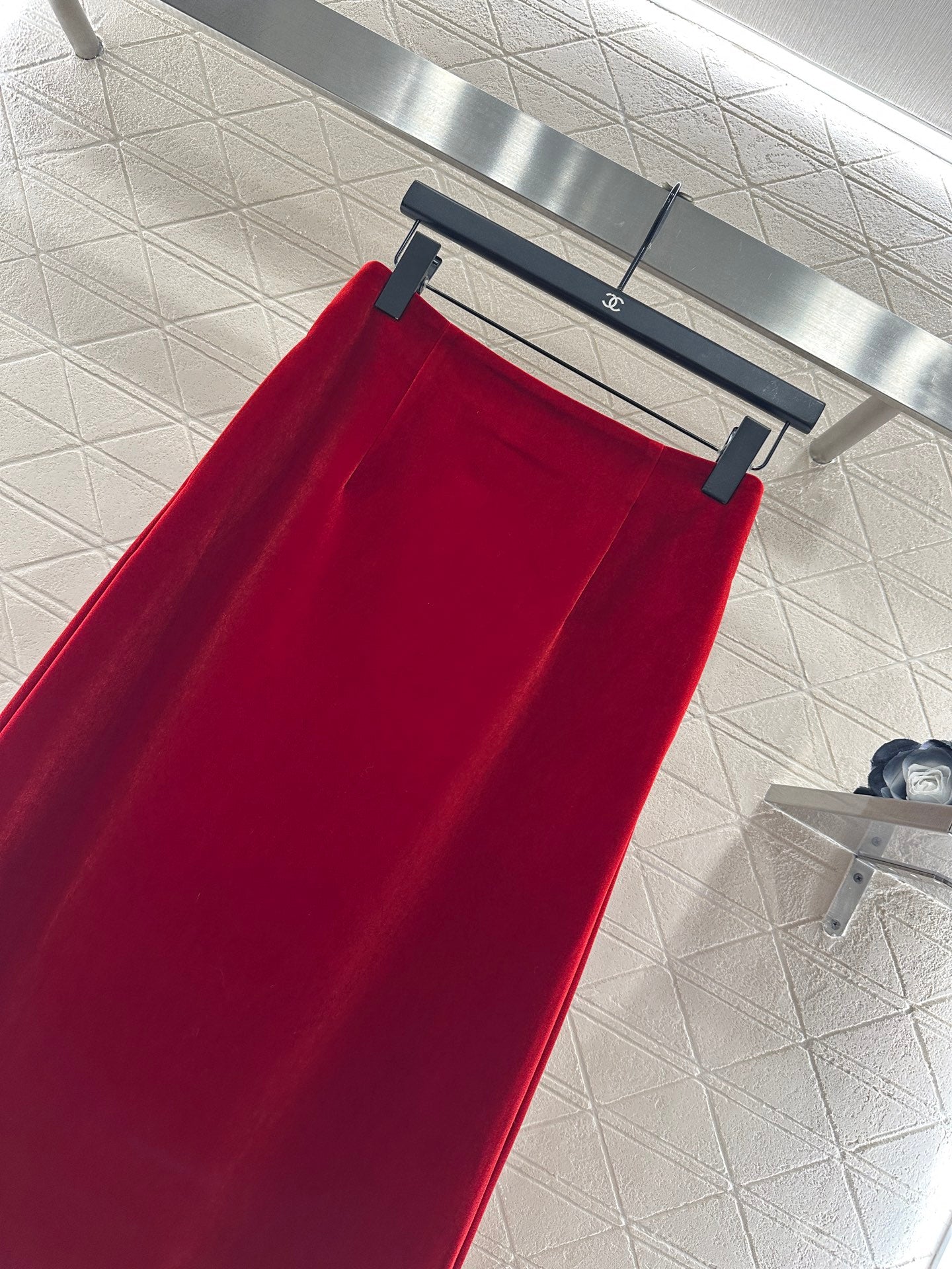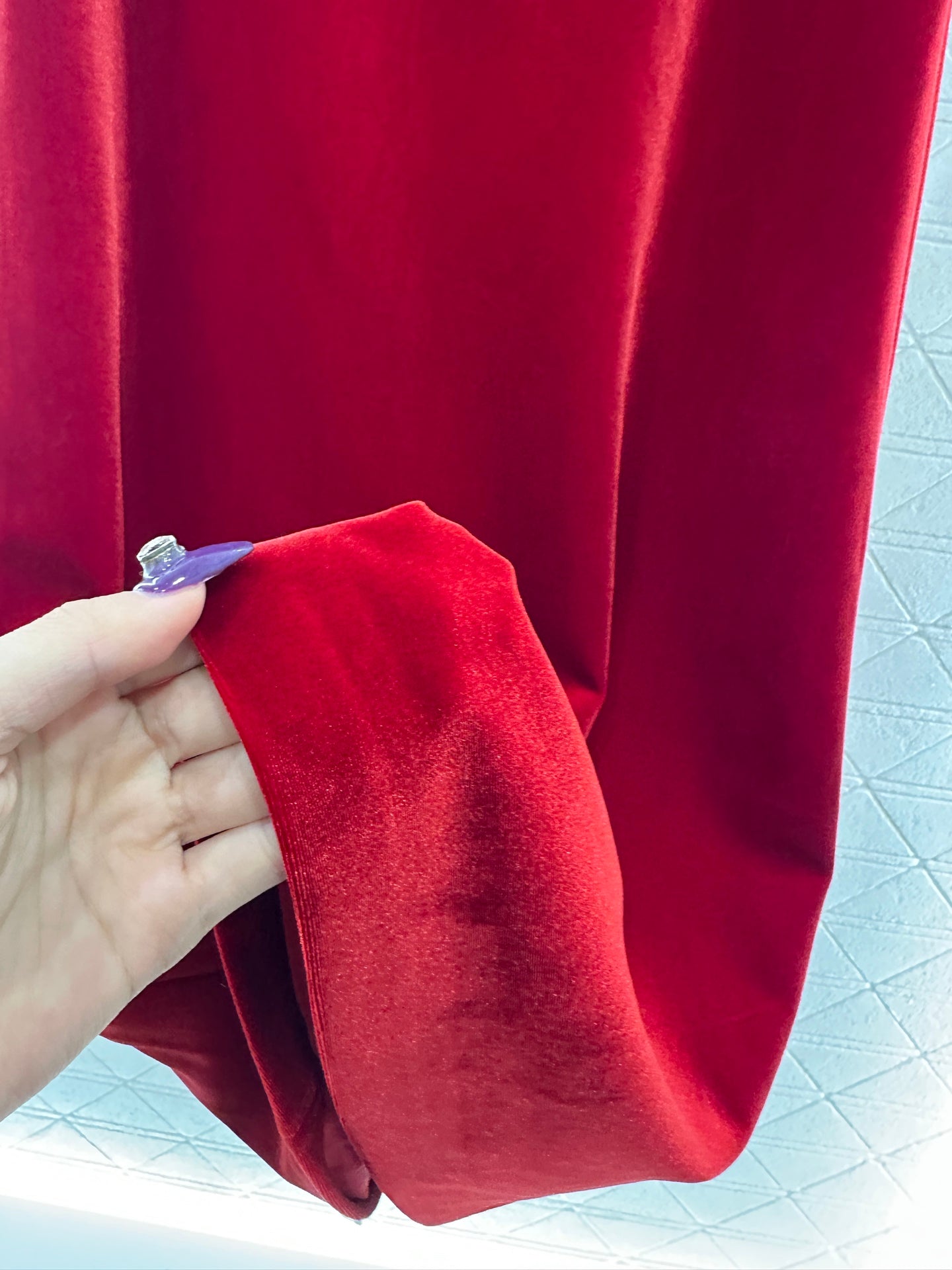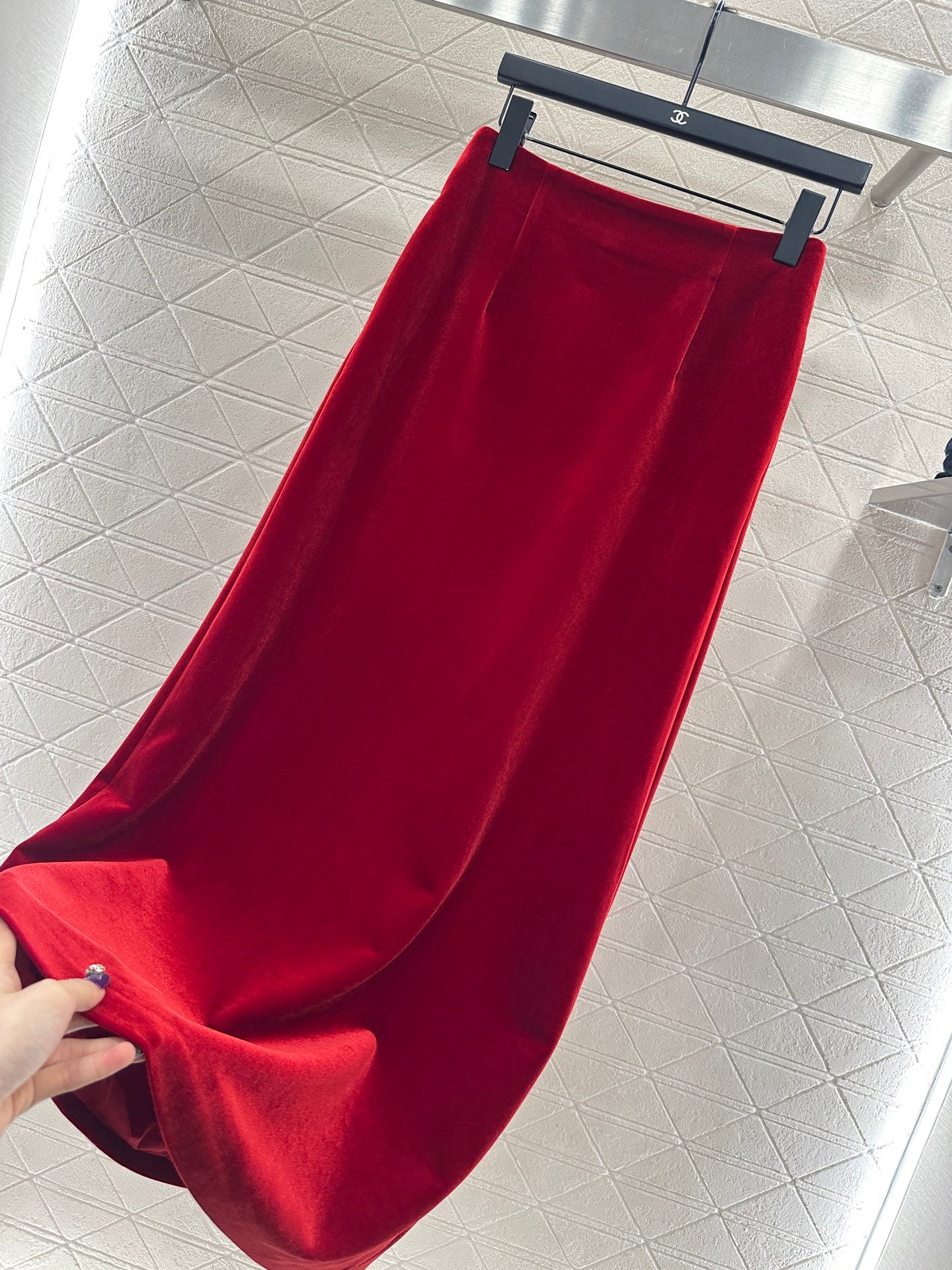 Velvet material, glossy texture, comfortable drape, lapel suit style, dark red velvet soft and reflective throughout, elegant temperament, single button fixed front, matched with irregular half moon shaped hem, showing artistic tone. The back waist slit is three-dimensional and inclusive, paired with the same series of high waisted straight tube micro A mid length half skirts, the complete set is full of temperament, and the red set is just needed at the end of the year.
