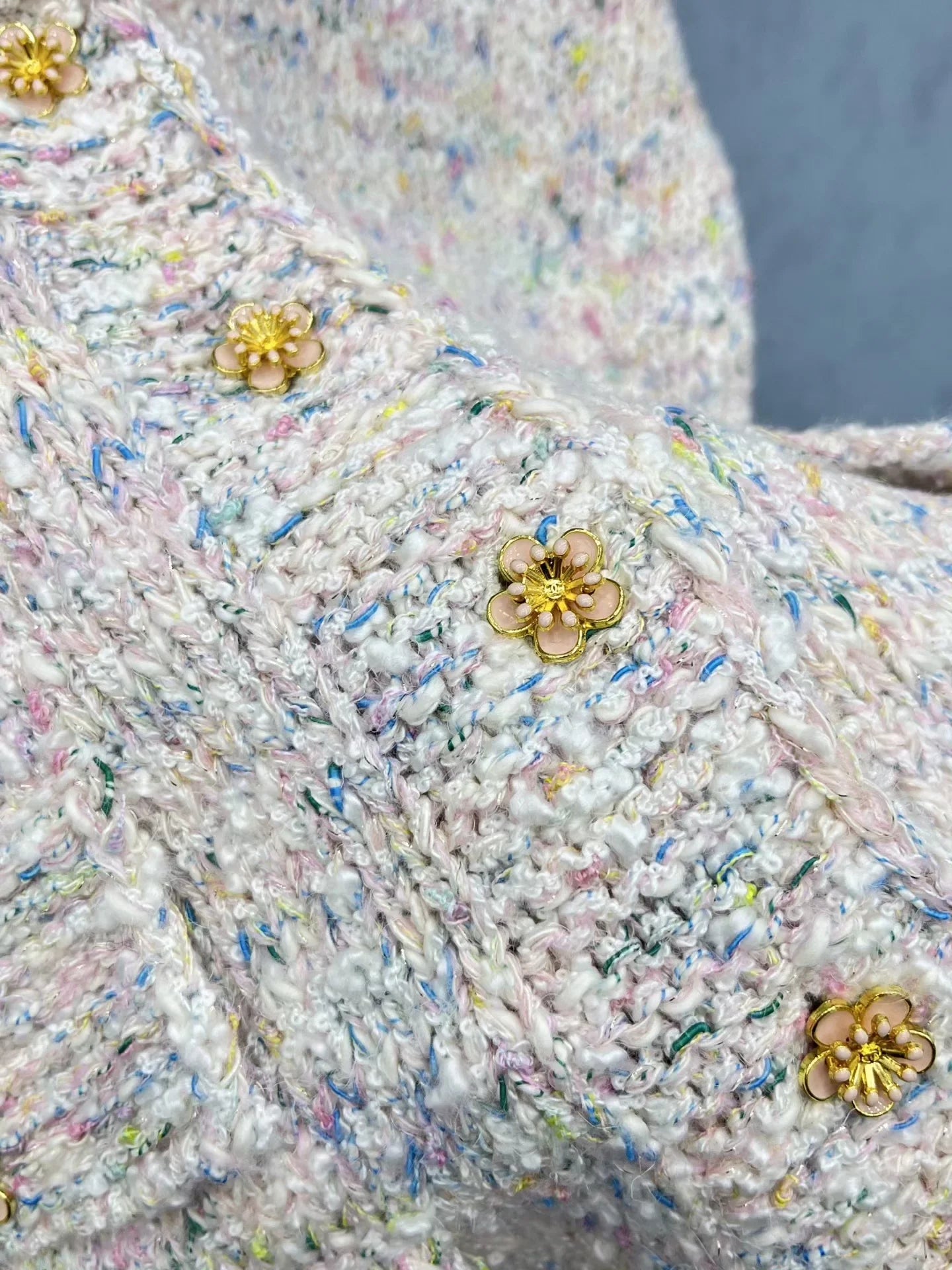 This wool blend multicolored yarn knitting technique creates a hazy, matte texture through its interwoven colors. It retains the softness of knitwear while exuding a subtly luxurious, effortless elegance. The classic lapel and half-open design features vertical ribbed detailing at the neckline, adding depth and texture, and is adorned with a few vintage metal buttons, revealing a touch of understated sophistication.