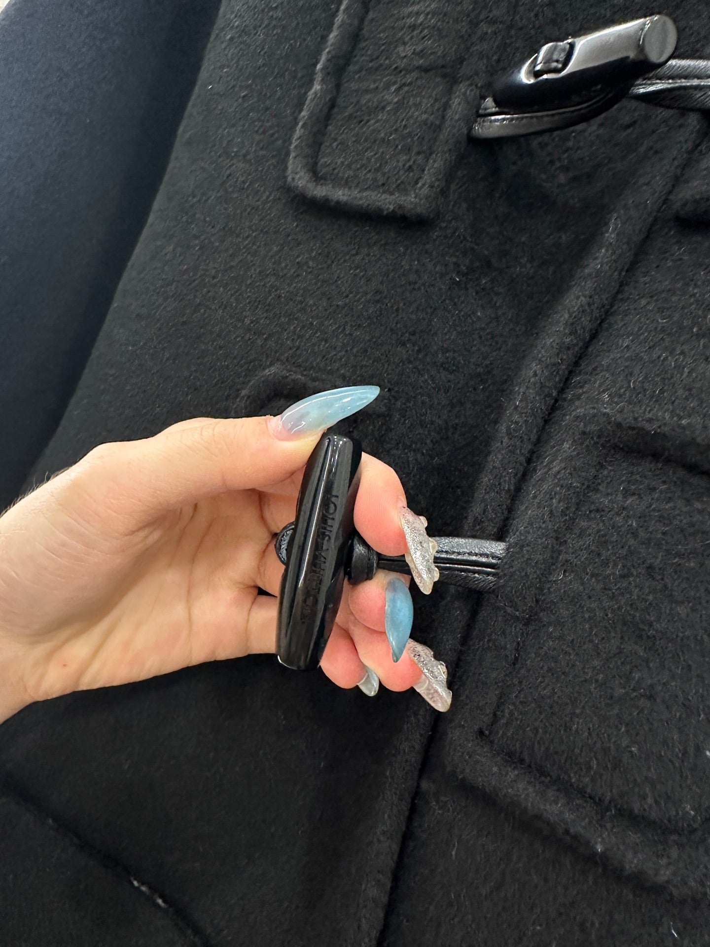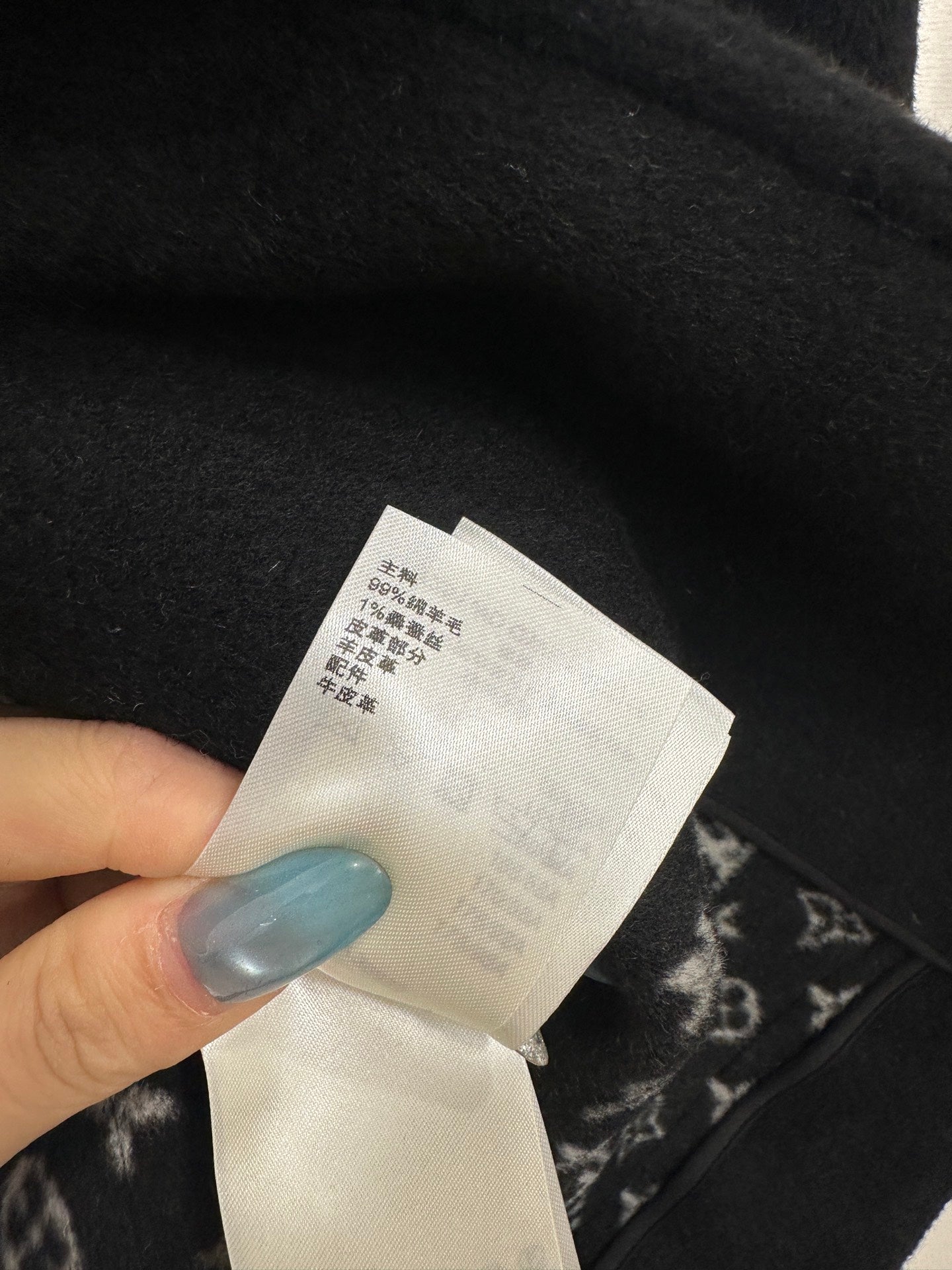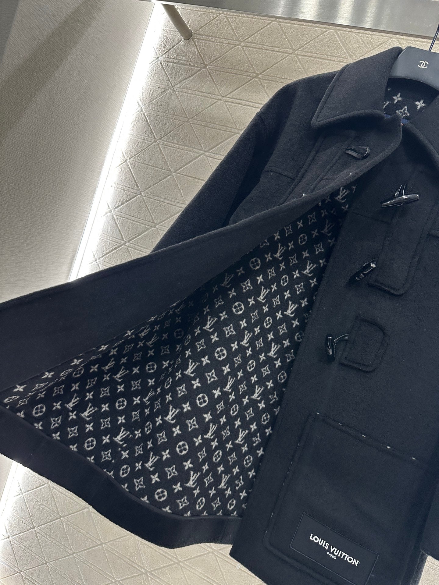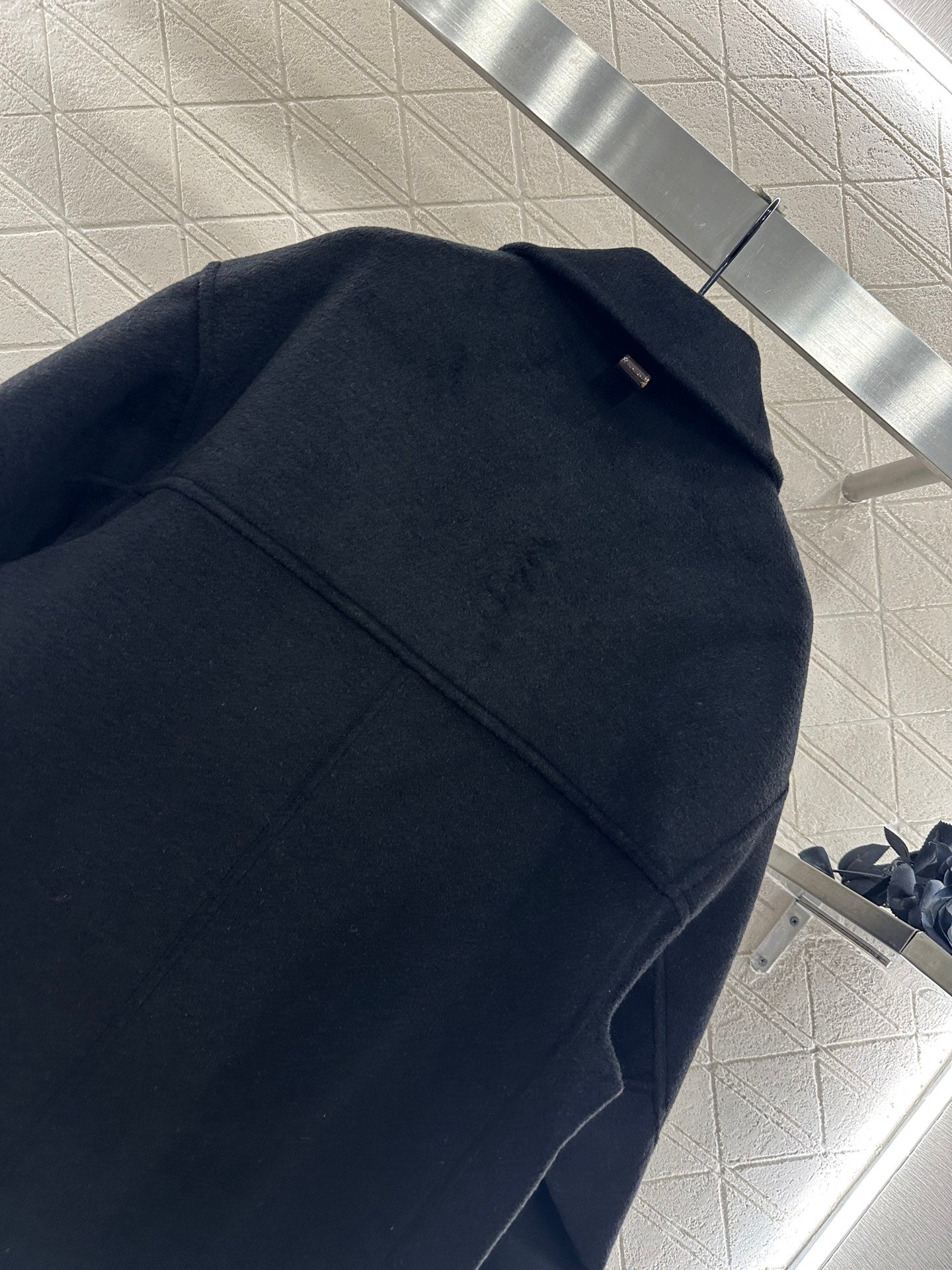 Made of 100% wool material, with excellent texture and appearance, this long double-sided nylon coat features a timeless minimalist design adorned with a single row of cow horn buckles, creating a fashionable and high-end atmosphere. The contour lines are complemented by large capacity pockets, creating rich layers. The letter logo on the hem echoes the four leaf clover letter jacquard lining, showcasing the brand's style. The gray black color is stable and versatile, with no restrictions on the style. The straight tube H-shaped design accommodates the body and exudes a luxurious and relaxed atmosphere, exuding a strong autumn and winter aura.