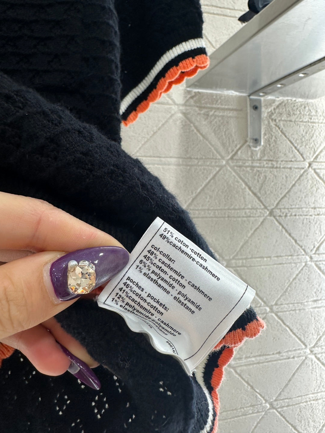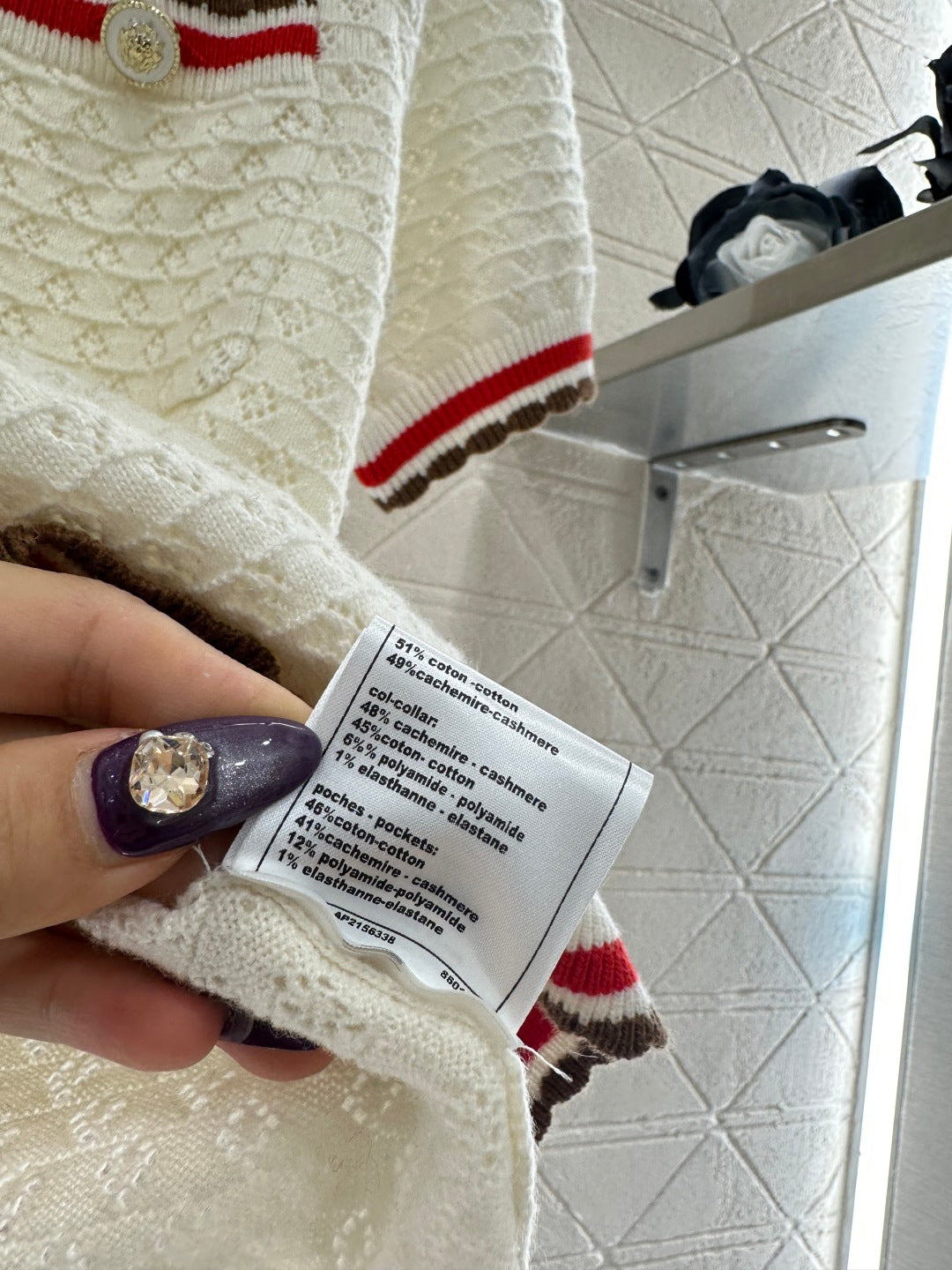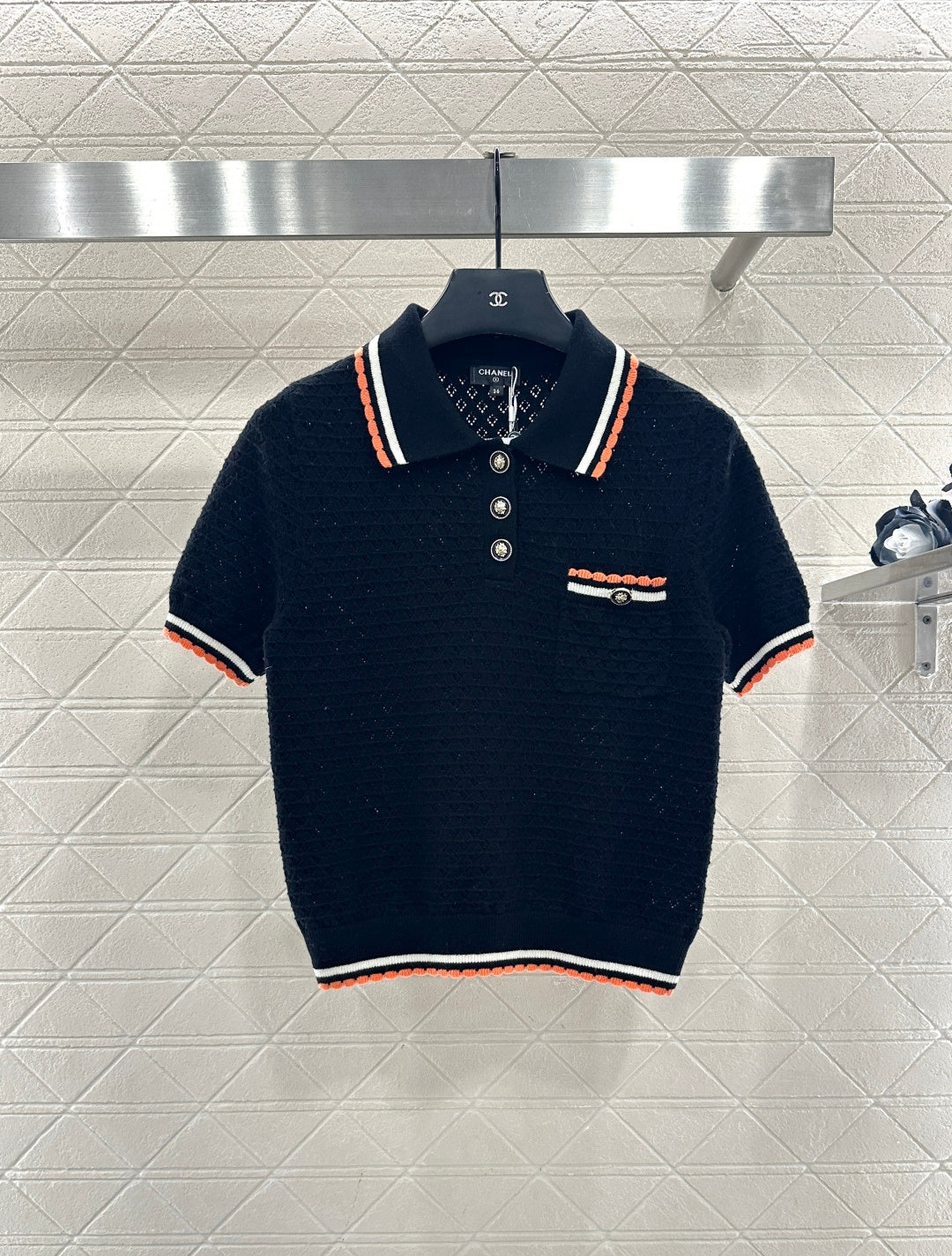 Woven from cashmere yarn with a fine knit, this fabric boasts a soft, comfortable feel against the skin. It features a turn-down collar, half-open placket, and short-sleeved knit design. The main body is adorned with horizontally arranged openwork crochet textures, round camellia buttons, and other details, exuding elegance. Contrasting trim extending from the collar and front to the hem and cuffs, along with matching edges on the pockets, adds depth and visual interest to the design, resulting in a stylish and chic look.