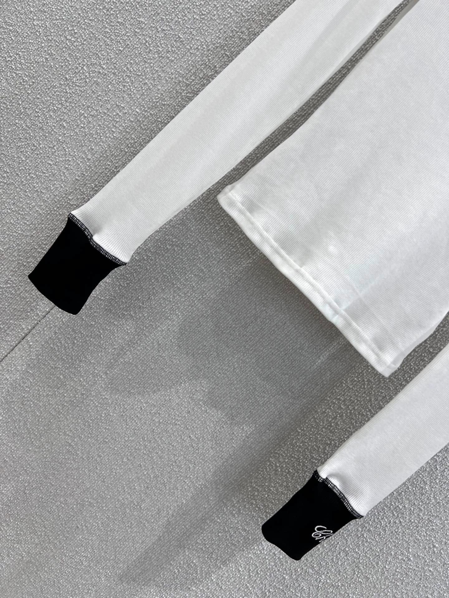 Stretch ribbed knit, close-fitting yet not constricting; soft and skin-friendly, perfect for layering in autumn and winter for warmth and a slimming effect; round Henley collar with contrasting topstitching, and embroidered logo on the cuffs will appeal to vintage lovers; the fitted silhouette perfectly accentuates your figure, understated yet sophisticated.