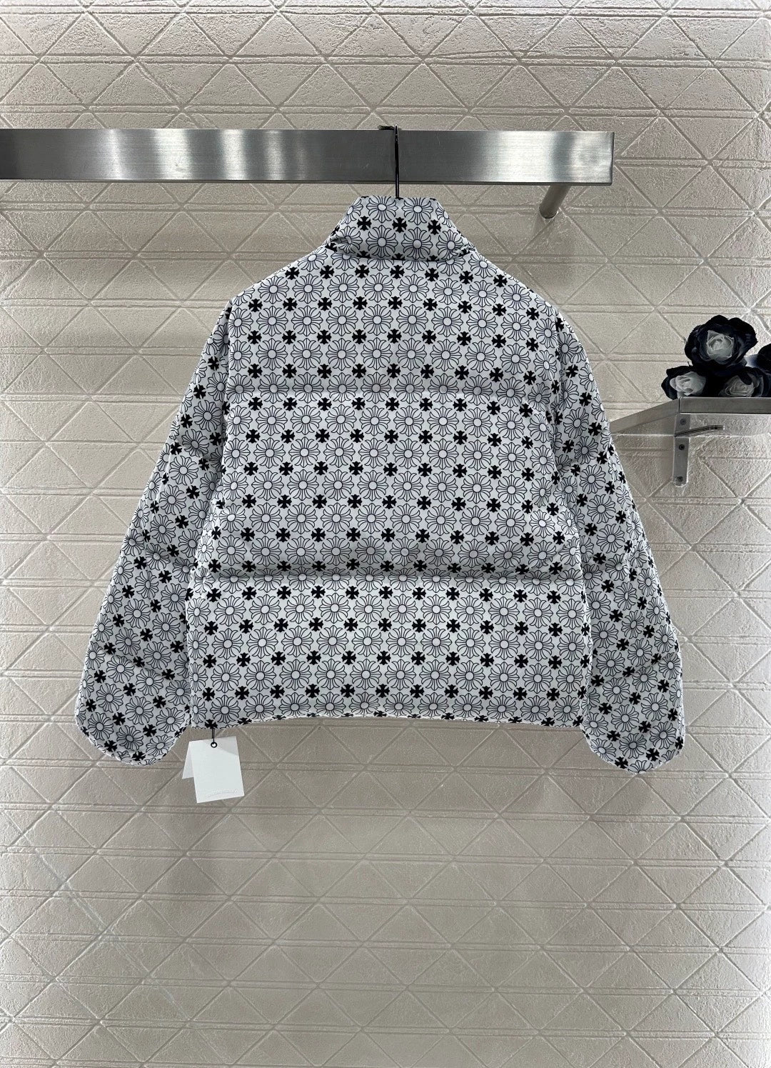 Windproof and waterproof nylon material, filled with down cotton lining, the whole piece is lightweight and warm, with zipper pockets, stand up collar, long sleeved design, and adjustable elasticity. The outer rectangular embossed pattern outlines rich layers, fashionable and stylish, with a black and white iris cross logo as decoration, and the inner pocket printed logo echoes