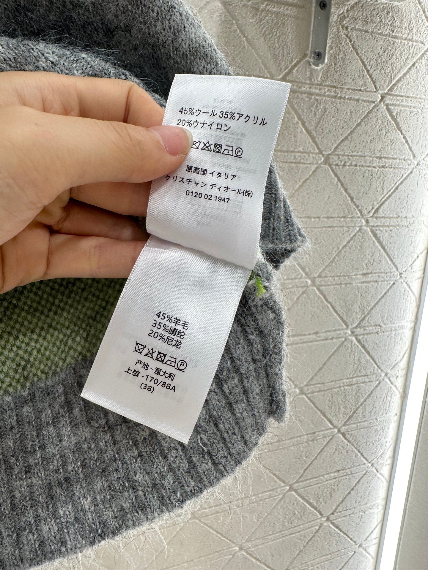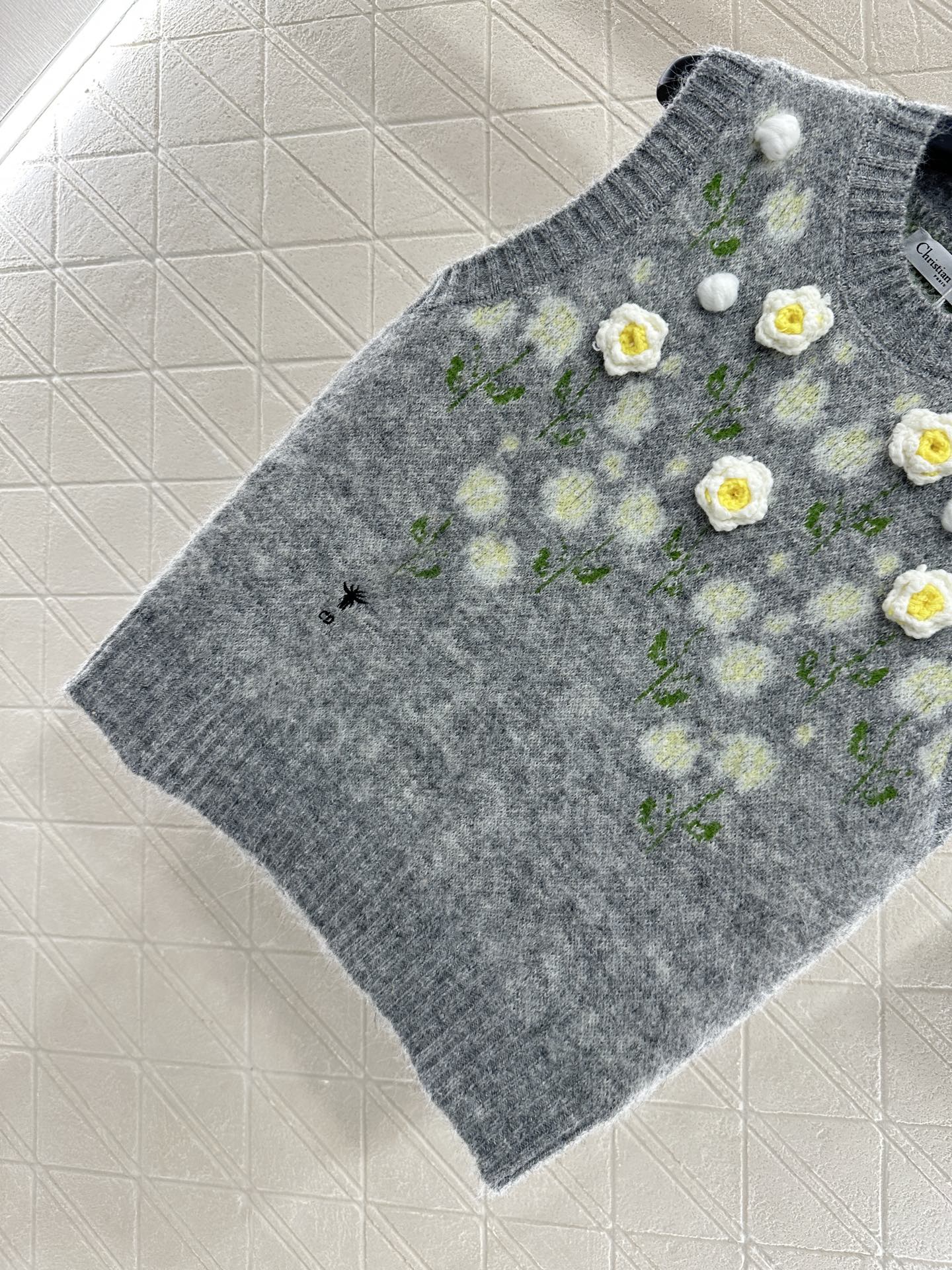 Wool yarn weaving texture delicate, soft, comfortable round neck knitted vest cutting collar cuff spiral pattern edging delicate and soft large body collar extends to the chest and waist with colorful yarn and embroidery technology outlining flower patterns and positioning embellishment three-dimensional weaving hook flowers deepen the design sense vividly and increase the youthful atmosphere. The waist side bee logo embroidery embellishment highlights the brand tone