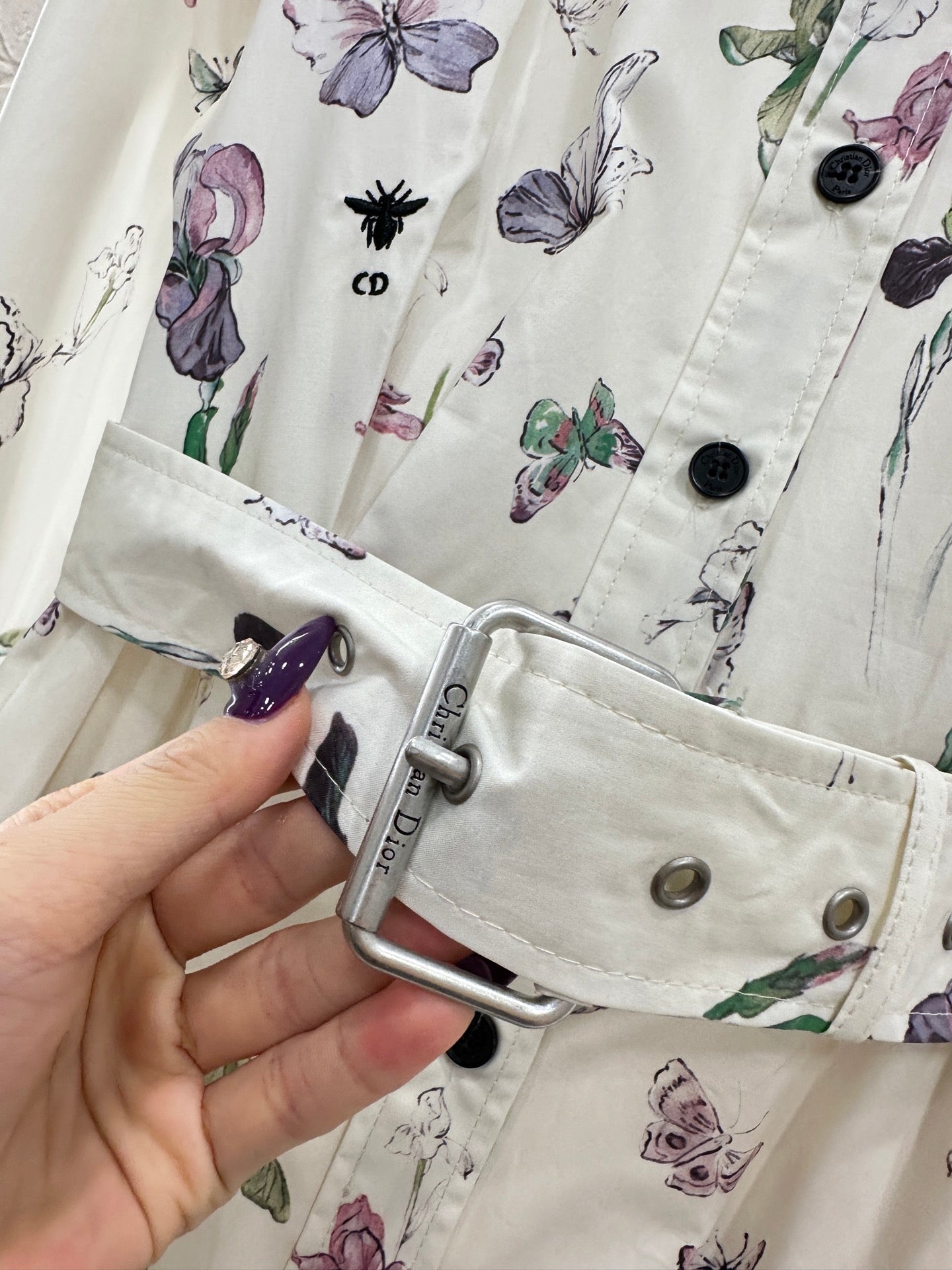 Made of all cotton material, the texture is smooth and comfortable, moisture absorbing and breathable, with a long sleeved dress cut with a lapel, a beige base throughout, and colorful flowers added ➕ Butterfly decoration, sweet and youthful, loose cut silhouette, CD bee embroidery at the waist, paired with this fabric waistband for tight adjustment, highlighting proportion, enhancing body shape, elegant temperament, enhanced by the bee CD logo at the waist, with a clear brand style, suitable for autumn and winter wear, worn alone in spring and summer, full of temperament