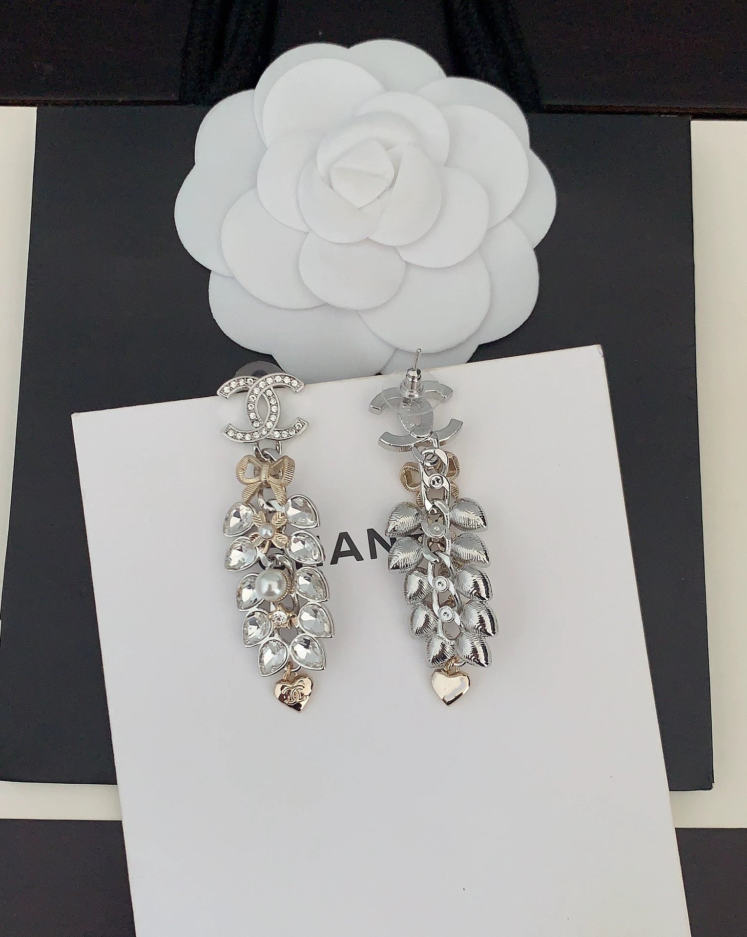 Silver rhinestone wheat ears paired with bow design, exquisite and elegant. The upper double C pendant is embellished, and the hanging heart-shaped pendant is embellished, with exquisite workmanship. Water diamonds and wheat ears paired with pearl decorations, paired with bows and heart-shaped pendants, are exquisite, generous, and elegant. The upper ear has a strong presence, and when paired with a skirt or suit, it is very high-end, showcasing a noble temperament