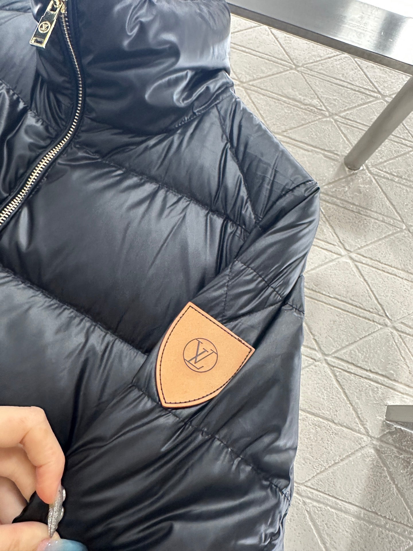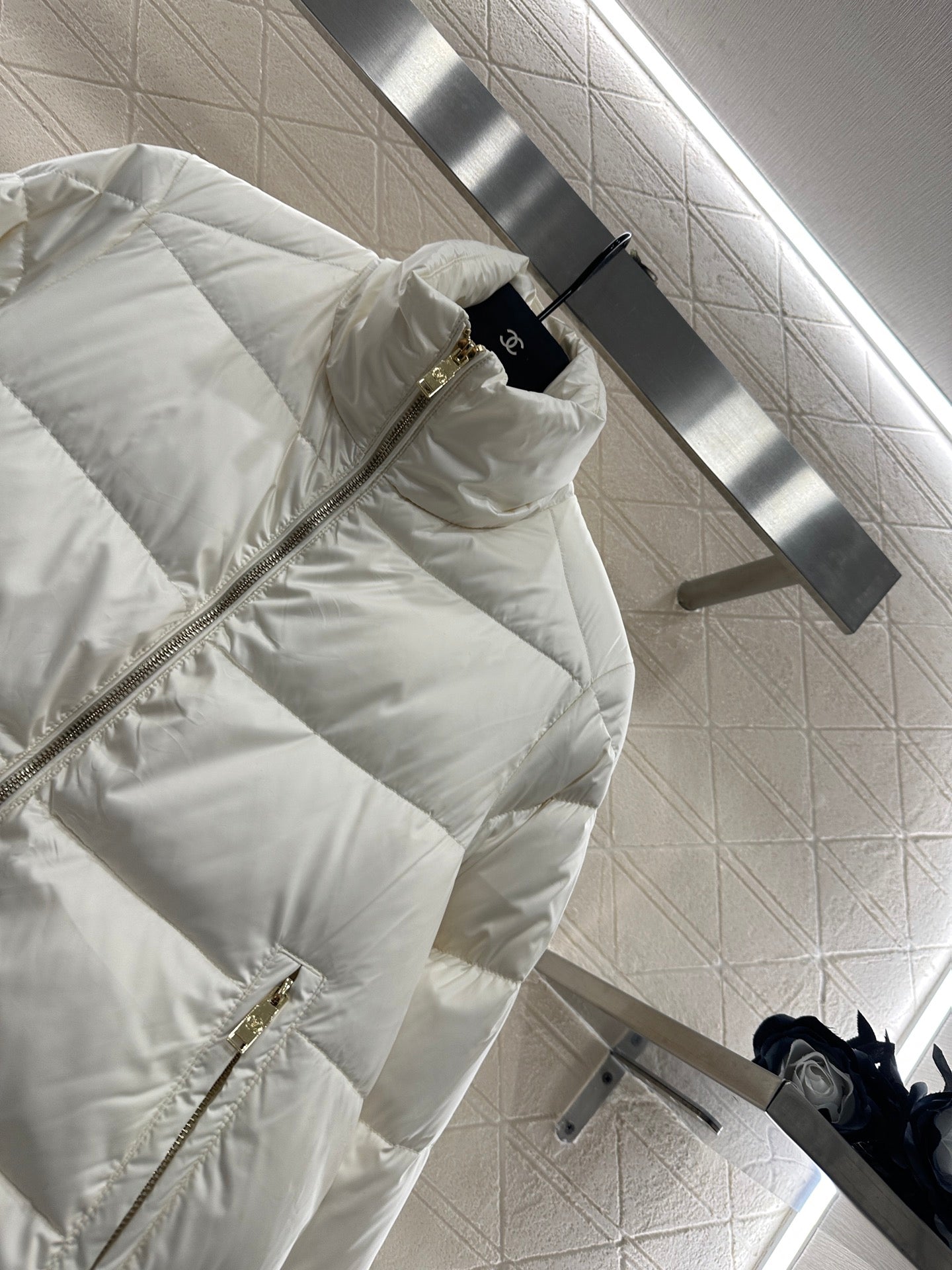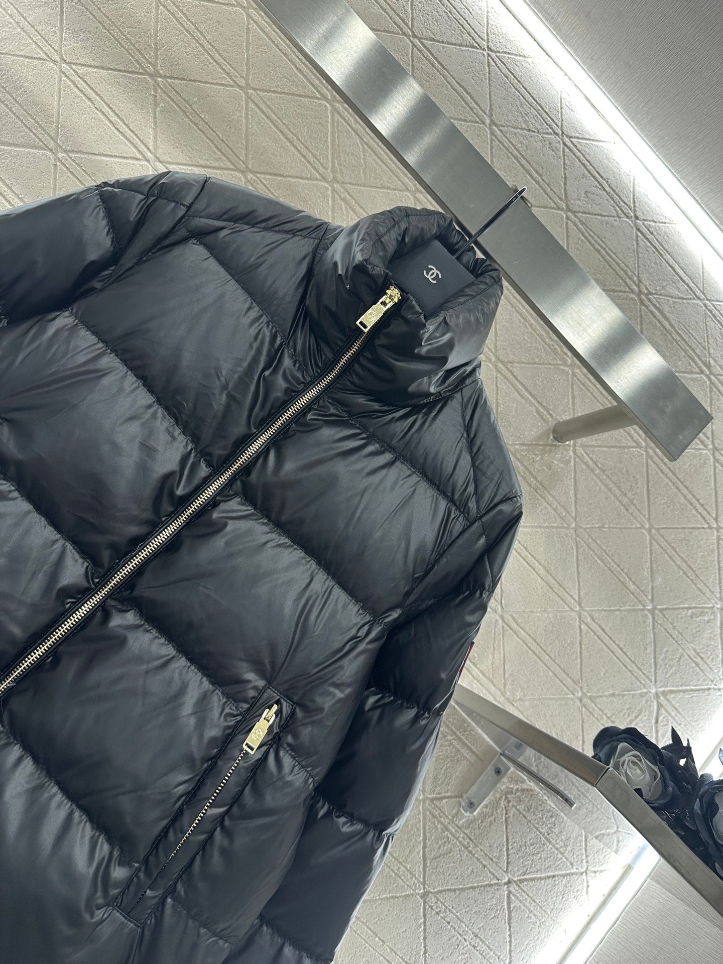 Recycled nylon material, filled with white goose down lining, the whole piece is lightweight and warm, with a stand up down down jacket cut, providing a cool and practical insulation. The jacket adopts a rectangular embossed design, with large capacity zippered pockets on both sides, adding three-dimensional practicality to the outfit. The sleeve side is embellished with the iconic shield leather logo letter logo decoration, presenting the brand concept, and the pearl reflective material is lightweight and fashionable