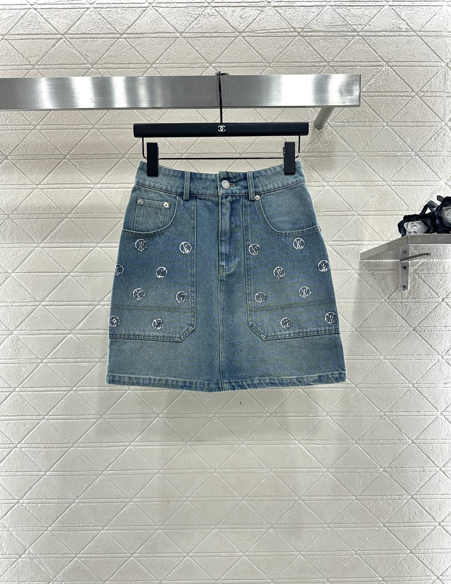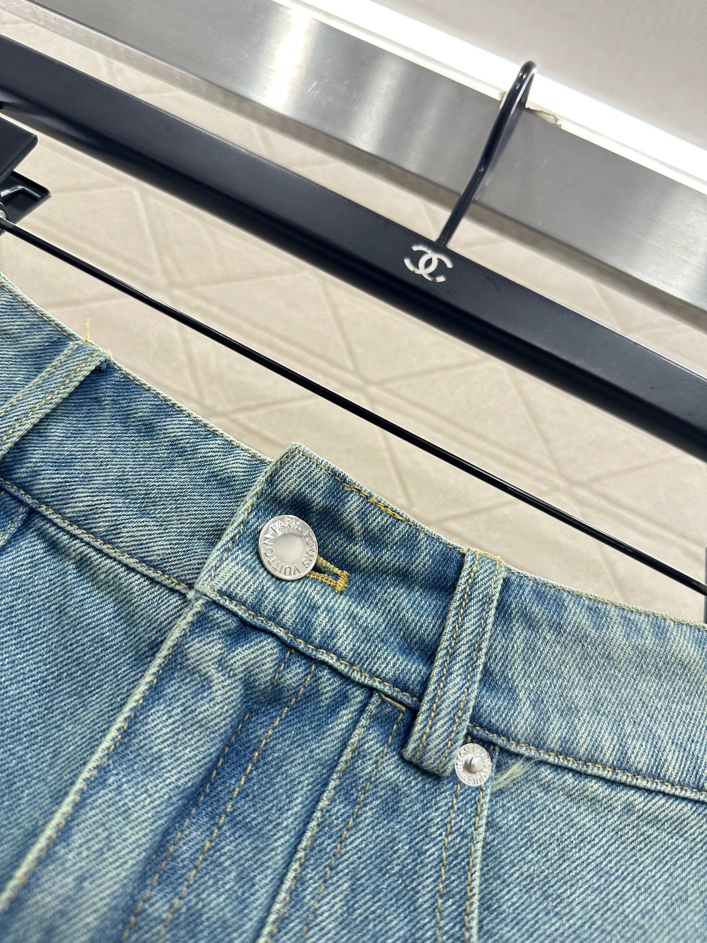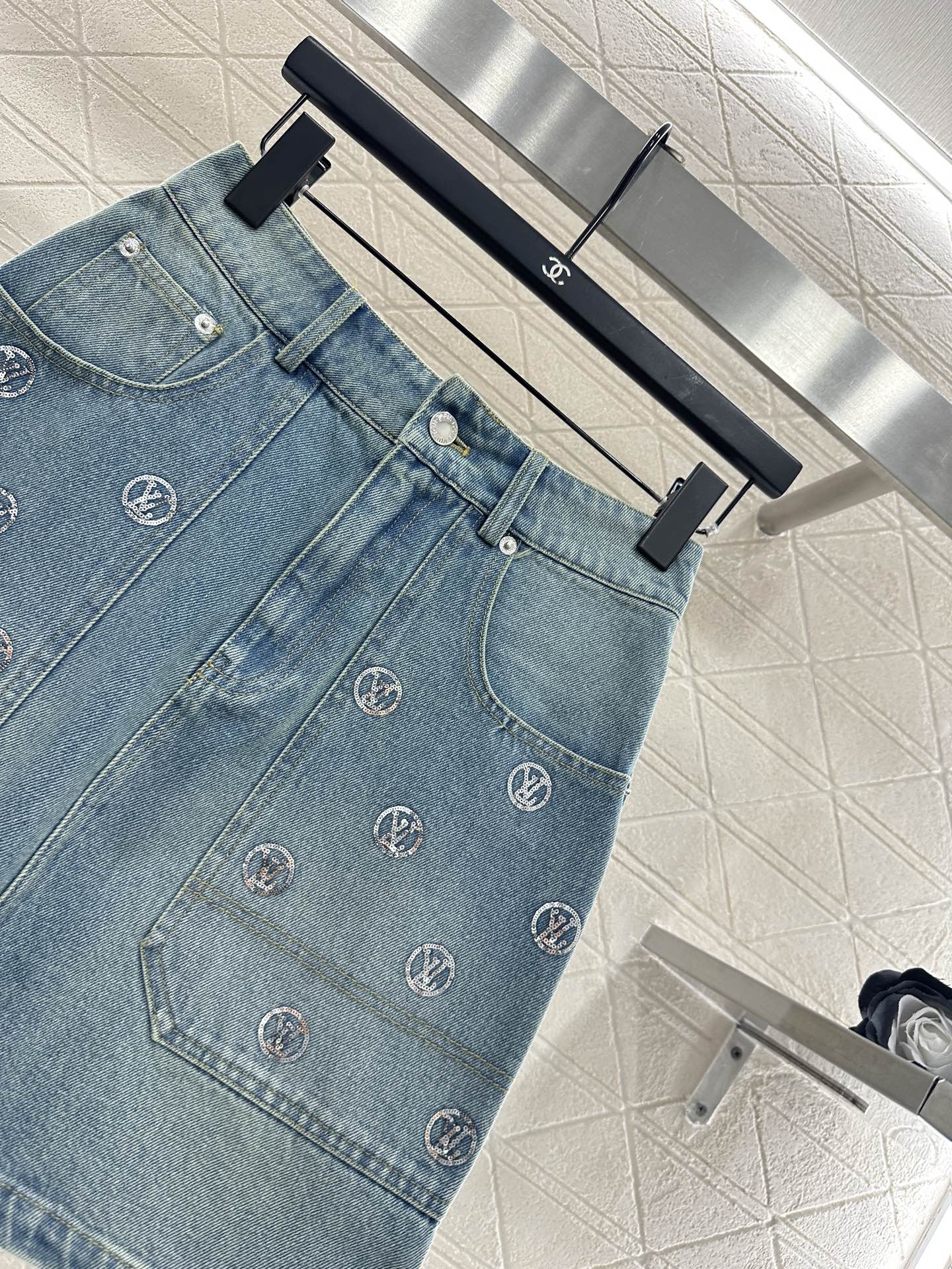 Cotton denim material, multiple washings, presenting a crisp texture. The collar and shoulder denim jacket is cut, and the flip pocket is paired with sequins to outline the LV logo pattern. The style is durable and high-end, echoing the pocket logo and front button, creating a retro and natural neutral and cool fashionable style. Paired with wide leg slightly flared pants of the same series, the bead details on the upper thigh echo the unified style, making it fashionable and eye-catching whether worn as a set or alone, suitable for all seasons.