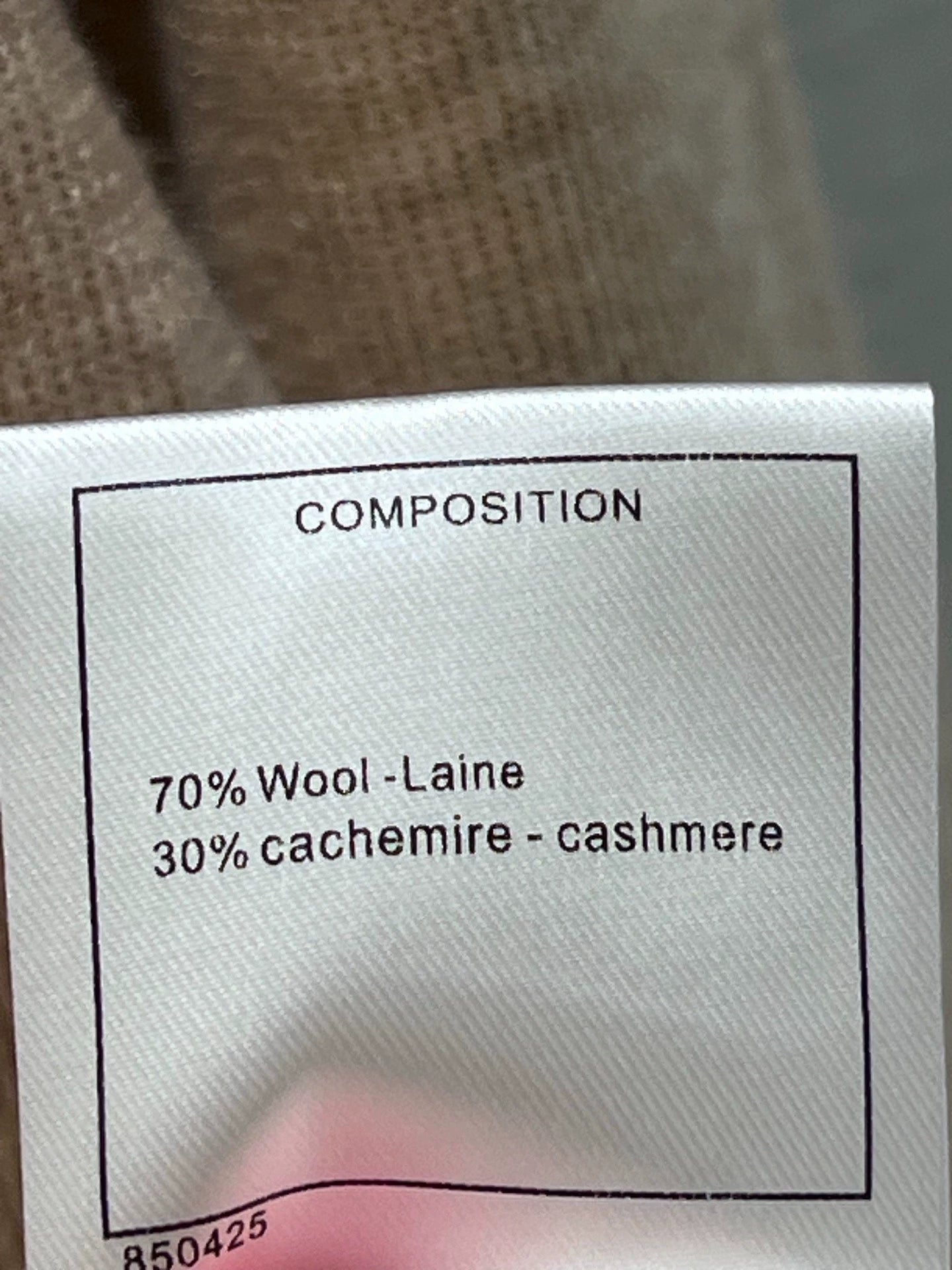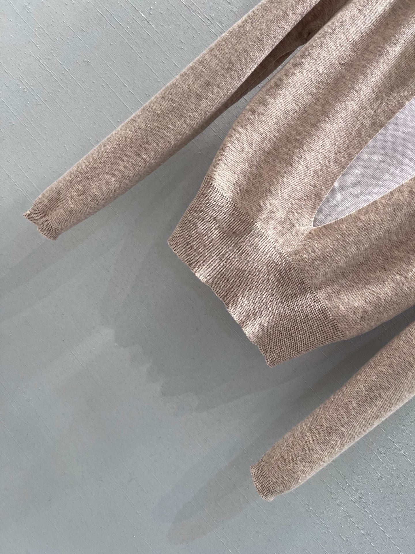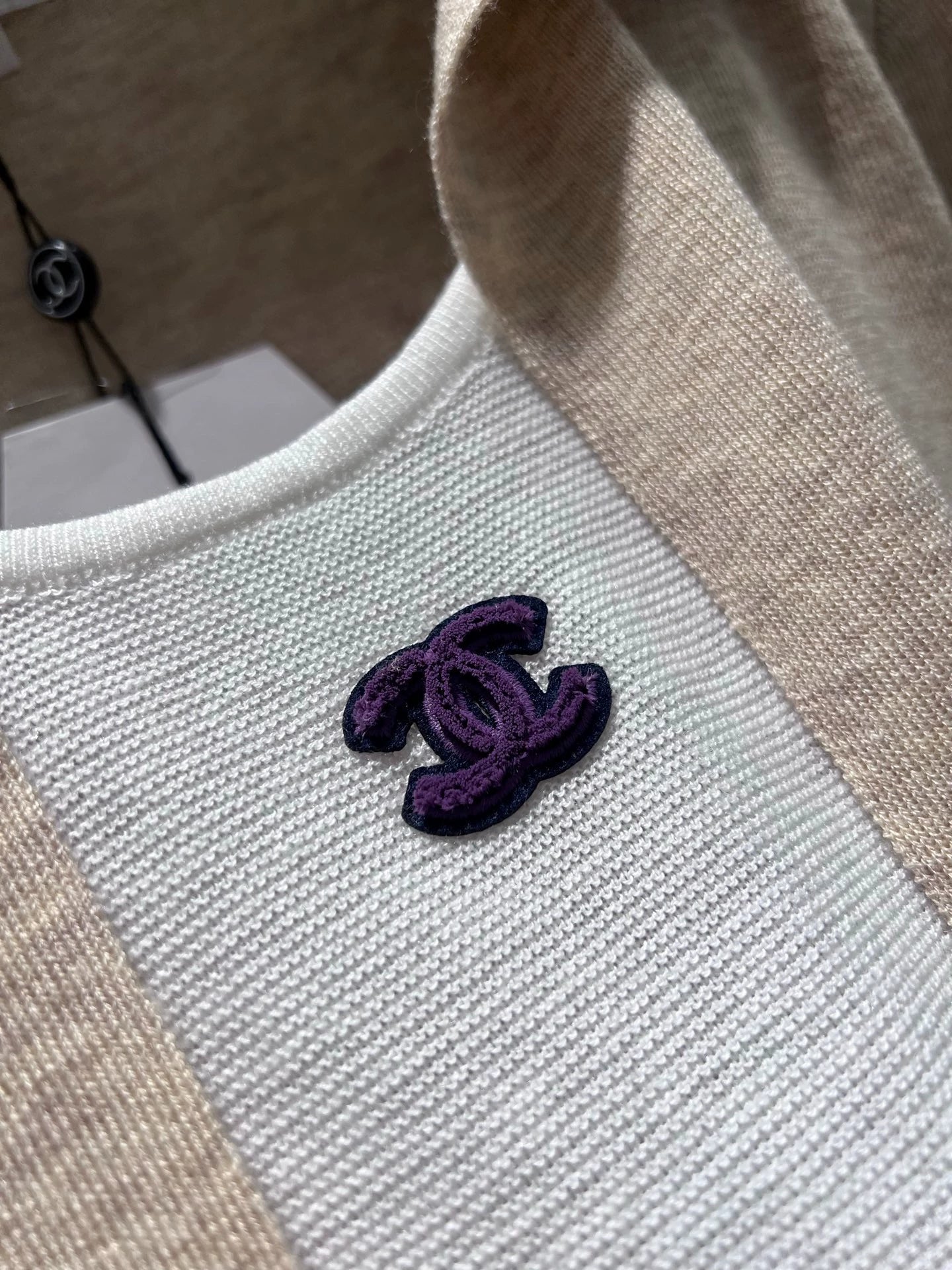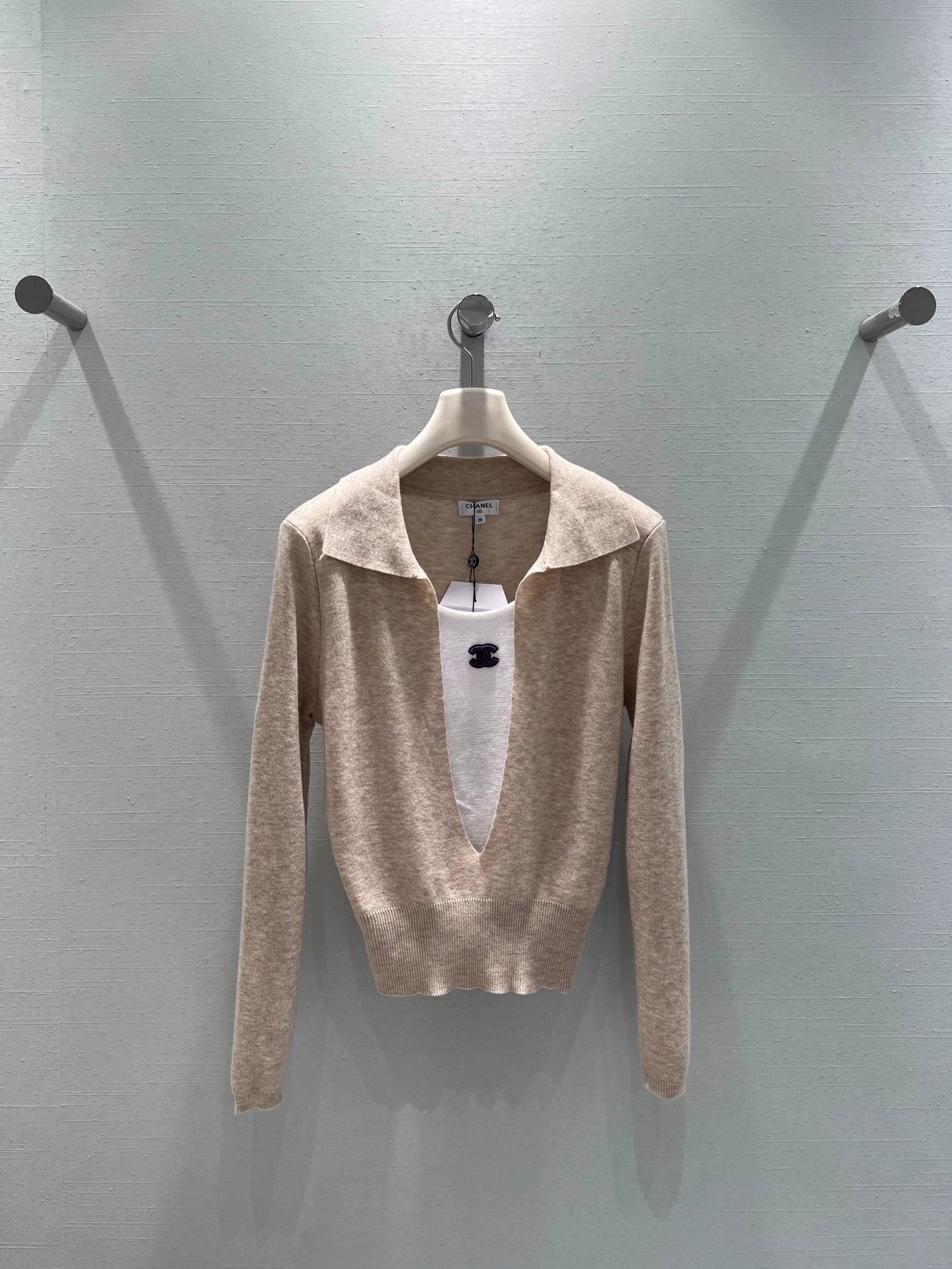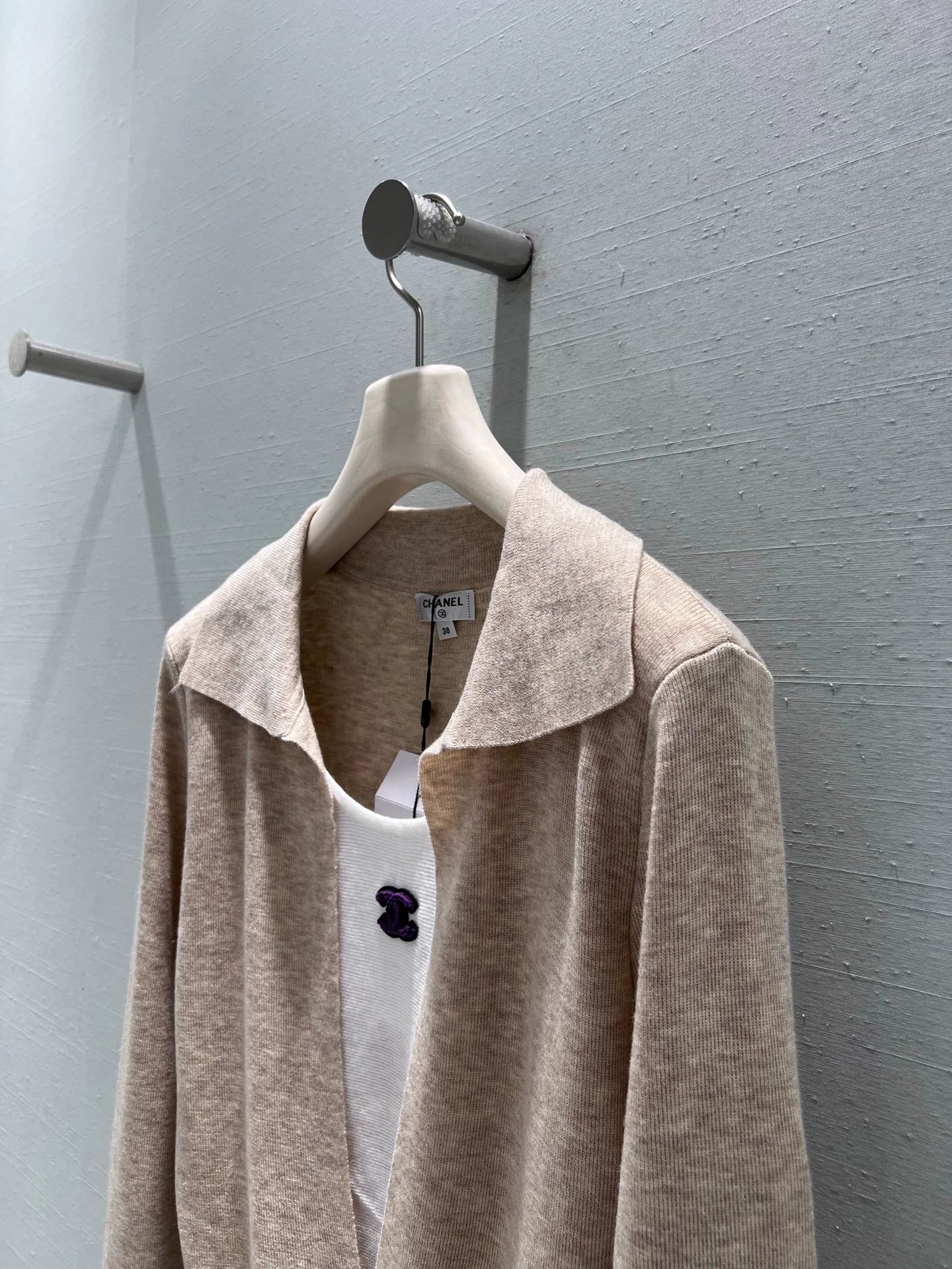 Process description:The knitted fabric has a delicate texture, and the collar design is highly distinctive. The combination of a lapel and a deep V-neck reveals the white lining inside, with the classic double-C logo on the lining.