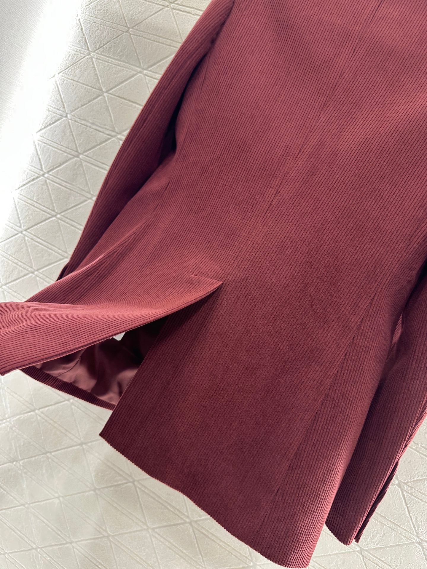 Corduroy material, with a premium and comfortable texture. The style of the lapel suit jacket features a dark red vertical pit stripe that exudes a sense of sophistication. The symmetrical flap pocket design enriches the design hierarchy and adds a touch of fashion. The front placket features double breasted details ➕ The three-dimensional cutting effectively narrows the waist, and the slit at the back waist outlines the curve, making it appear slimmer. The conventional waist cinching version is elegant and retro on the upper body, paired with any pair of pants for a carefree and handsome look