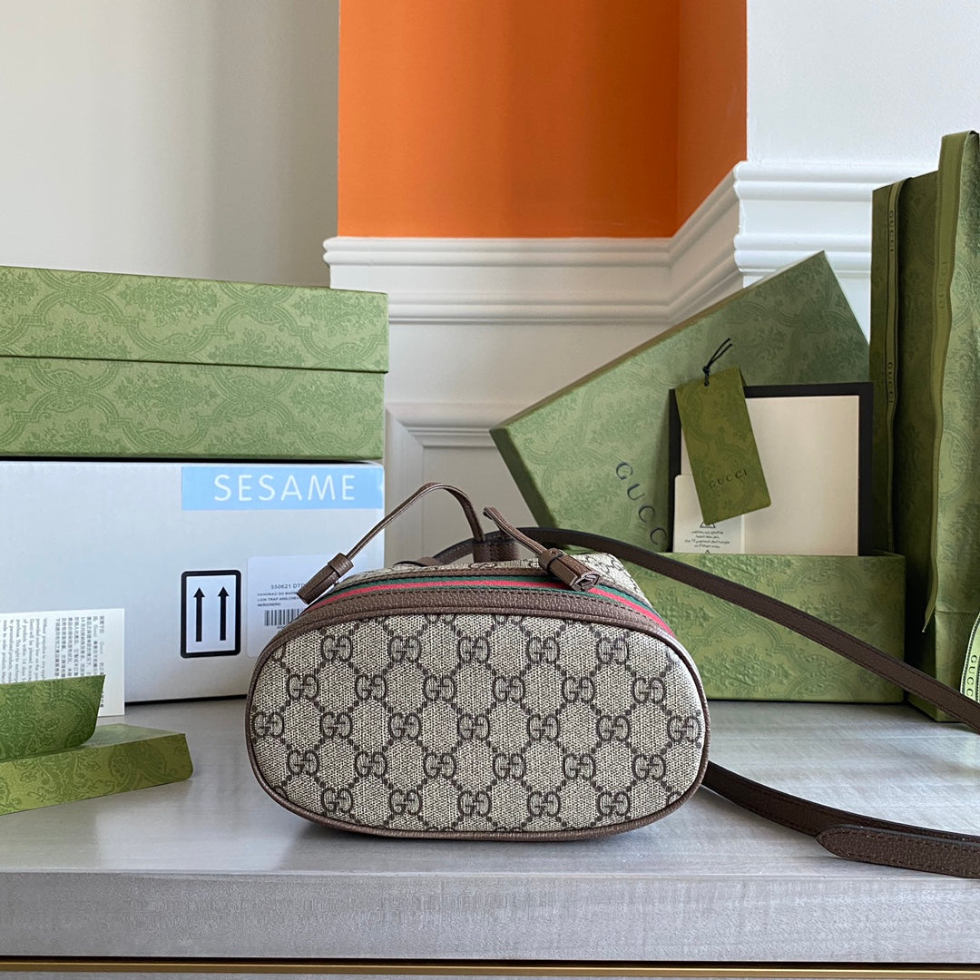 The world of Ophidia evolves with the introduction of a new bucket bag shape. Crafted in GG Supreme canvas with inlaid green and red Web stripe along the bottom. The accessory is completed with a single top handle and detachable shoulder strap for two different ways to wear it.