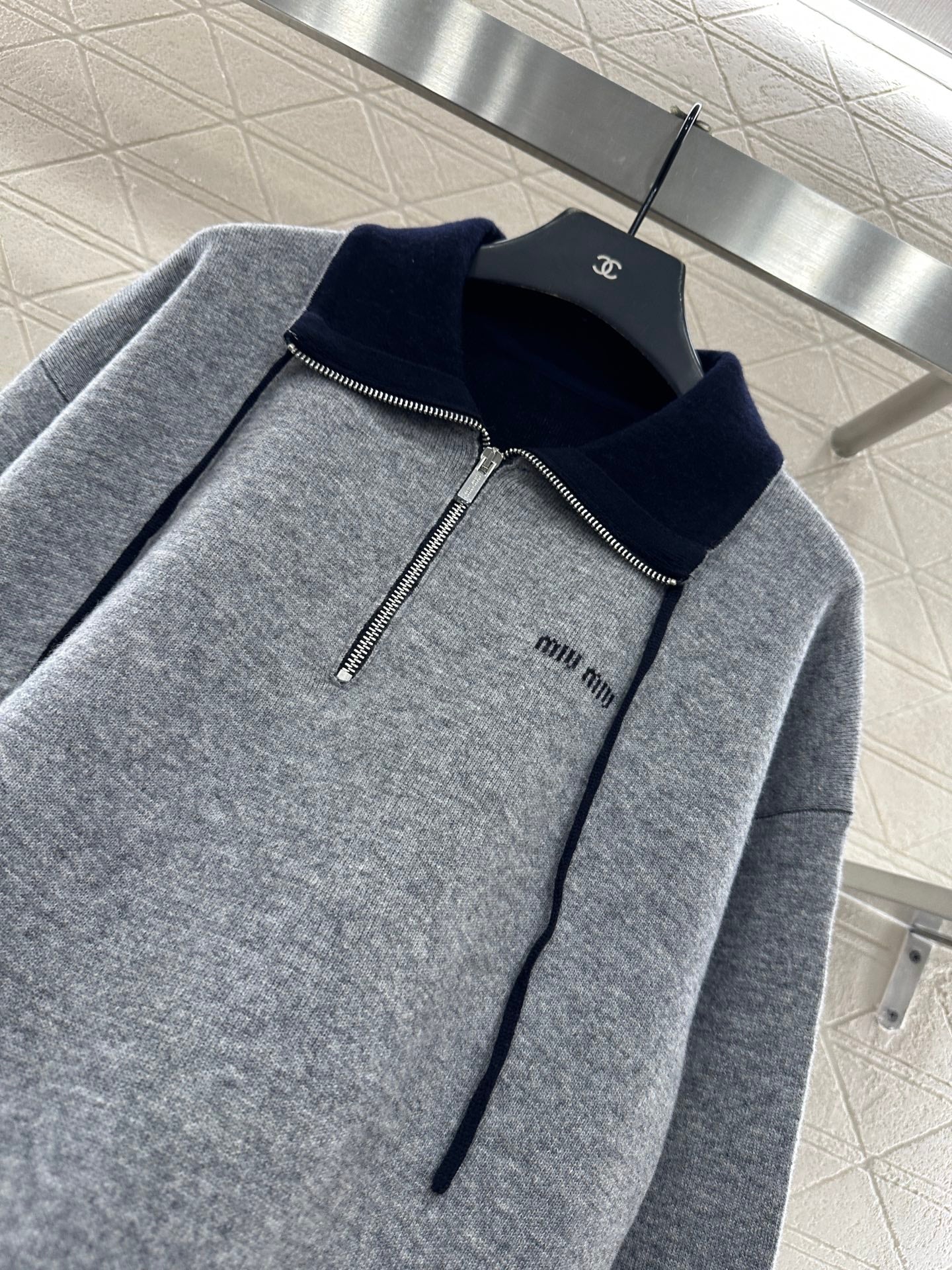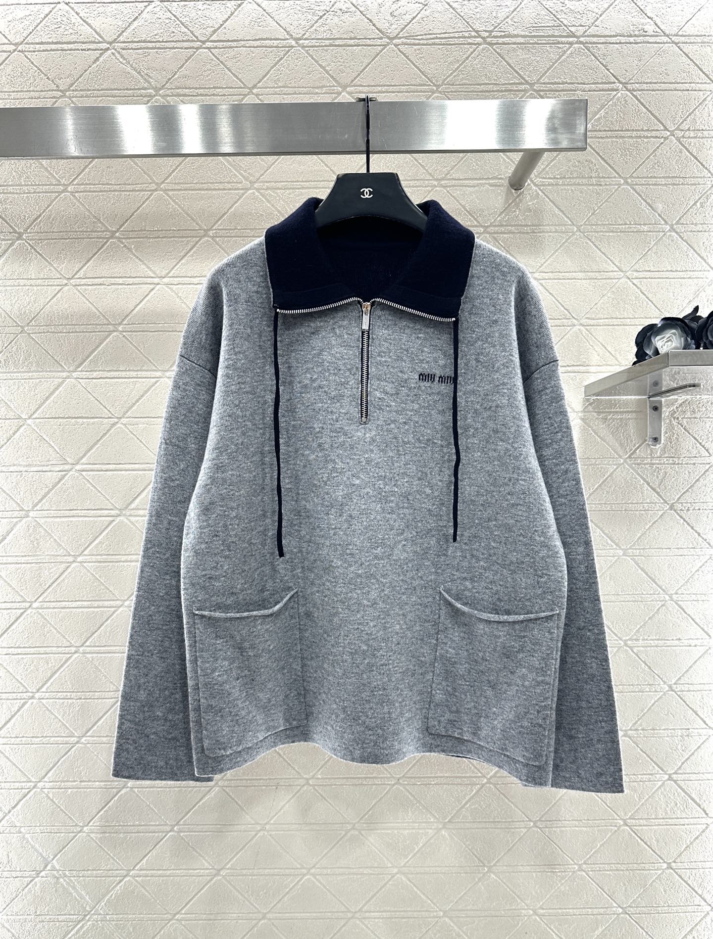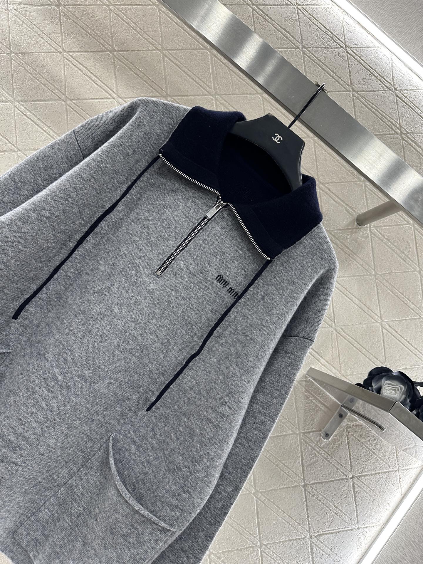 Woolen yarn weaving, premium texture, comfortable and soft, semi open zipper knitted top cut, black contrasting collar edge, unique collision with body light gray, loose silhouette straight tube hem, chest letter logo, paired with symmetrical large pockets on both sides, creating a slimming and fashionable outfit, enhancing detail texture