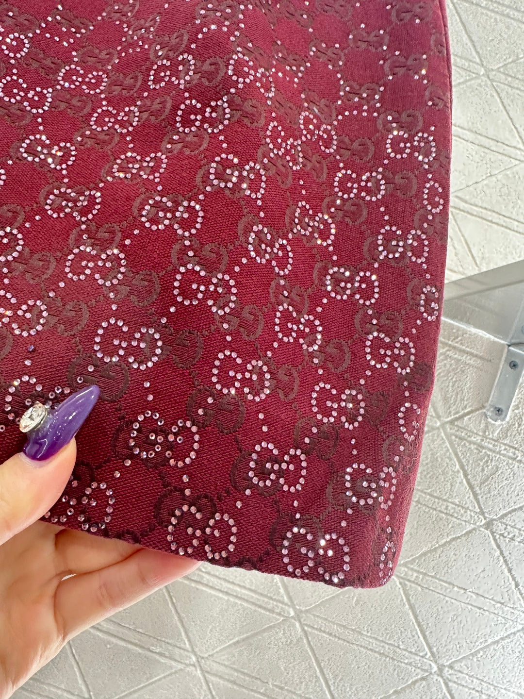 Jacquard material, premium texture, crisp and stylish, with a lapel silhouette for a suit and cotton jacket. The inner lining is embossed with diamond patterned lines and filled with down cotton, providing more practical warmth. The large body is printed with double G jacquard, and the gun lapel is paired with front buttons, creating a high-end and crisp design. Heavy duty rhinestones and double G contrasting colors are embellished from top to bottom, shining up close and gradually with a gradient luster from afar. The design is rich in layers, creating a brand exclusive sweet and cool style. Paired with the same series of straight tube hip hugging short skirts, the details echo and make it a must-have fashion item for autumn and winter