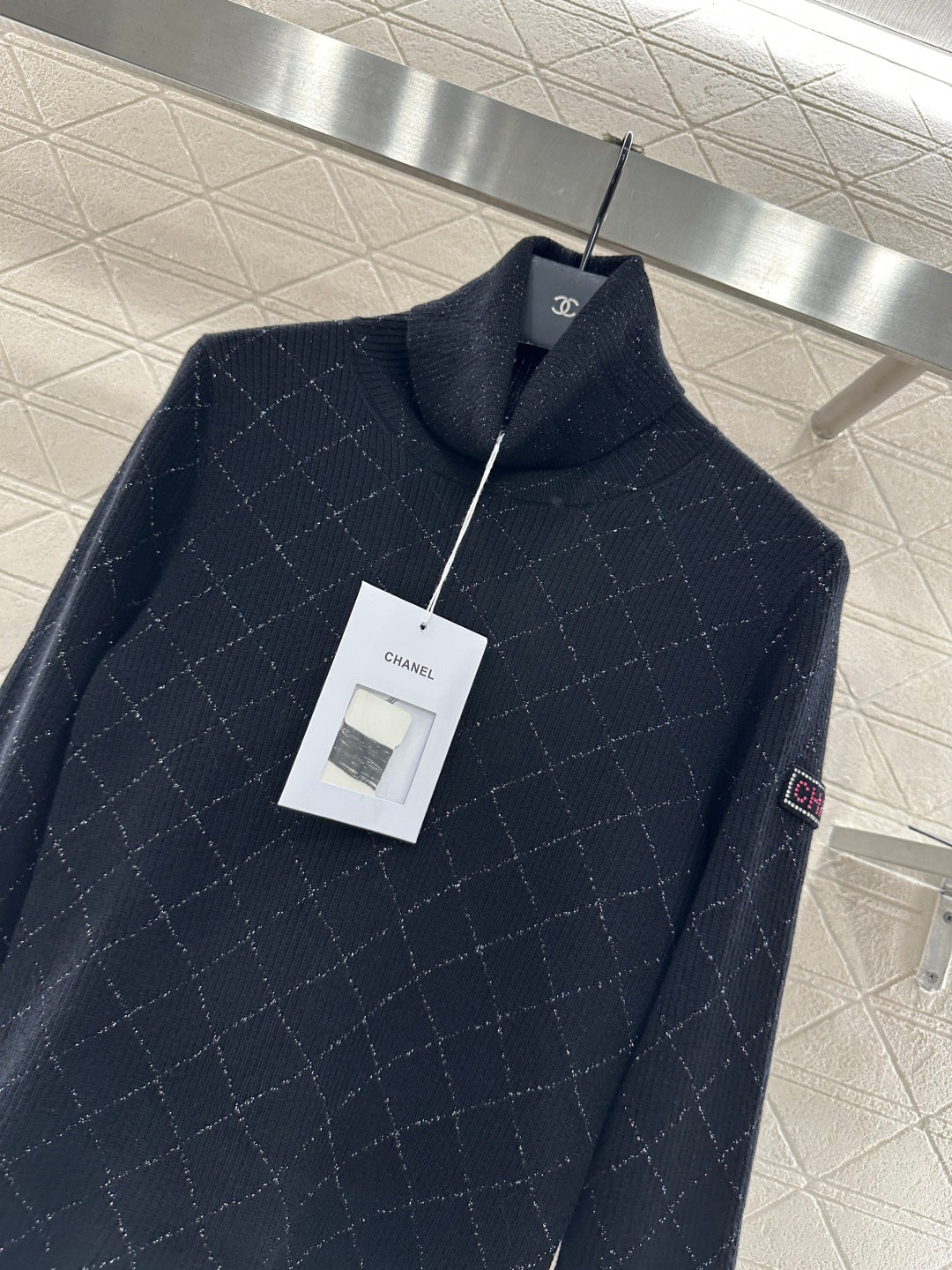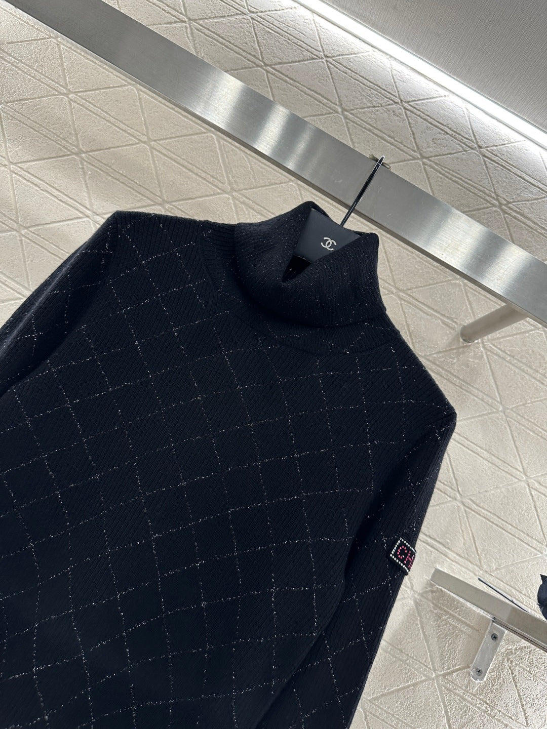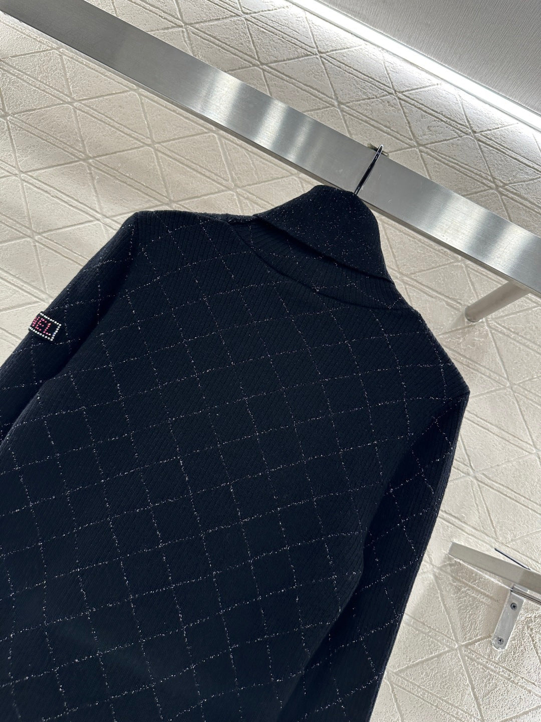 Woolen yarn weaving, delicate texture, comfortable to wear, high neck pullover sweater design, with elastic groove thread edging to narrow, the body is interwoven with two colors, silver yarn outlines the diamond pattern distribution, and the sleeve side is decorated with rhinestone letters and logos, the overall shape is high-end and casual, colliding with a fashionable tone, warm and comfortable on the inside, and fashionable on the outside