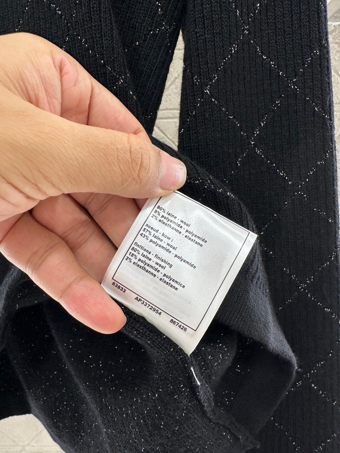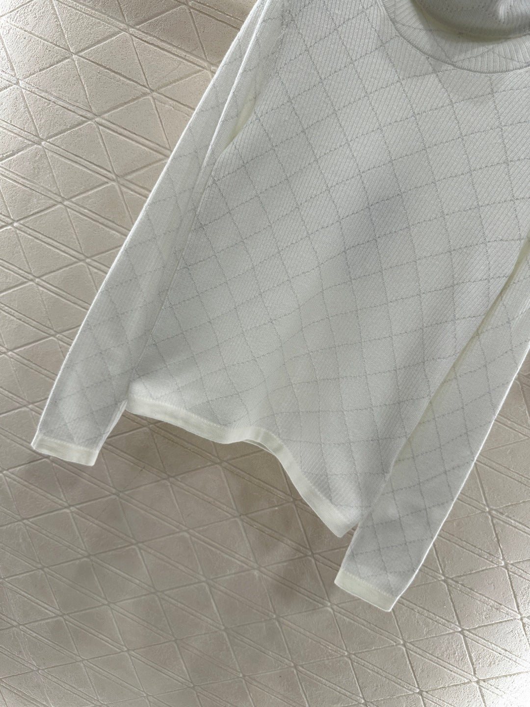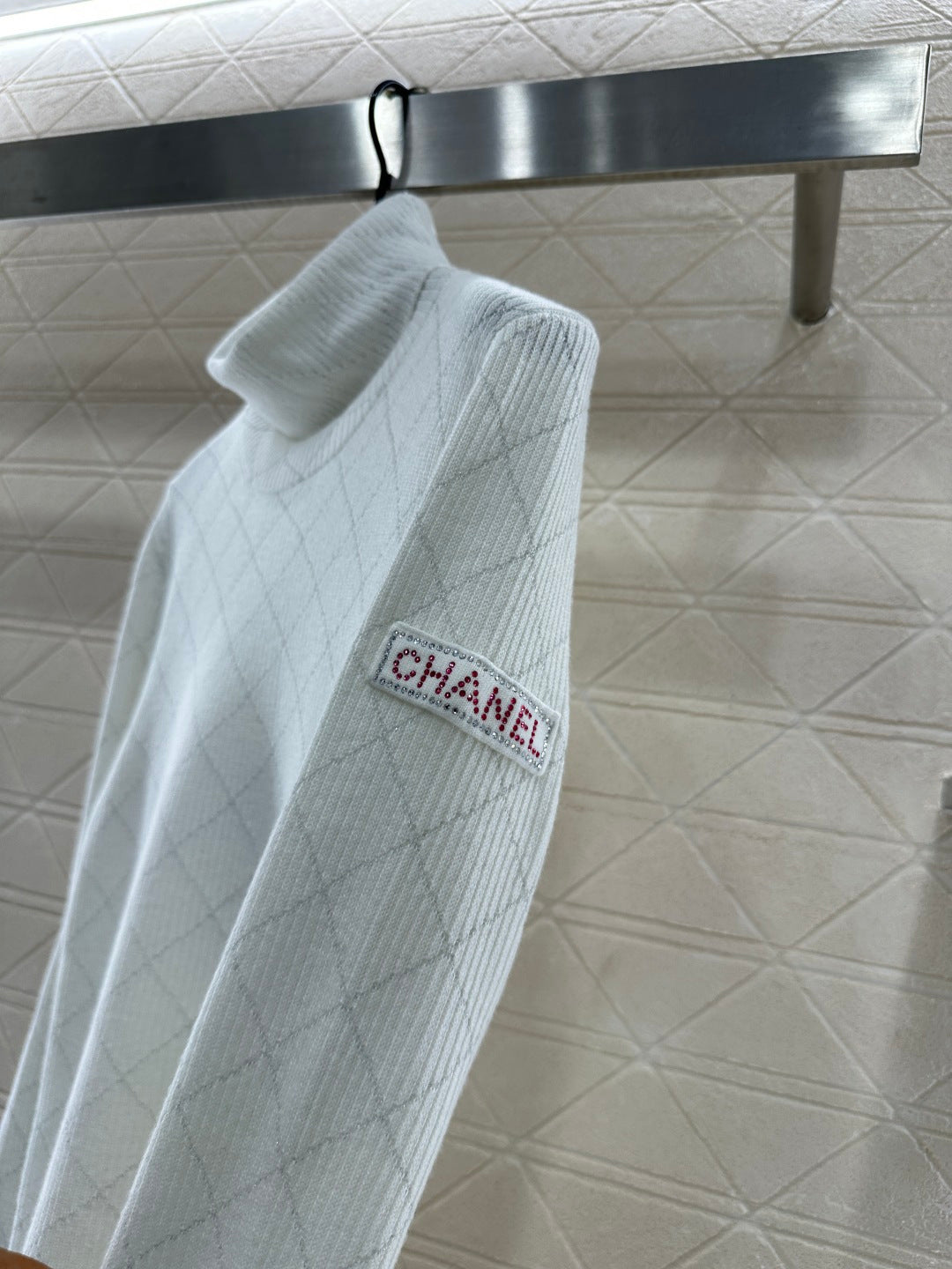 Woolen yarn weaving, delicate texture, comfortable to wear, high neck pullover sweater design, with elastic groove thread edging to narrow, the body is interwoven with two colors, silver yarn outlines the diamond pattern distribution, and the sleeve side is decorated with rhinestone letters and logos, the overall shape is high-end and casual, colliding with a fashionable tone, warm and comfortable on the inside, and fashionable on the outside