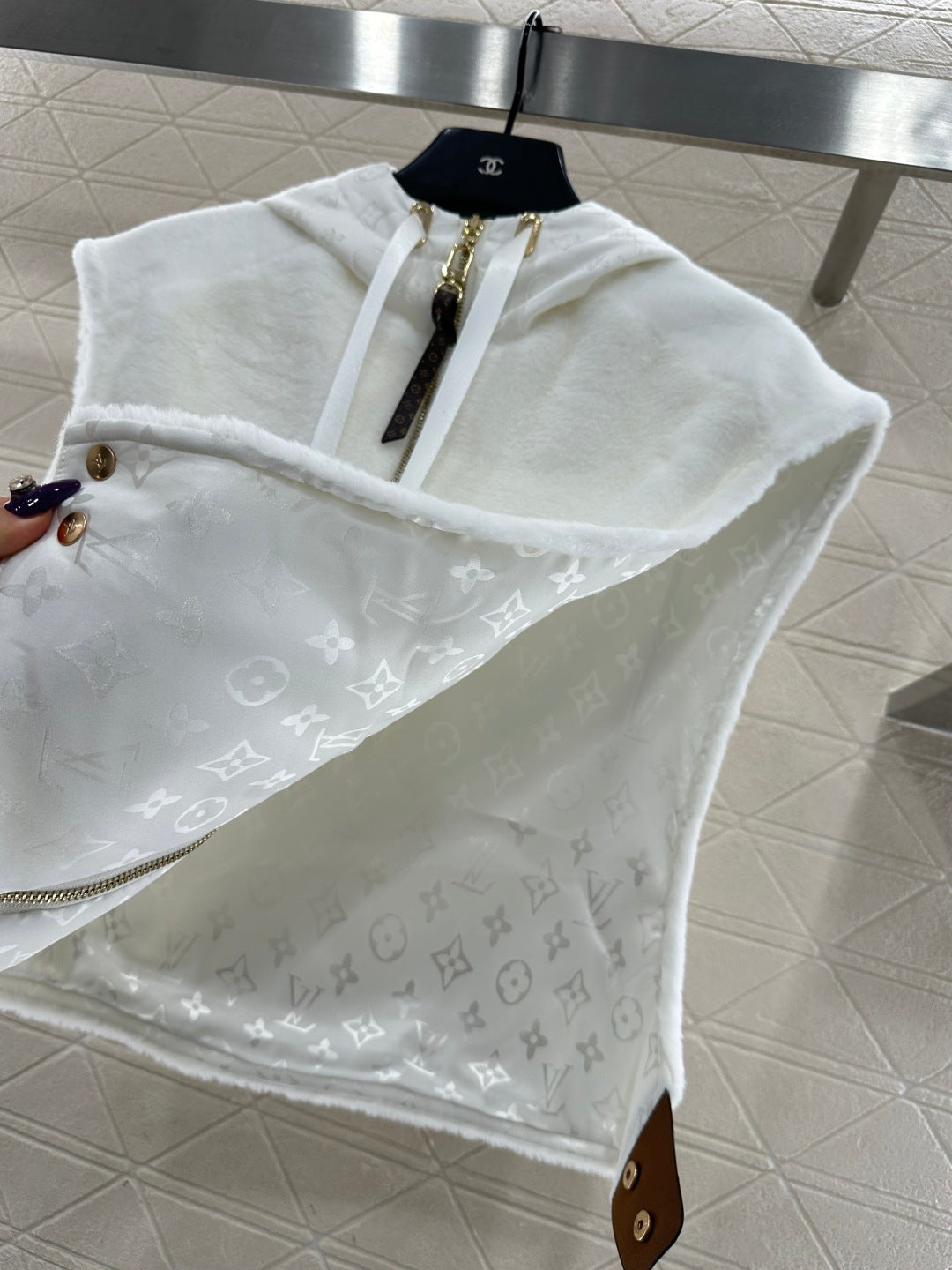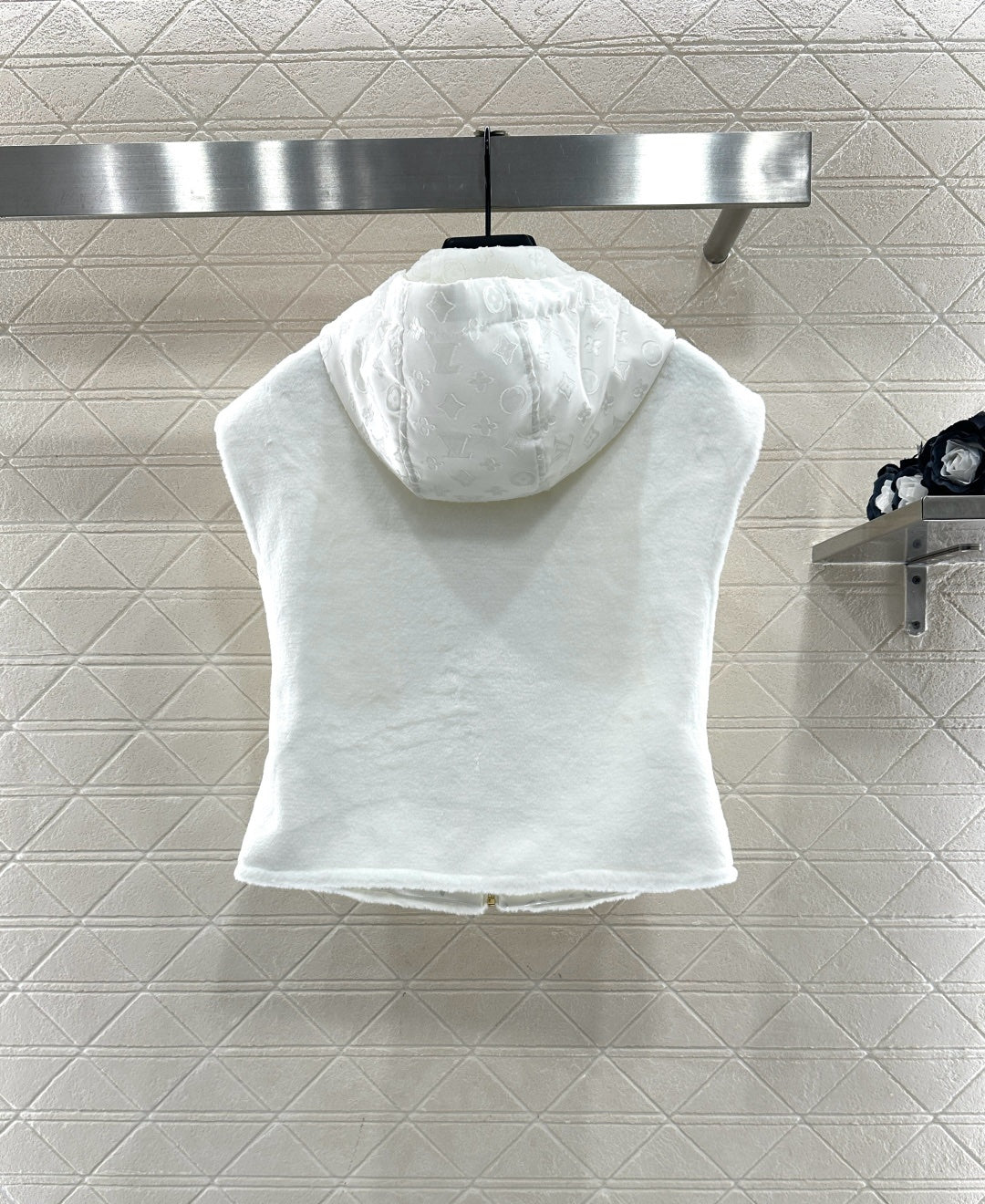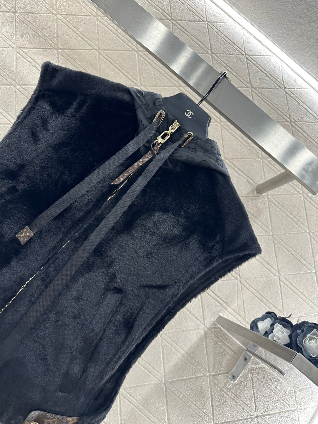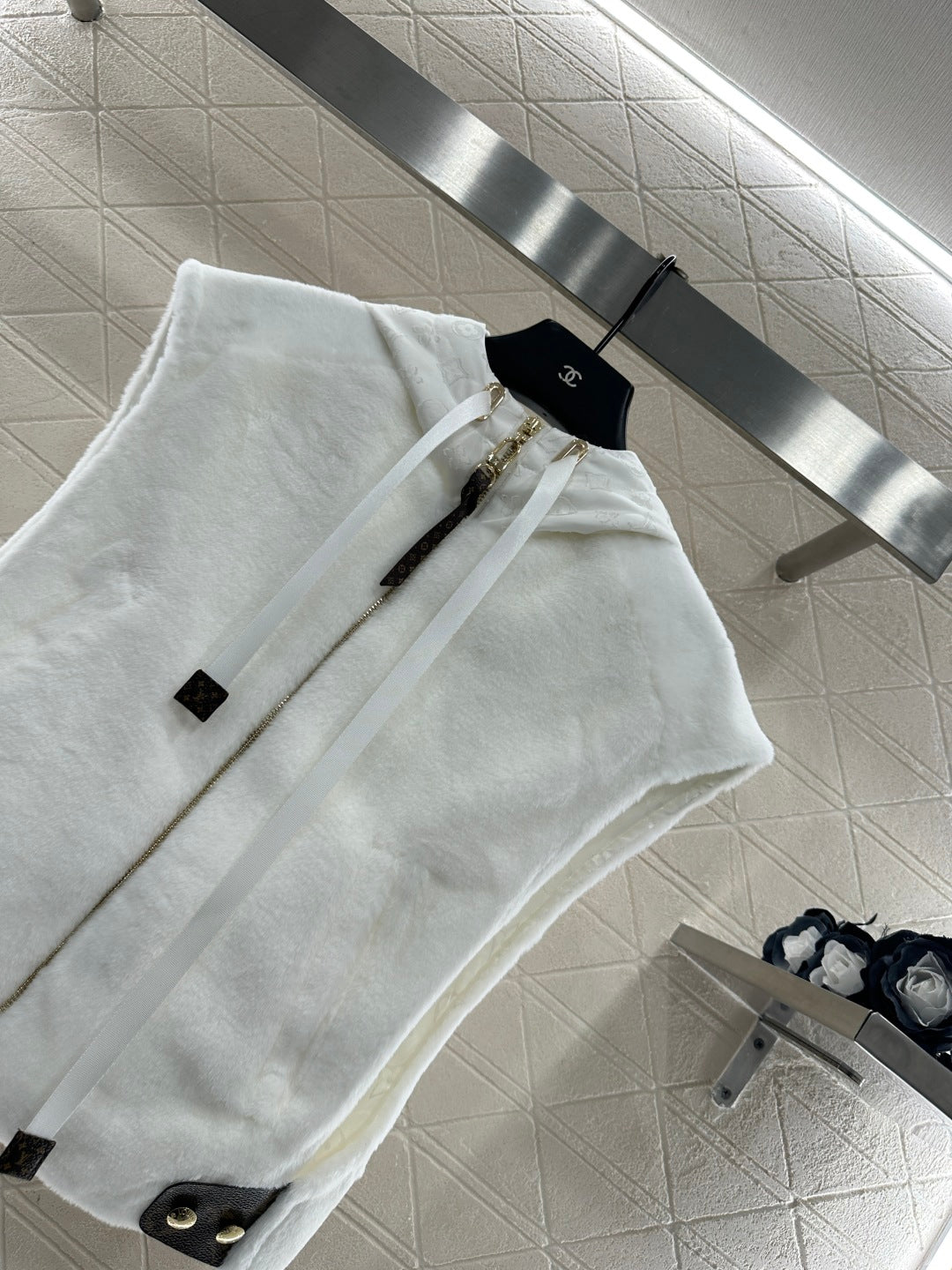 Short plush material, glossy texture, soft and skin friendly, hooded zipper vest style, versatile and plain color, zipper leather buckle decorated with four leaf clover elements and letter logos, highlighting the brand's low-key luxury tone, adjustable slit design, iconic leather buckle on both sides of the waist fixed with buttons, echoing the hidden patterns inside, fashionable and stylish, doubling the effect of autumn and winter layering