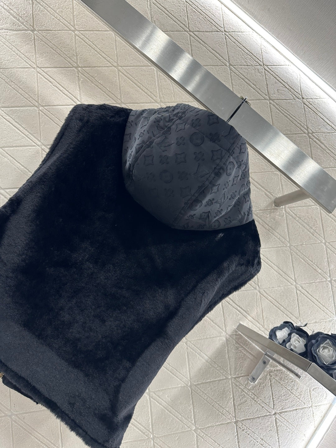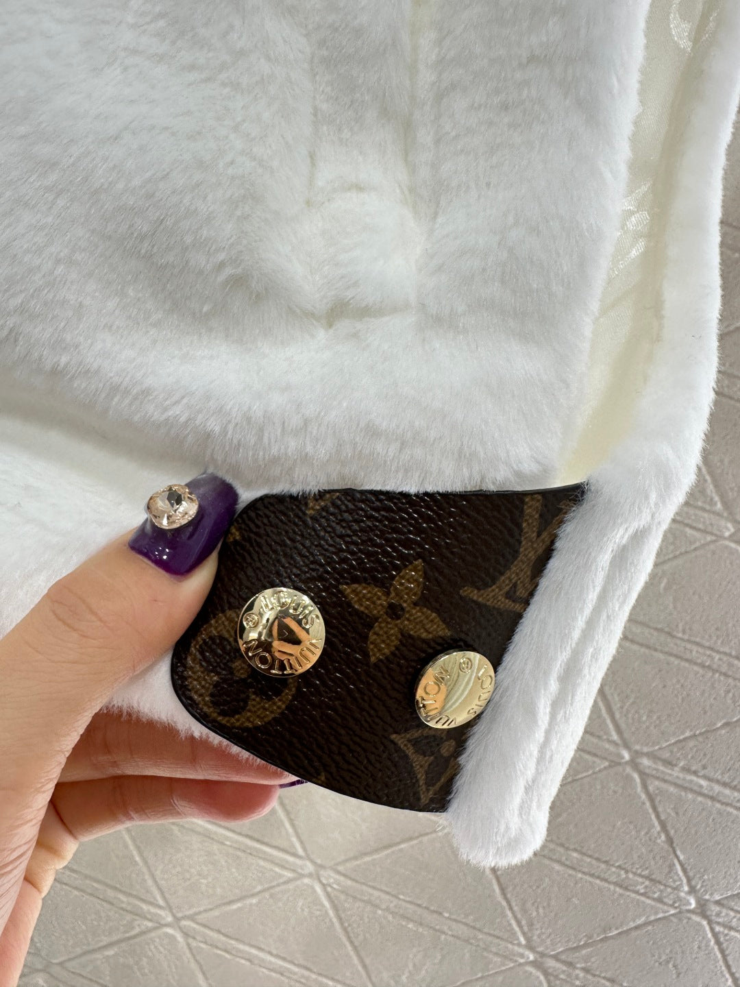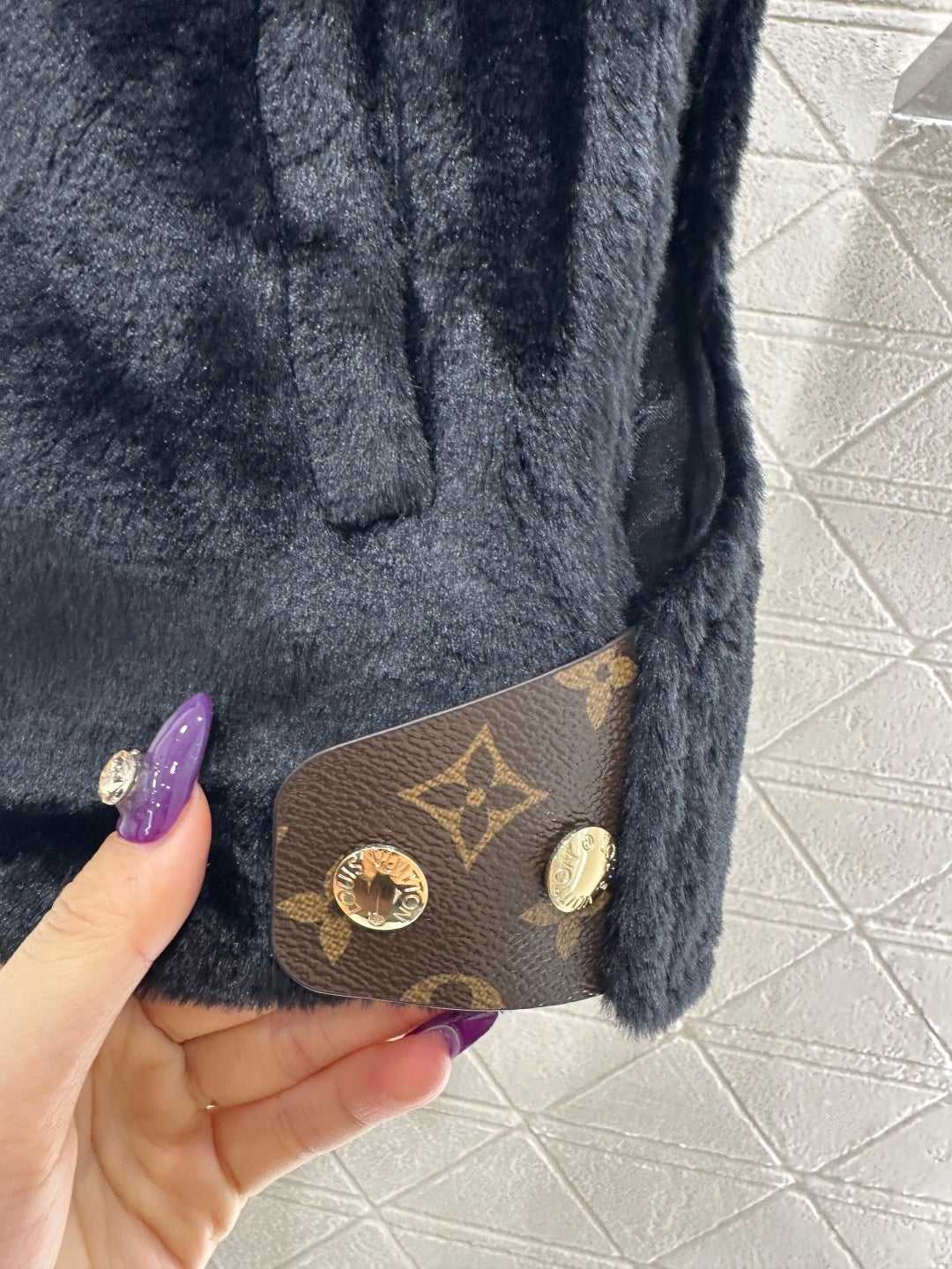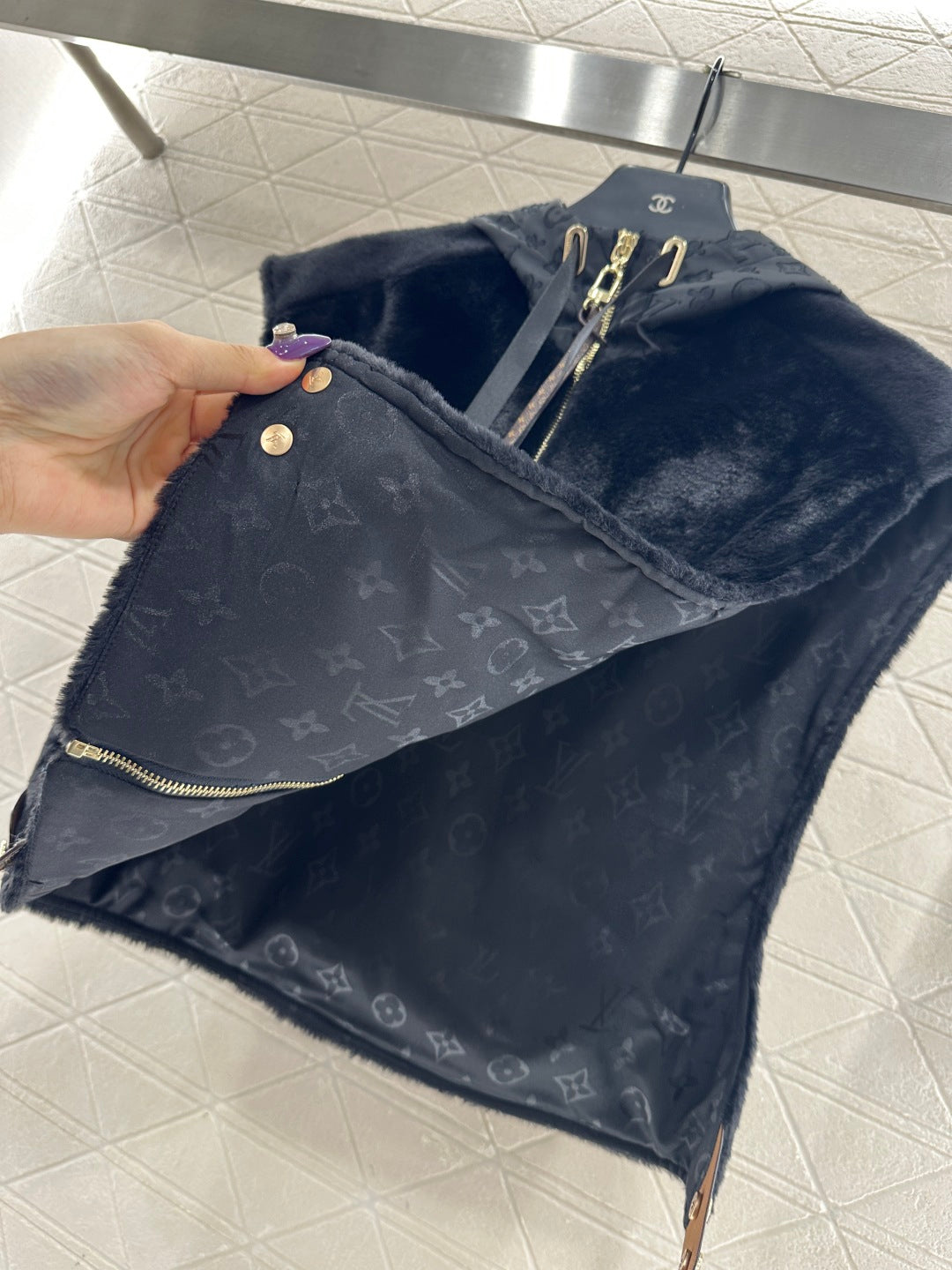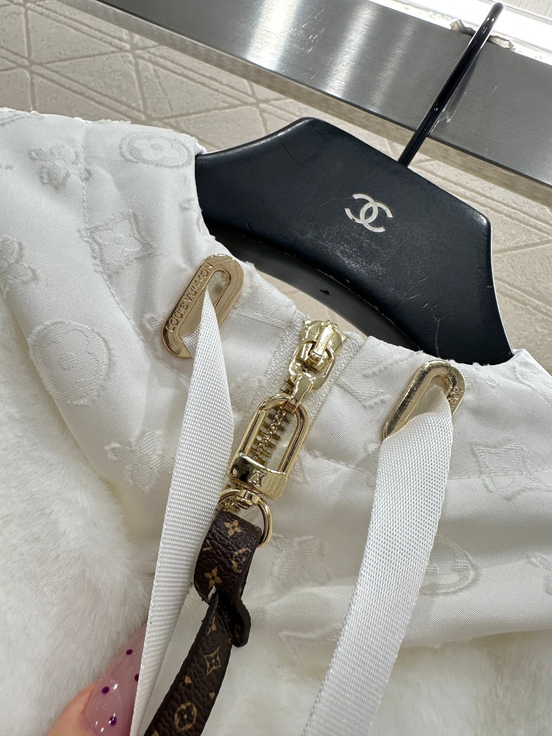 Short plush material, glossy texture, soft and skin friendly, hooded zipper vest style, versatile and plain color, zipper leather buckle decorated with four leaf clover elements and letter logos, highlighting the brand's low-key luxury tone, adjustable slit design, iconic leather buckle on both sides of the waist fixed with buttons, echoing the hidden patterns inside, fashionable and stylish, doubling the effect of autumn and winter layering