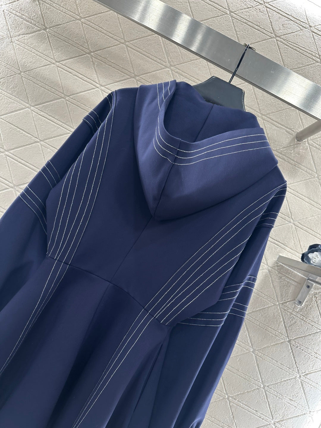 Made of 100% cotton, this dress boasts a luxurious feel and a stylish look. The hooded, zip-up design features a navy blue base accented with gold stitching, creating a sophisticated yet understated style. The adjustable zipper allows for versatile styling. The fitted waist instantly creates a flattering silhouette, making it a versatile piece that can be worn alone or as an outer layer.