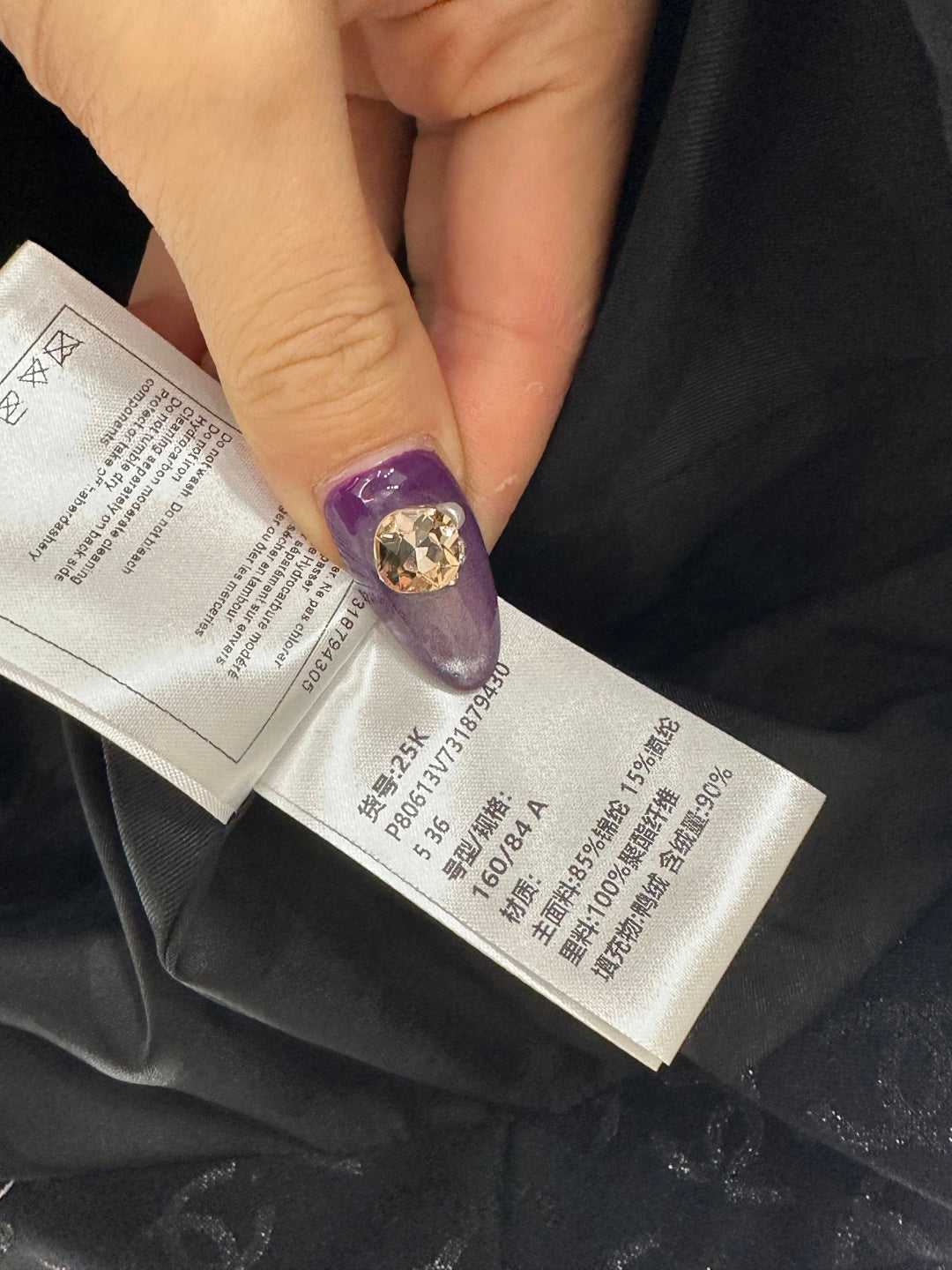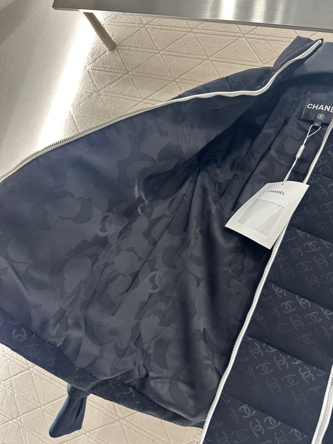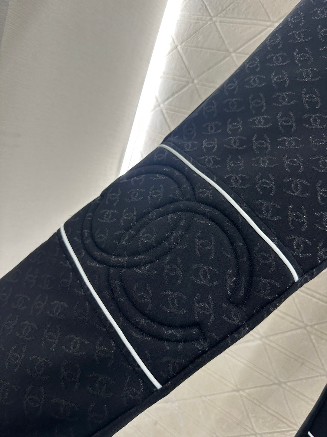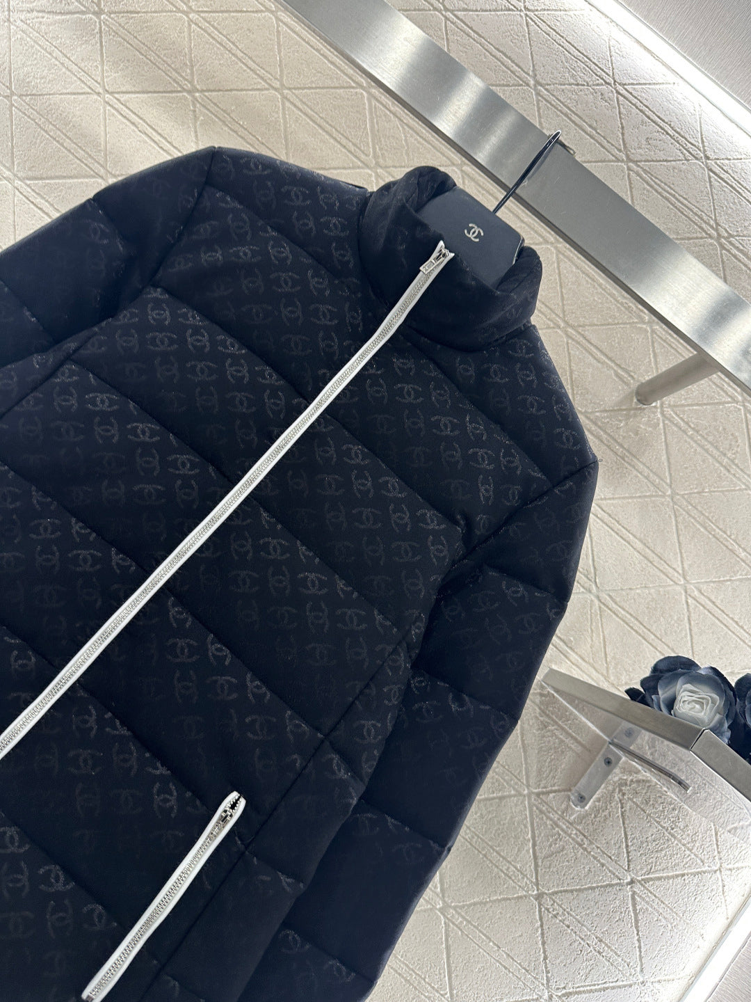 Jacquard material, down filled interior, lightweight and warm overall, stand up down jacket, comfortable and easy to wear without appearing bulky, paired with tightened cuffs for stronger wearability, classic rectangular grid texture, full body double C jacquard letters, open zipper and black and white contrasting body, full of jacquard dark patterns inside, presenting a high-end style and taste, matched with the same series of down straight leg pants, jacquard reflective low-key luxury, knee horizontal white tie outline, double C large logo prominent, the set of upper body combines warmth and fashion, the first choice for autumn and winter layering