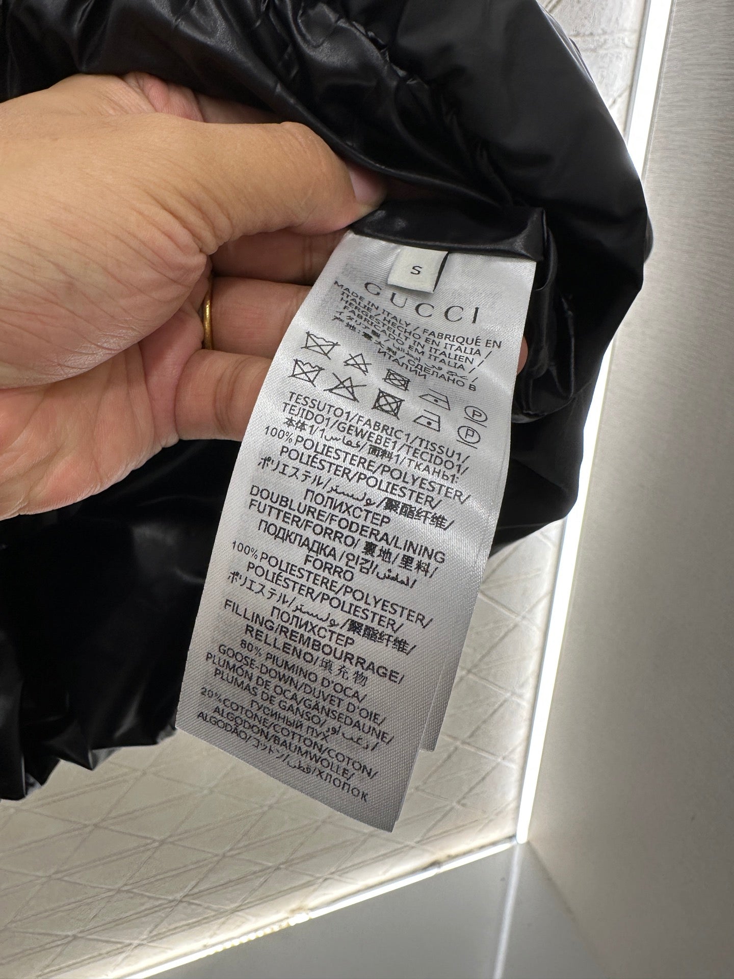 Jacquard material, down filled interior, rectangular embossed pattern, fully covered with double G brown yellow jacquard dark pattern, the whole piece is lightweight and warm, threaded collar ➕ The cuffs are wrapped with elastic threads, showcasing the brand concept in detail. The loose waistband style is inclusive and fashionable, with a drawstring at the waist outlining the contour curves and proportions, giving the upper body a stylish and stylish look.