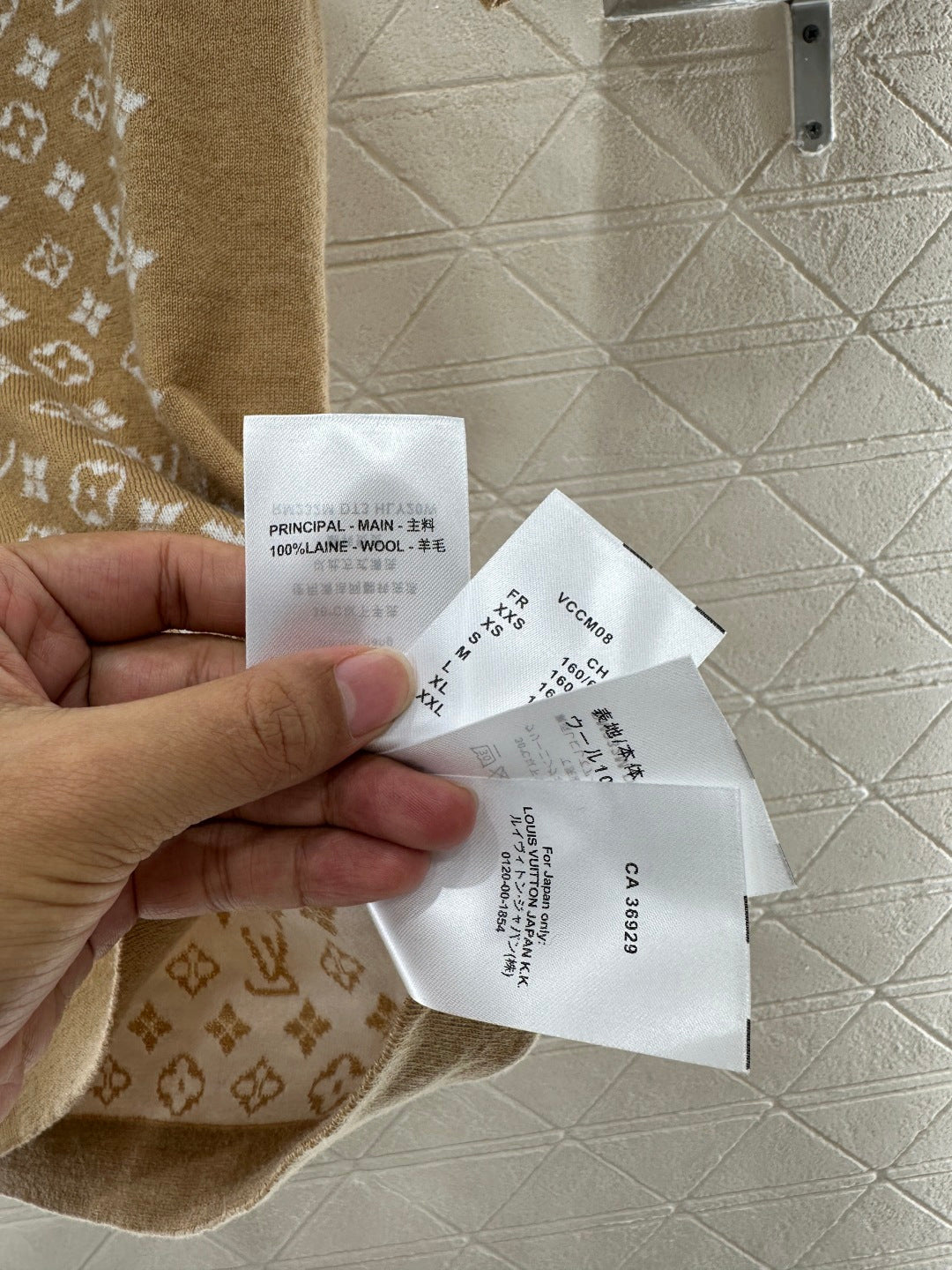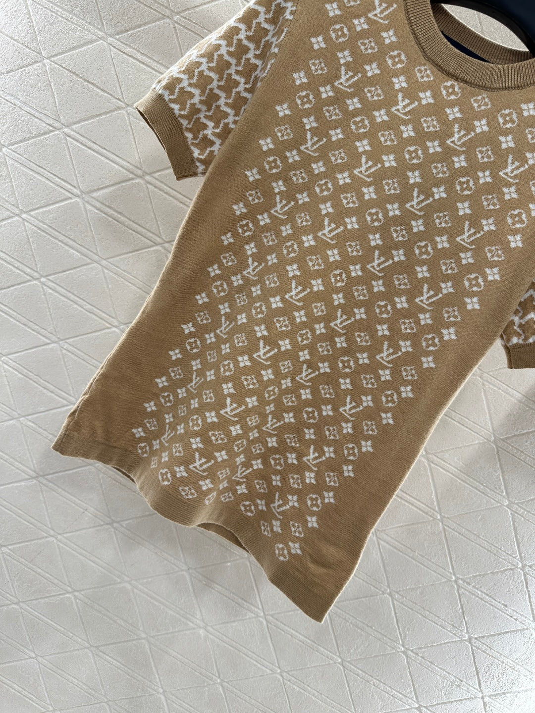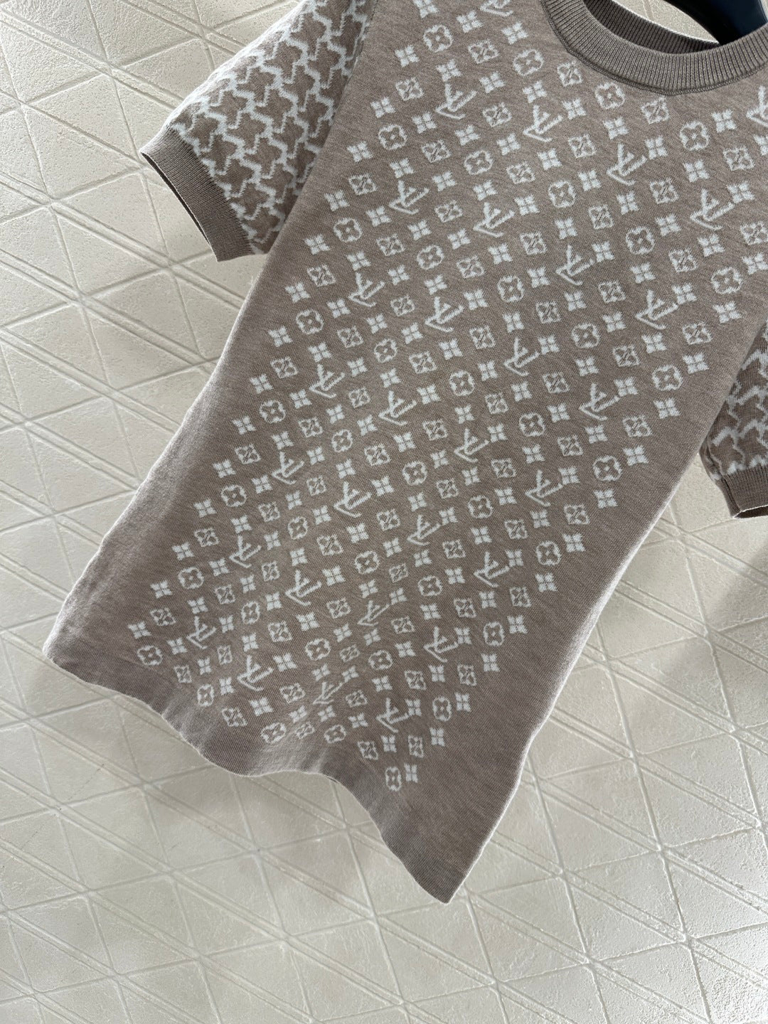 Wool knit material, premium texture, comfortable and soft, round neck knitted short sleeved sweater cut, collar and cuffs threaded edging to match the hem, body contour plain color ➕ The interior is covered with four leaf clover and letter logo patterns, forming a color contrast with the houndstooth pattern on the sleeve arms. It exudes a strong sense of luxury and showcases the brand's tone. The wool knitted fabric is warm and comfortable, with a regular style and a simple and versatile design for autumn and winter daily use