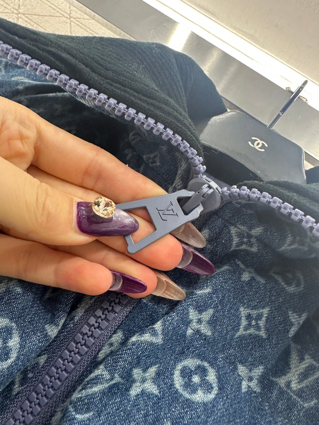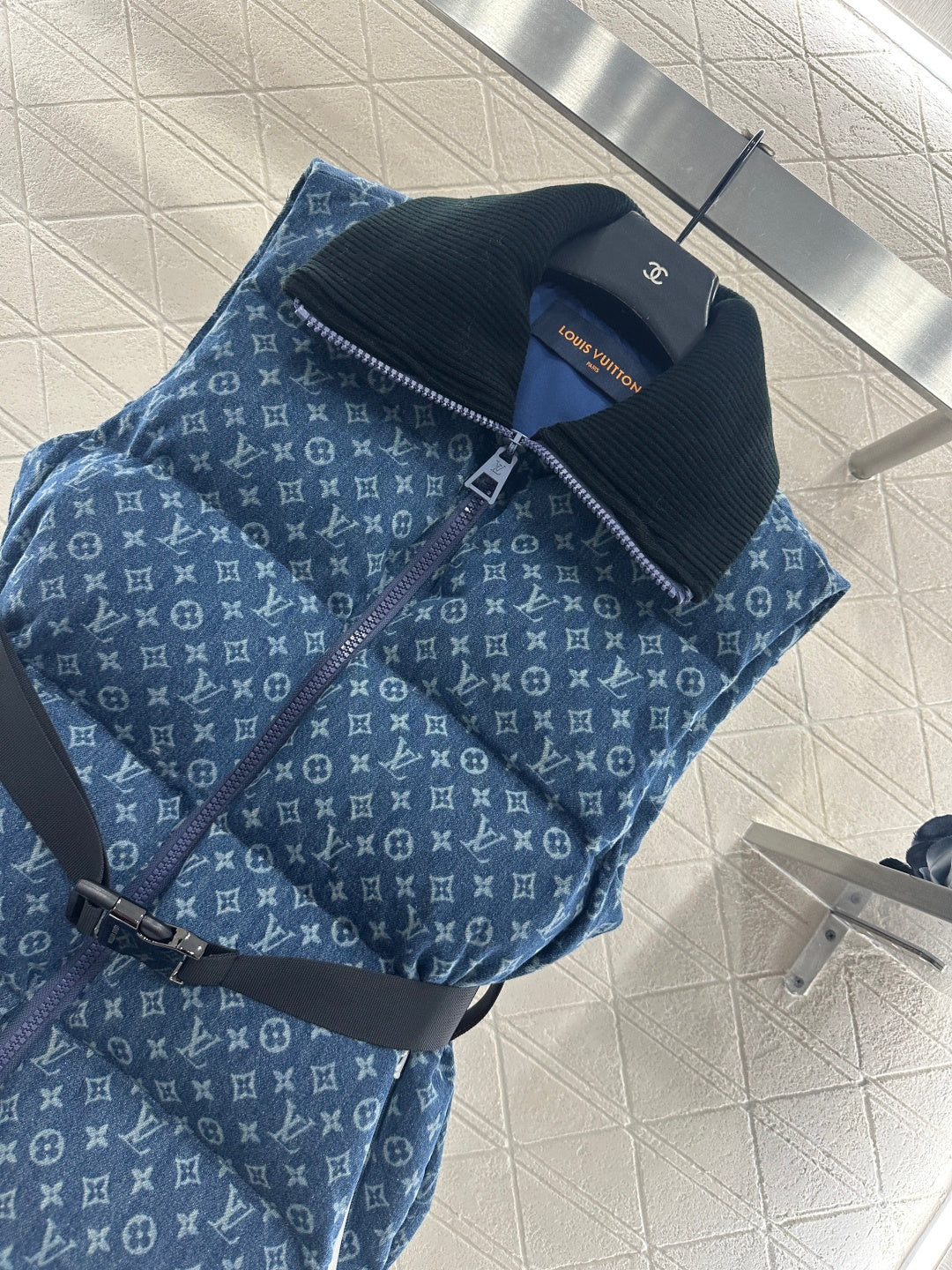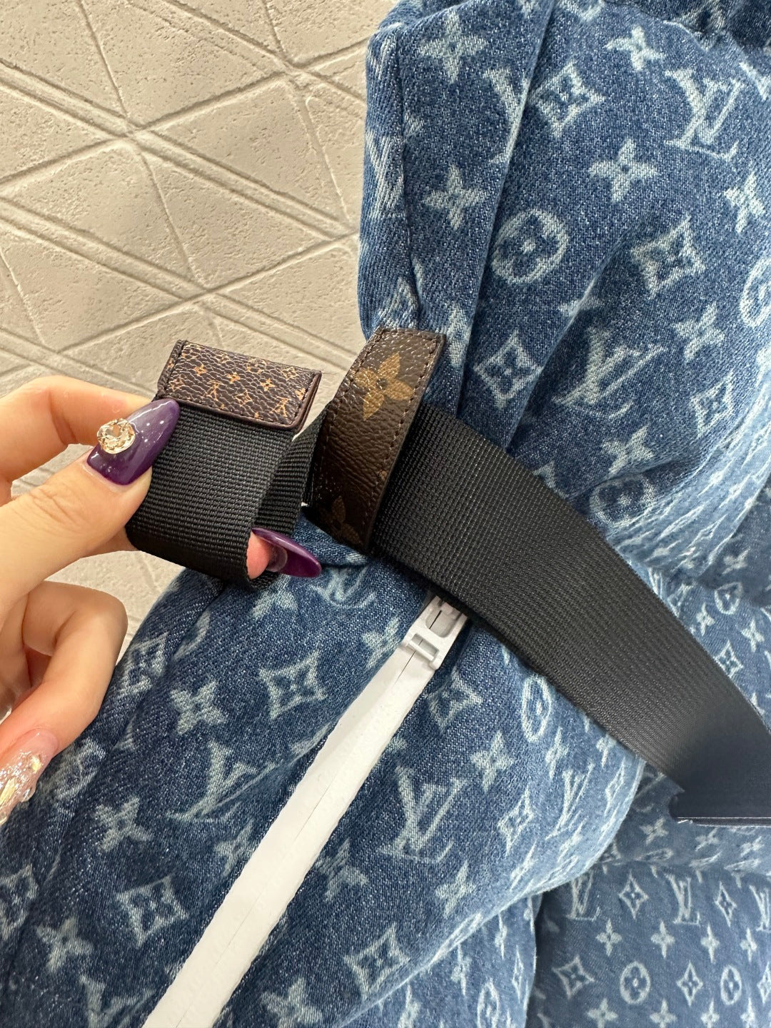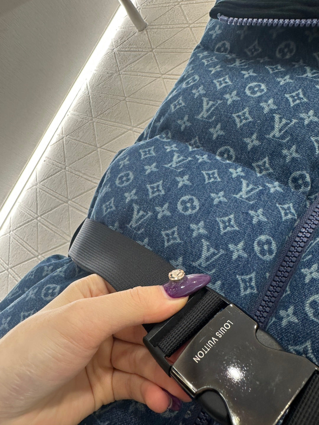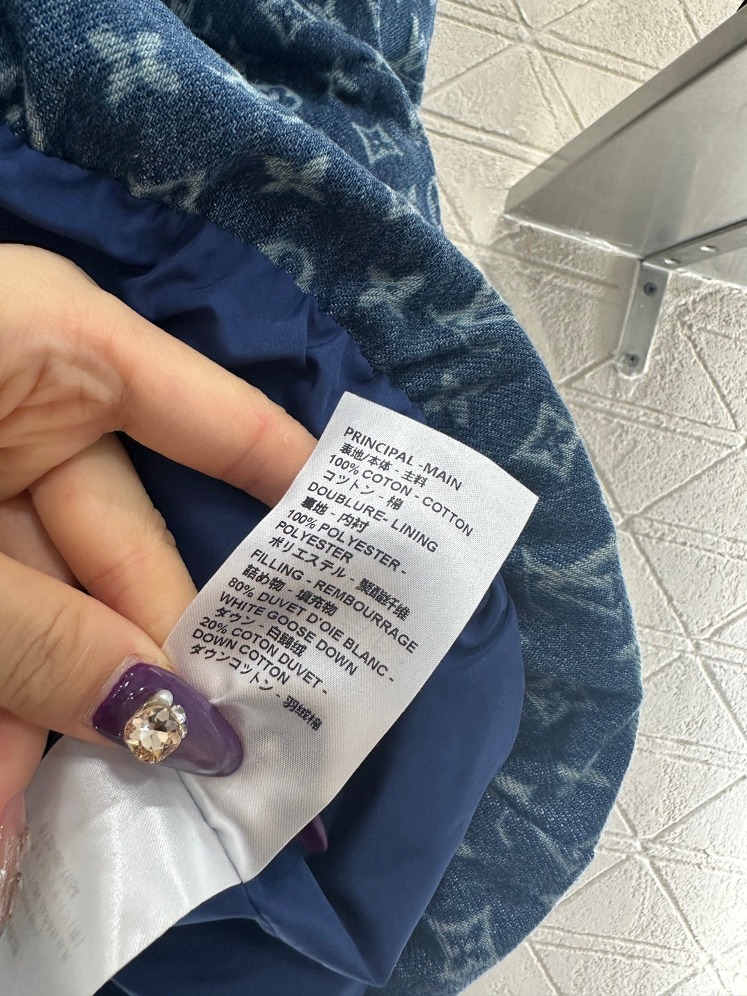 Twill cotton denim material, filled with down cotton lining, the whole piece is lightweight and warm, the collar is tightened with knitted vertical groove threads, the zipper vest is designed, and the whole body is made of refreshing denim light blue ➕ The four leaf clover letter logo jacquard is fully spread, breaking the dullness of autumn and winter, with a unique windproof and cold proof effect. The white zipper pocket is highlighted, and the elastic buckle waistband is outlined. The brown leather jacquard is decorated at the end and perforation position, with a firm and high-end style. It is not picky about style and figure, and can be paired with skirts and pants to show a fashionable high street style.